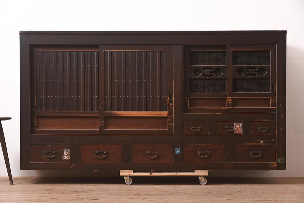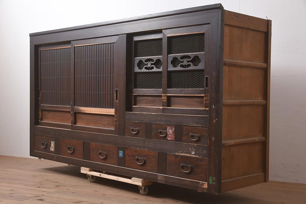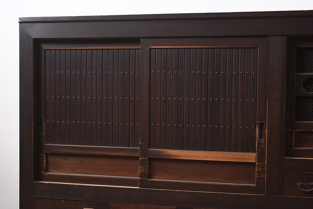 ラフジュ工房> キャビネット・戸棚> 食器棚・カップボード > アンティーク家具 縦桟引き戸の近江水屋箪笥テレビ台(キャビネット、戸棚、収納棚、サイドボード、食器棚)(R-036353)