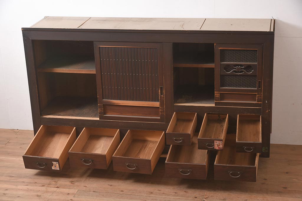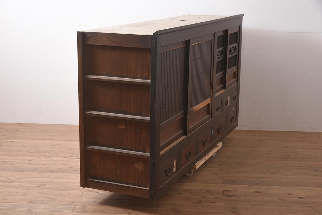ラフジュ工房> キャビネット・戸棚> テレビ台・ローボード > アンティーク家具 縦桟引き戸の近江水屋箪笥テレビ台(キャビネット、戸棚、収納棚、サイドボード、食器棚)(R-036353)