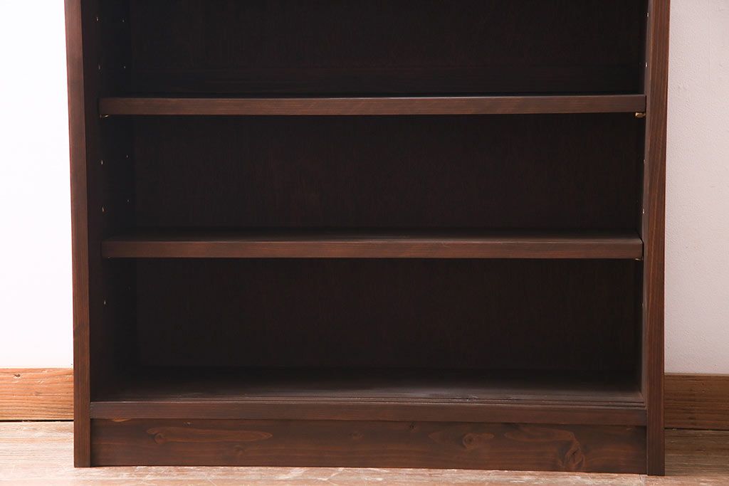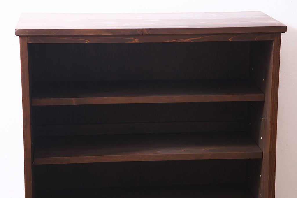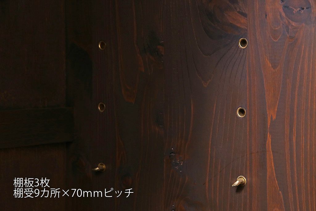 棚板は取り外しできます。棚板は3枚あります。棚受けは9ヶ所、70mmピッチで調整できます。棚幅サイズのものが1枚の作りです。