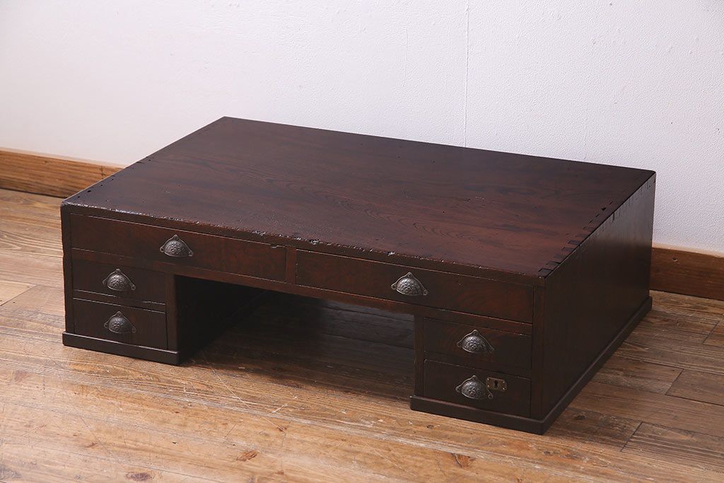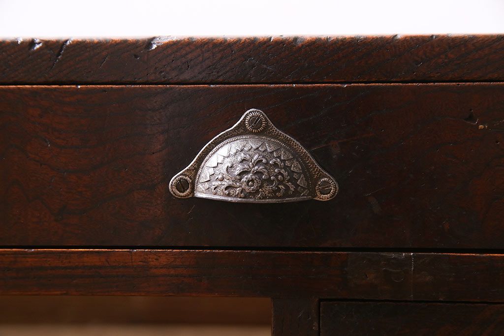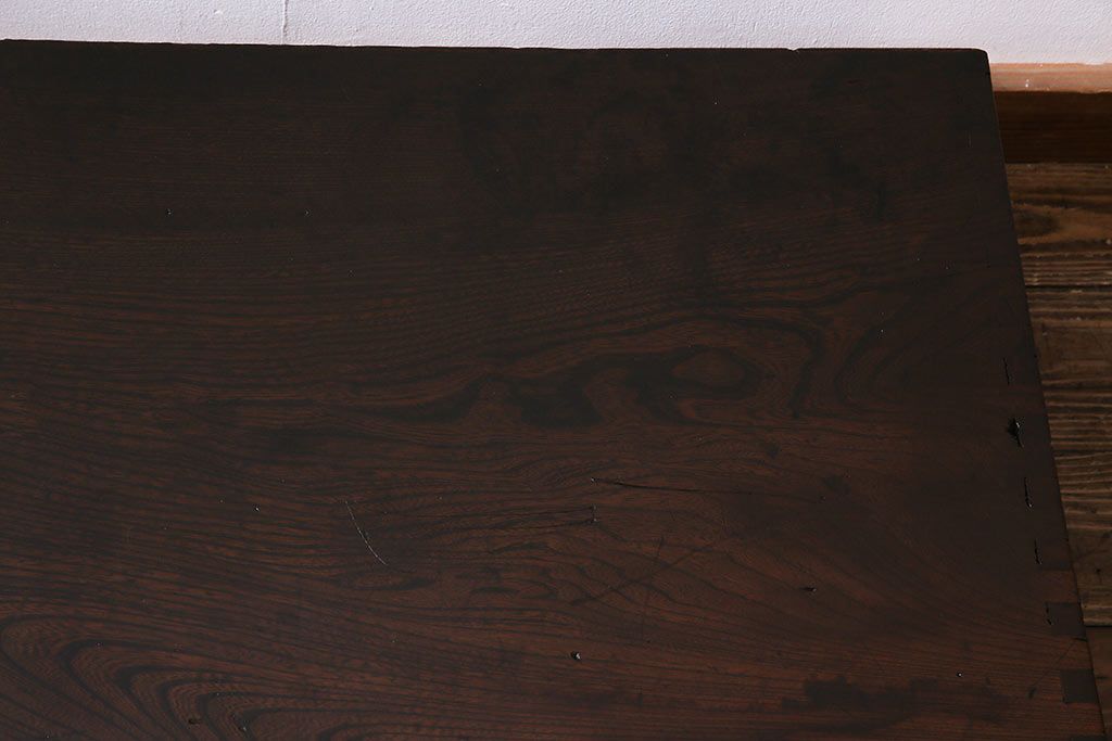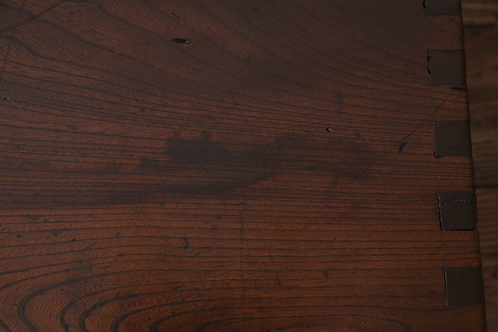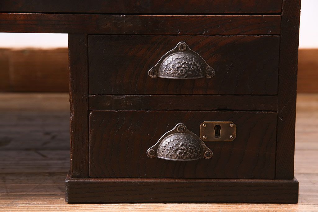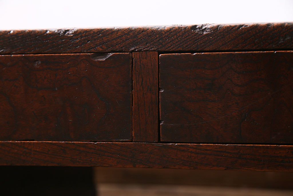 アンティーク家具 大正昭和初期 総ケヤキ材 天板に一枚板が贅沢に使われた両袖文机(両袖机、帳場机)(R-035827)