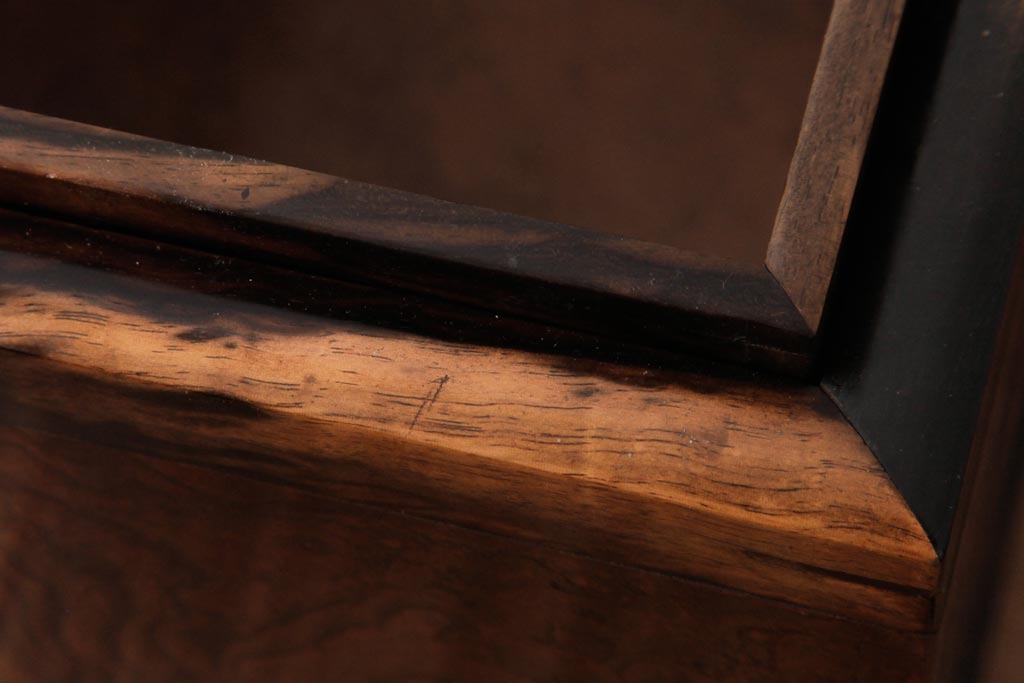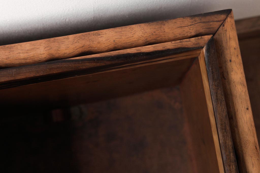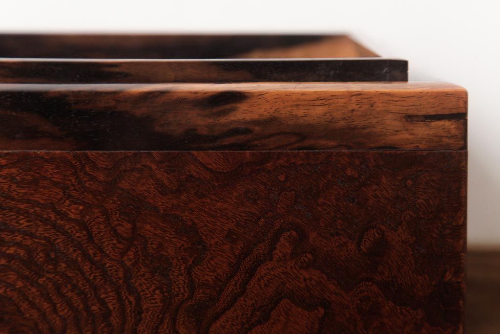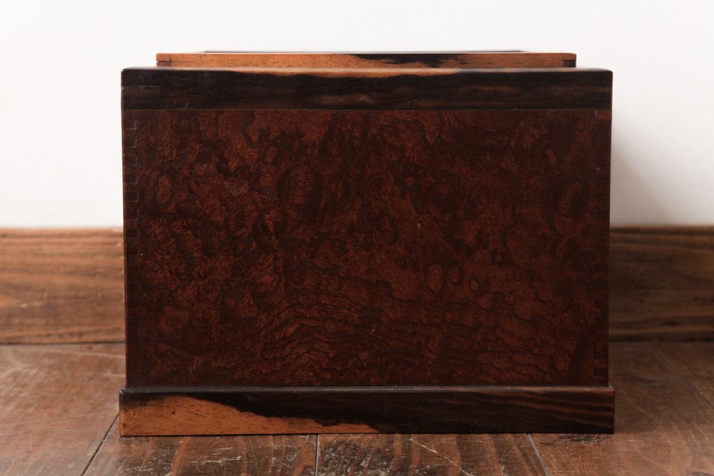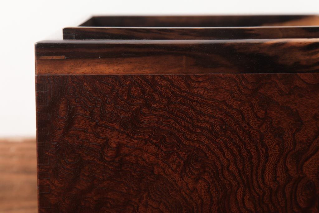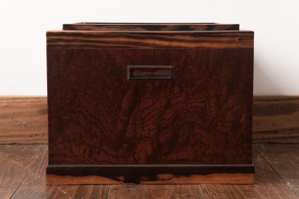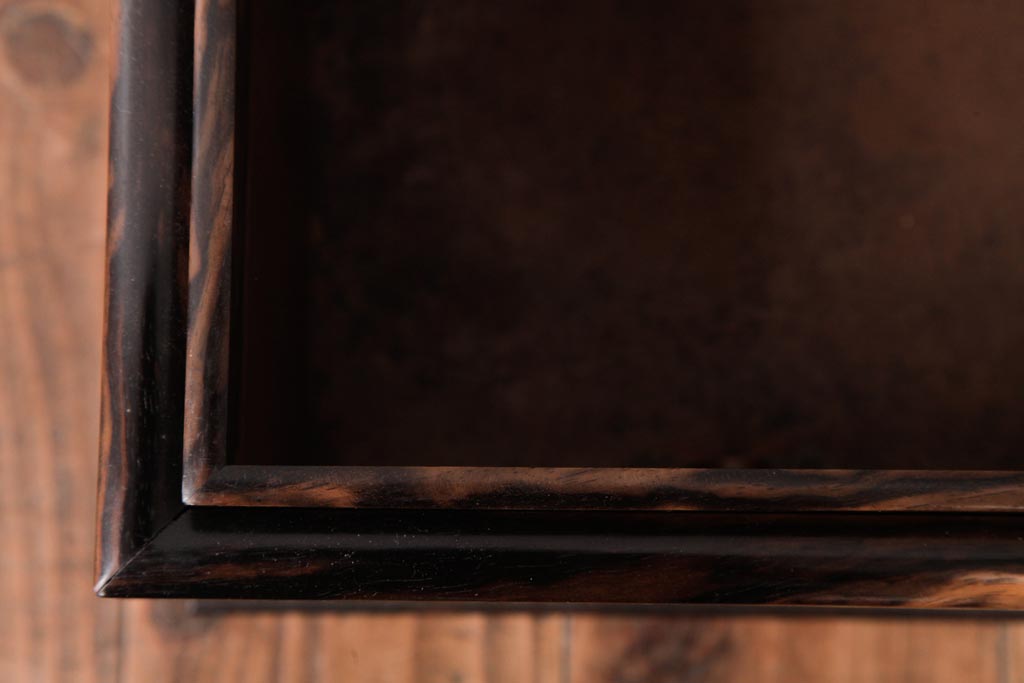 火鉢> 木製火鉢 > アンティーク雑貨 指物家具 漆塗り ケヤキ材 黒柿の縁がポイントの角火鉢(木製火鉢、箱火鉢)(R-037412)