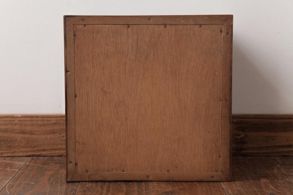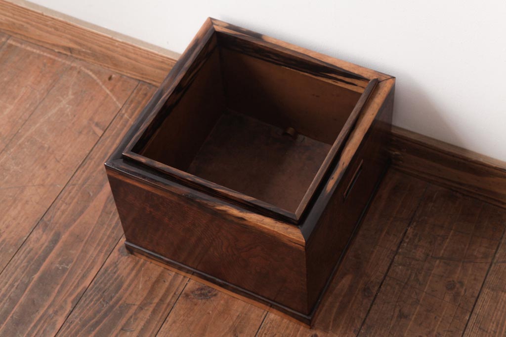 アンティーク雑貨 指物家具 漆塗り ケヤキ材 黒柿の縁がポイントの角火鉢(木製火鉢、箱火鉢)(R-037412)