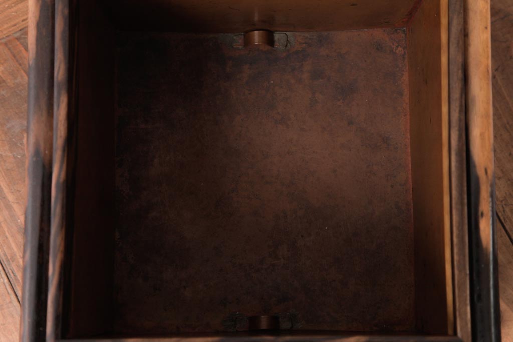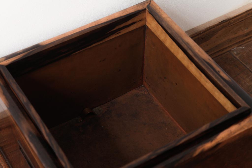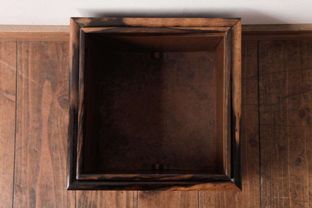 アンティーク雑貨 指物家具 漆塗り ケヤキ材 黒柿の縁がポイントの角火鉢(木製火鉢、箱火鉢)(R-037412)です。