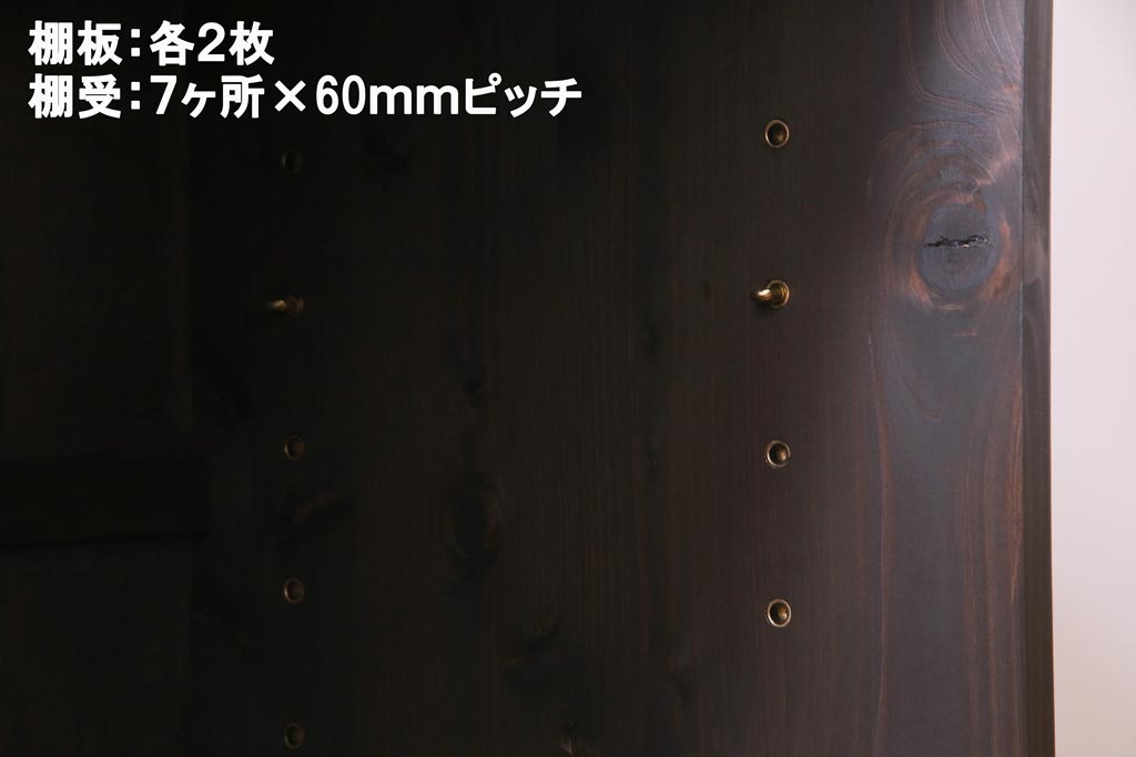 棚板は取り外しできます。棚板は左右各2枚あります。棚受けは7ヶ所、60mmピッチで調整できます。棚幅サイズのものが1枚の作りです。