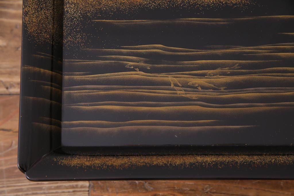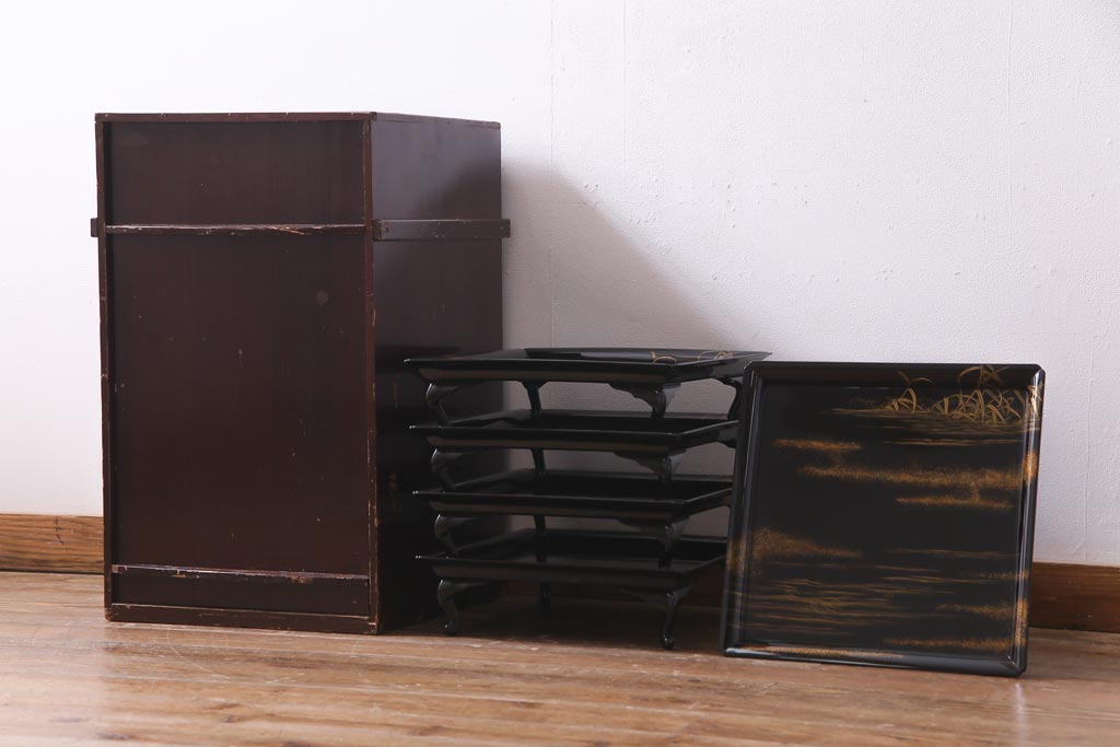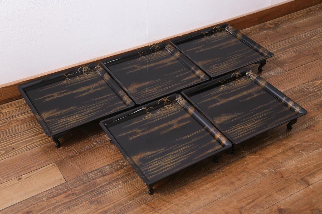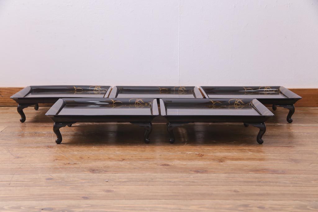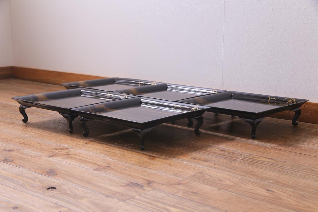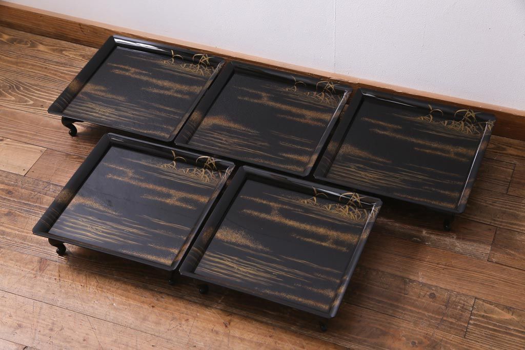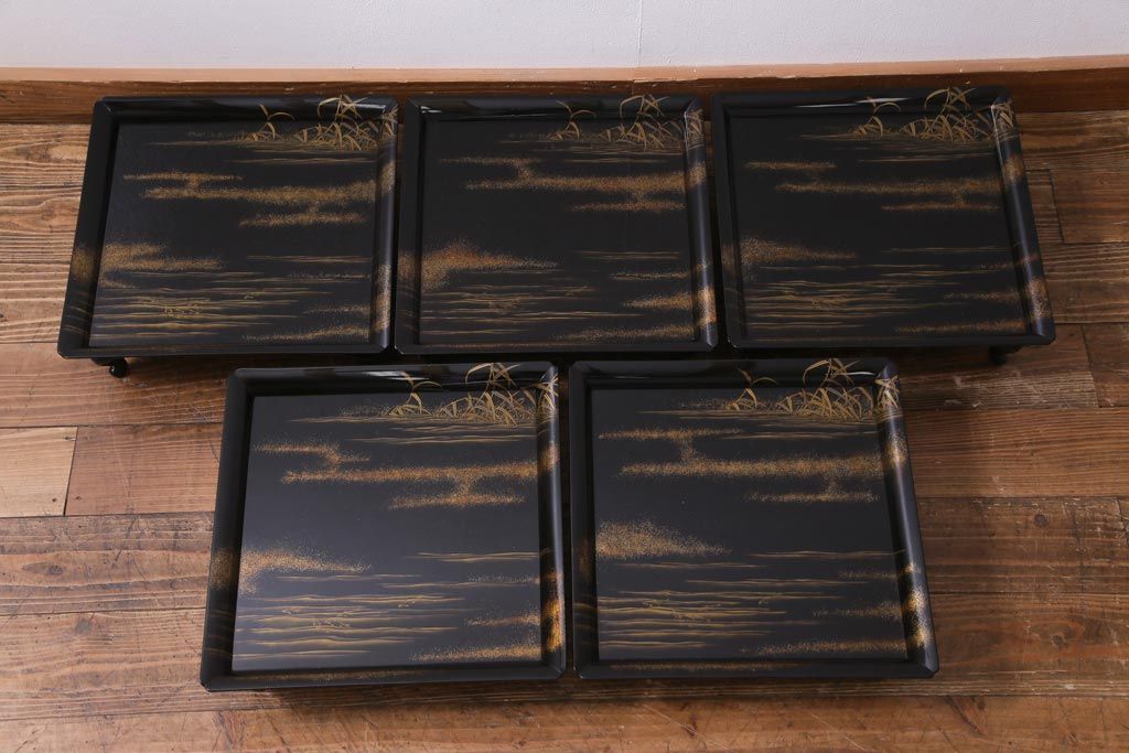 アンティーク雑貨 輪島塗 金蒔絵 鯉の図 木製お膳5客セット(漆器、脚付膳、和食器)(R-036277)