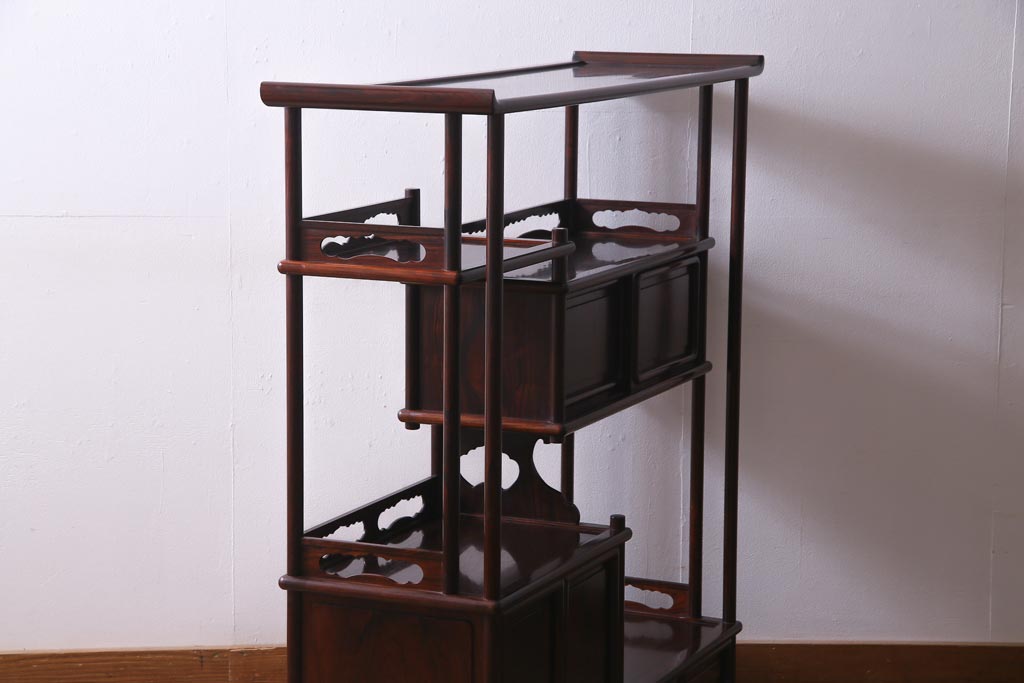 和箪笥> 茶箪笥・茶棚 > 中古 伝統工芸品 大阪唐木指物 在銘 紫檀(シタン)材 漆塗り 飾り棚(違い棚、茶棚)(定価約220万円)(R-037461)