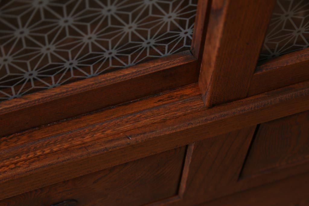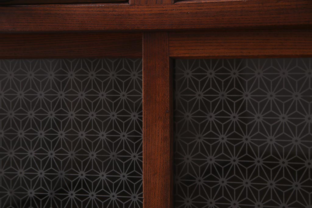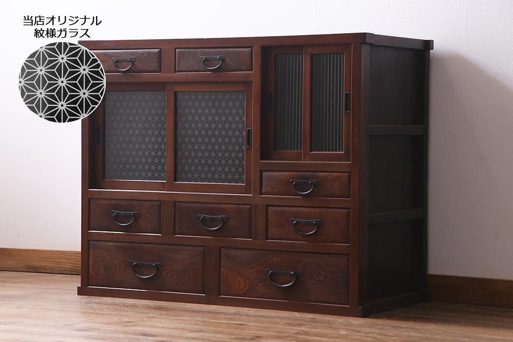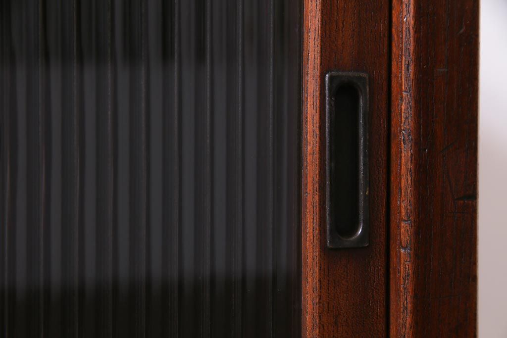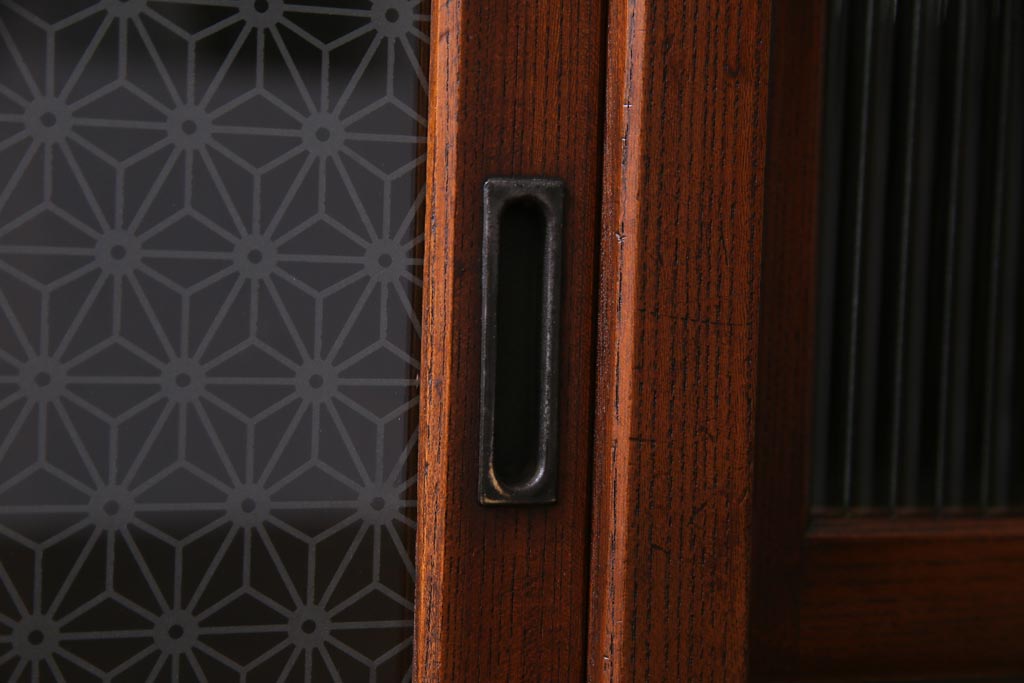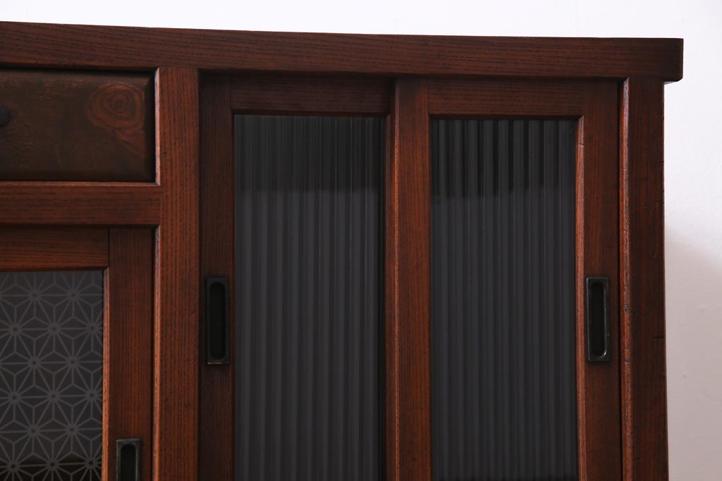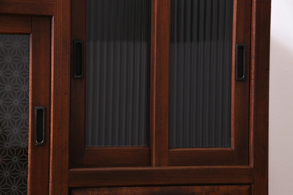 アンティーク家具 前面ケヤキ材 モールガラス・当店オリジナルガラス入り 杢目が目を引くキャビネット(収納棚、戸棚)(R-037434)