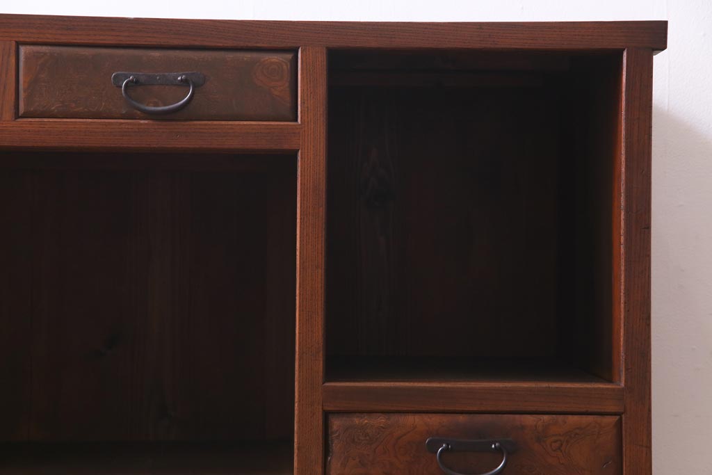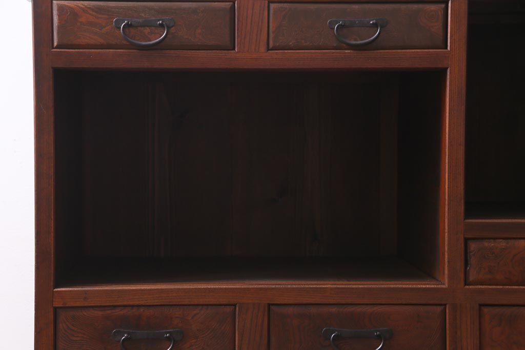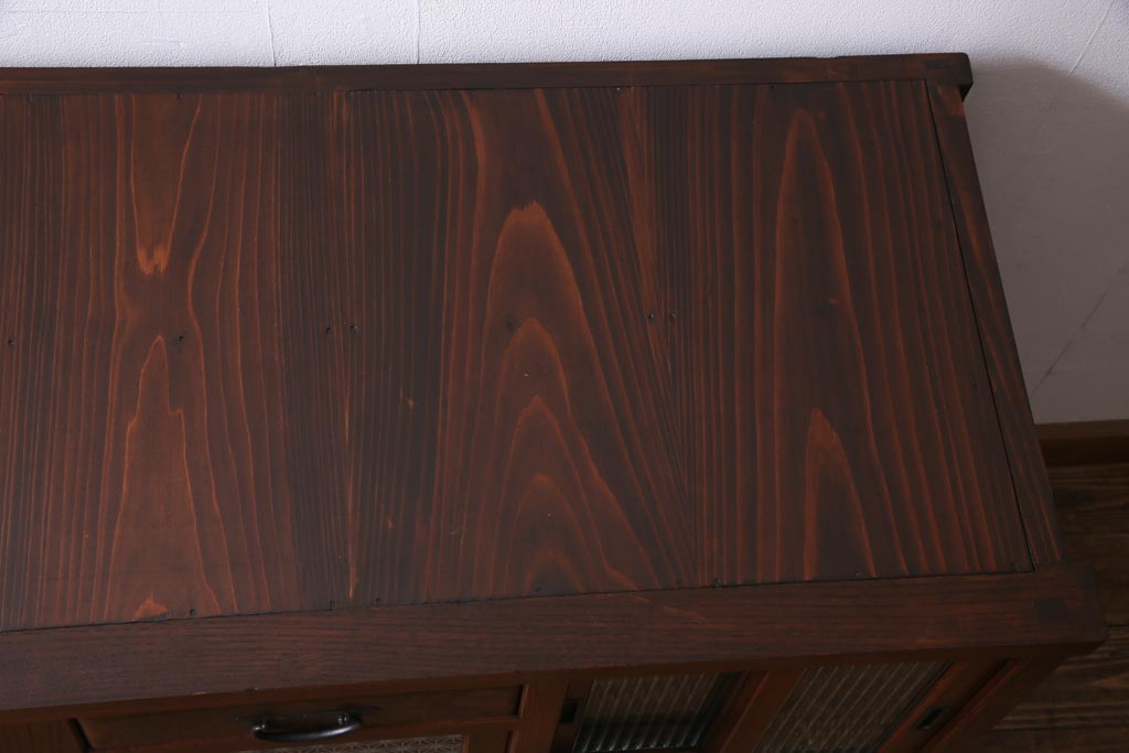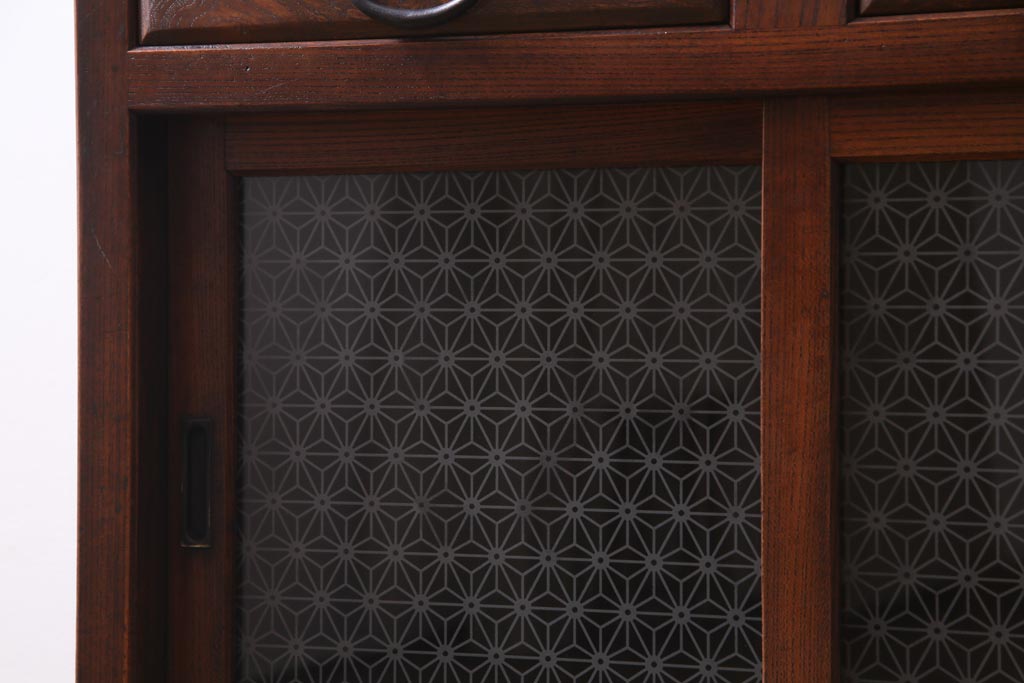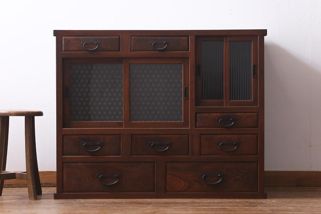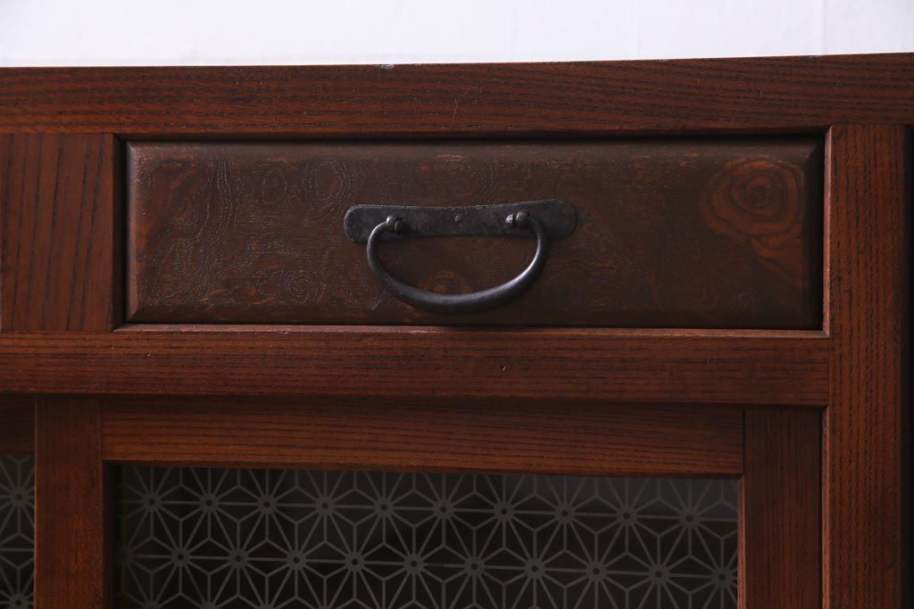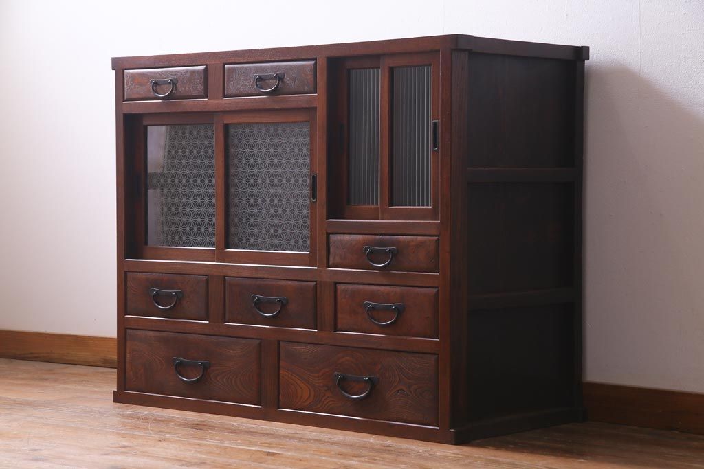 アンティーク家具 前面ケヤキ材 モールガラス・当店オリジナルガラス入り 杢目が目を引くキャビネット(収納棚、戸棚)(R-037434)