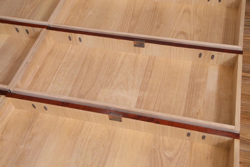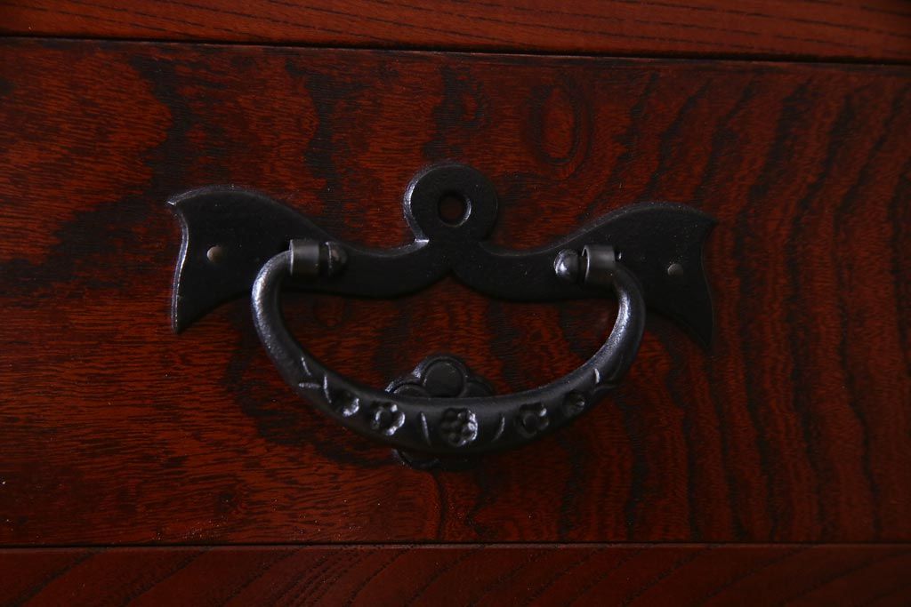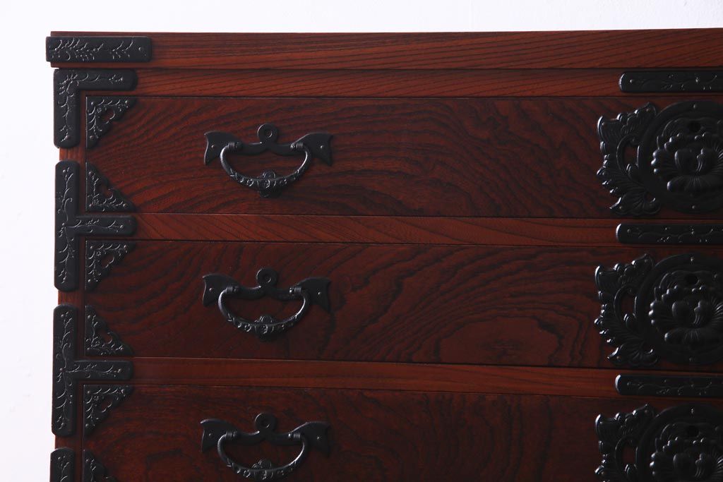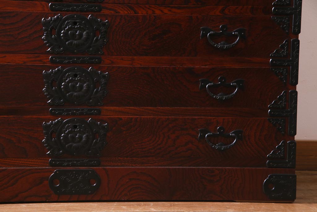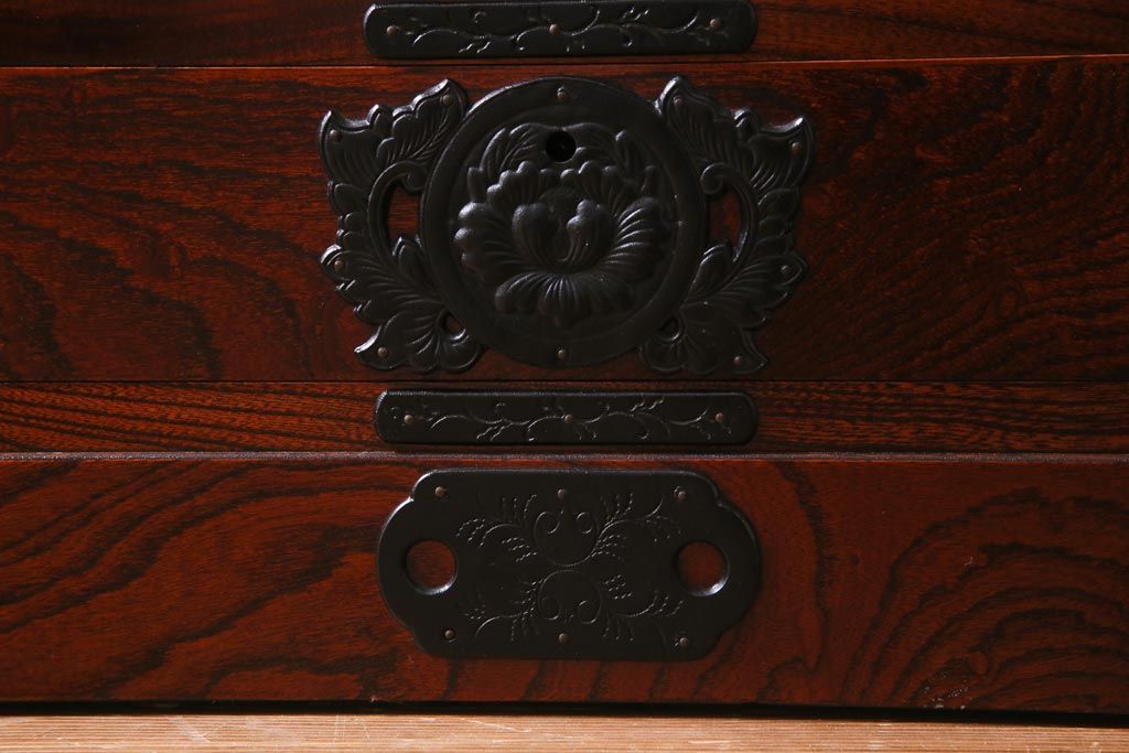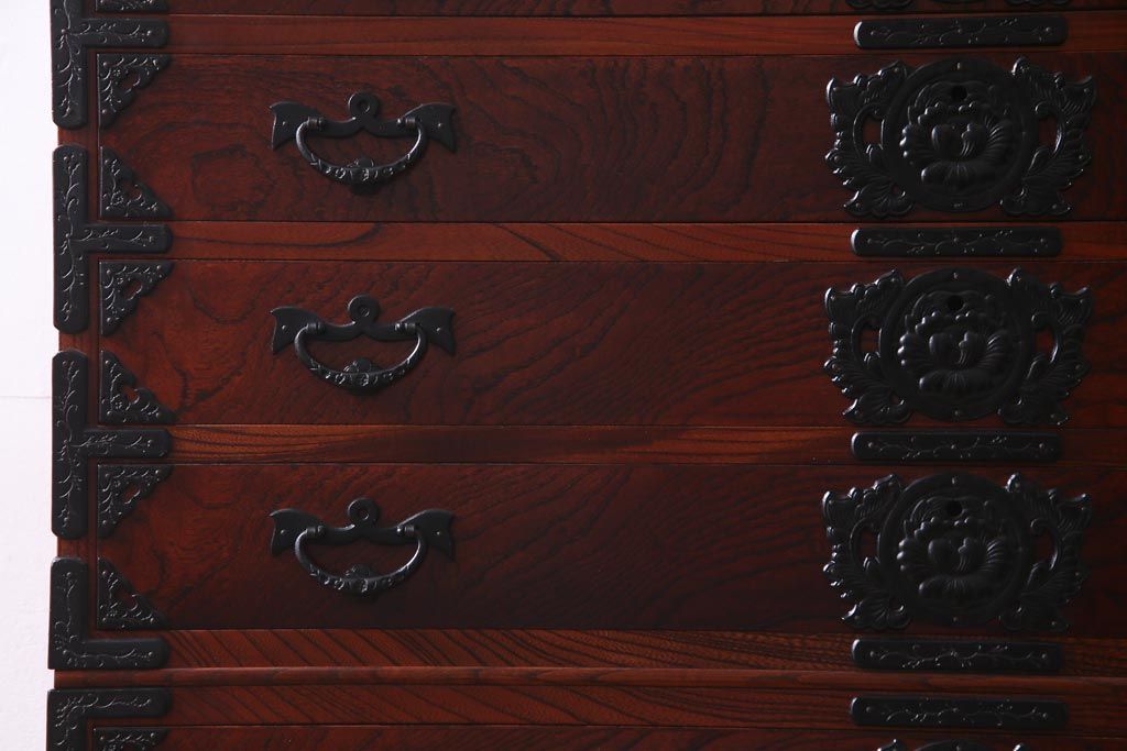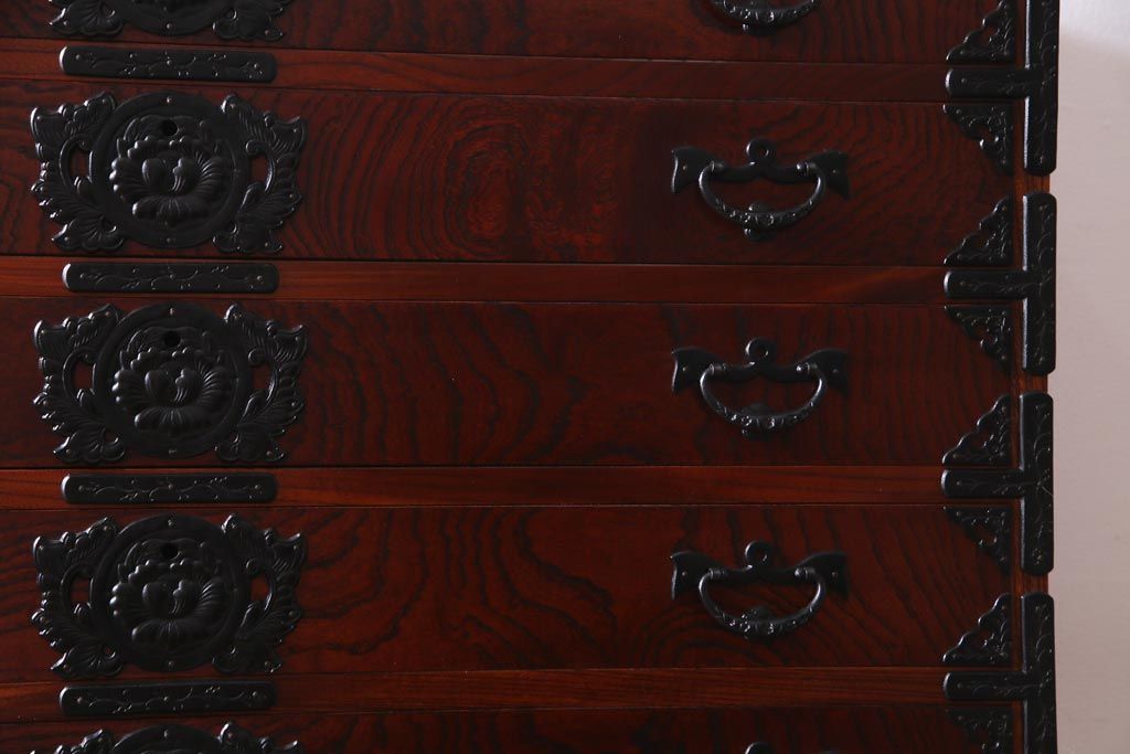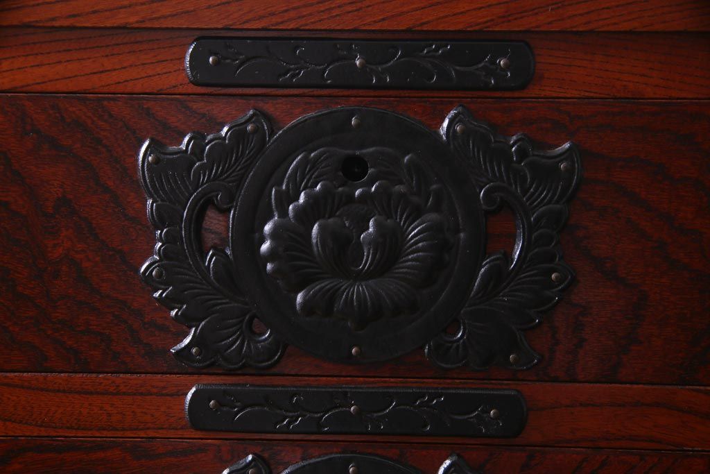 引き出しは10杯もついており、連なるような牡丹金具も圧巻。