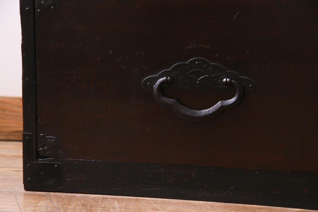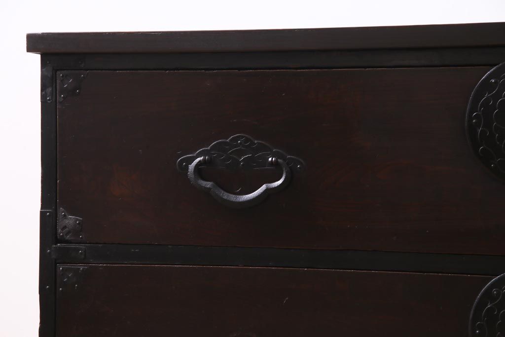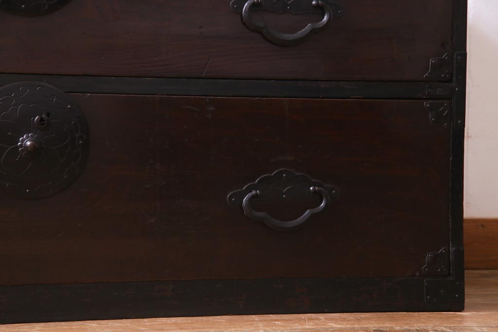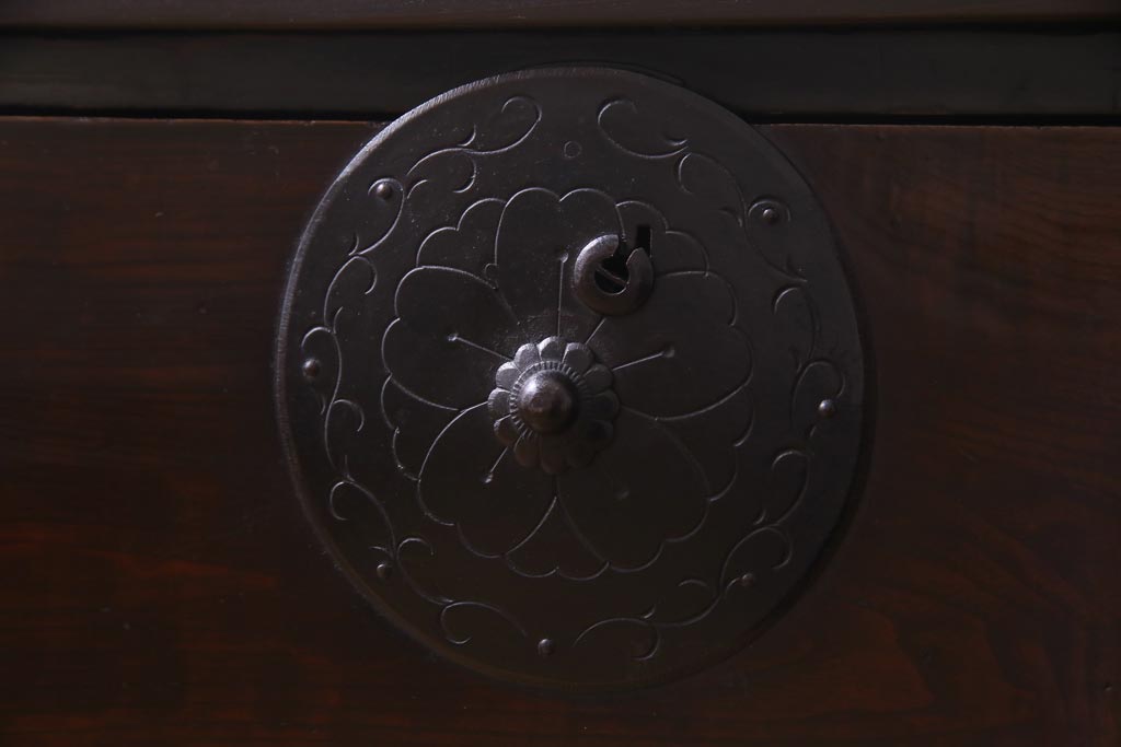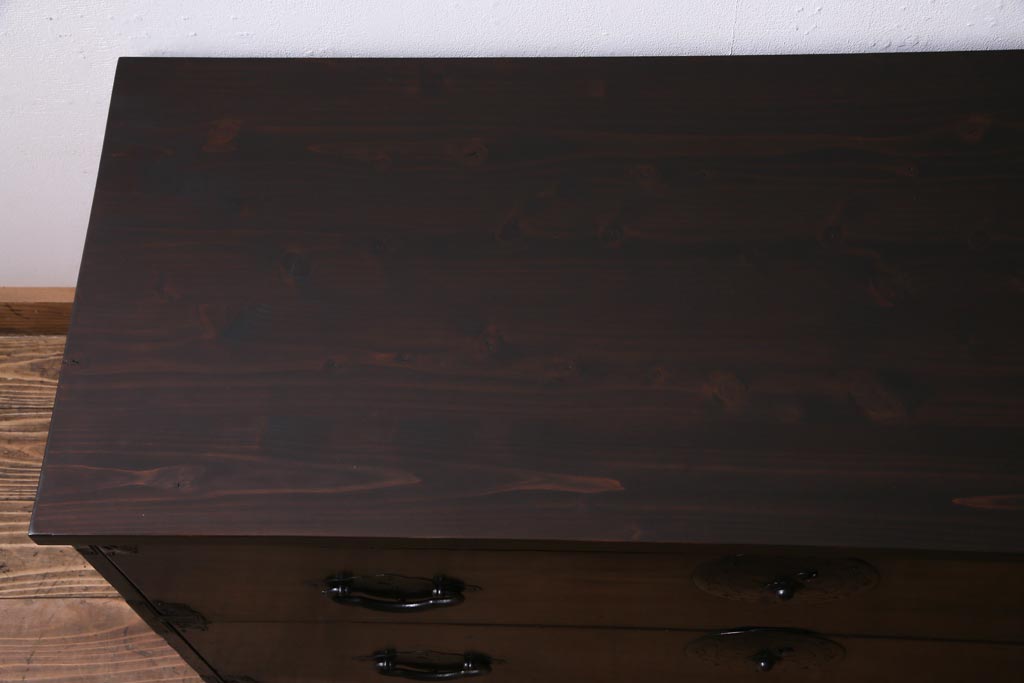 ラフジュ工房> 和箪笥 > アンティーク家具 明治期 前面栗材 天板リメイク 桜丸金具の米沢箪笥ローチェスト(引き出し)(R-037399)