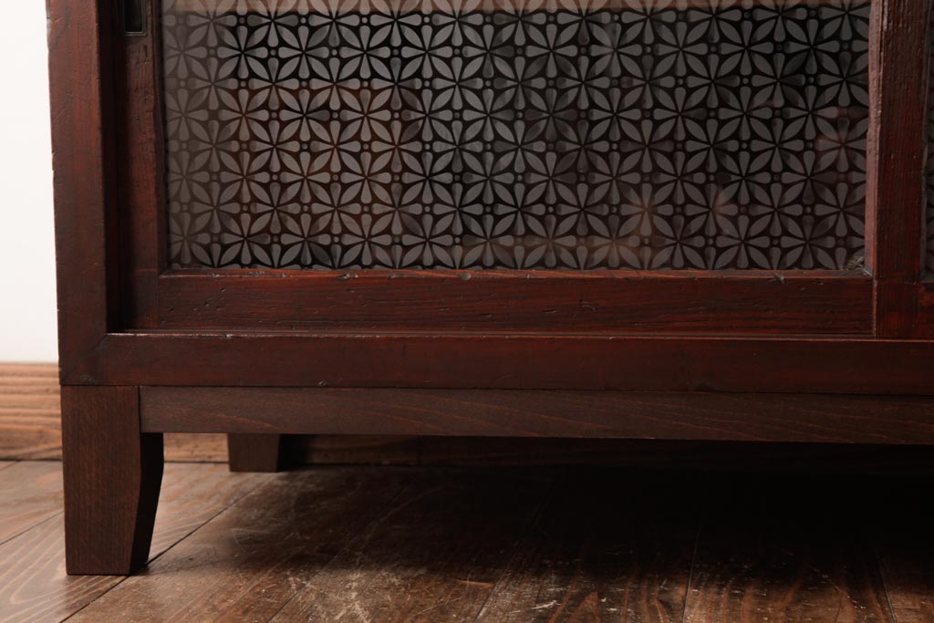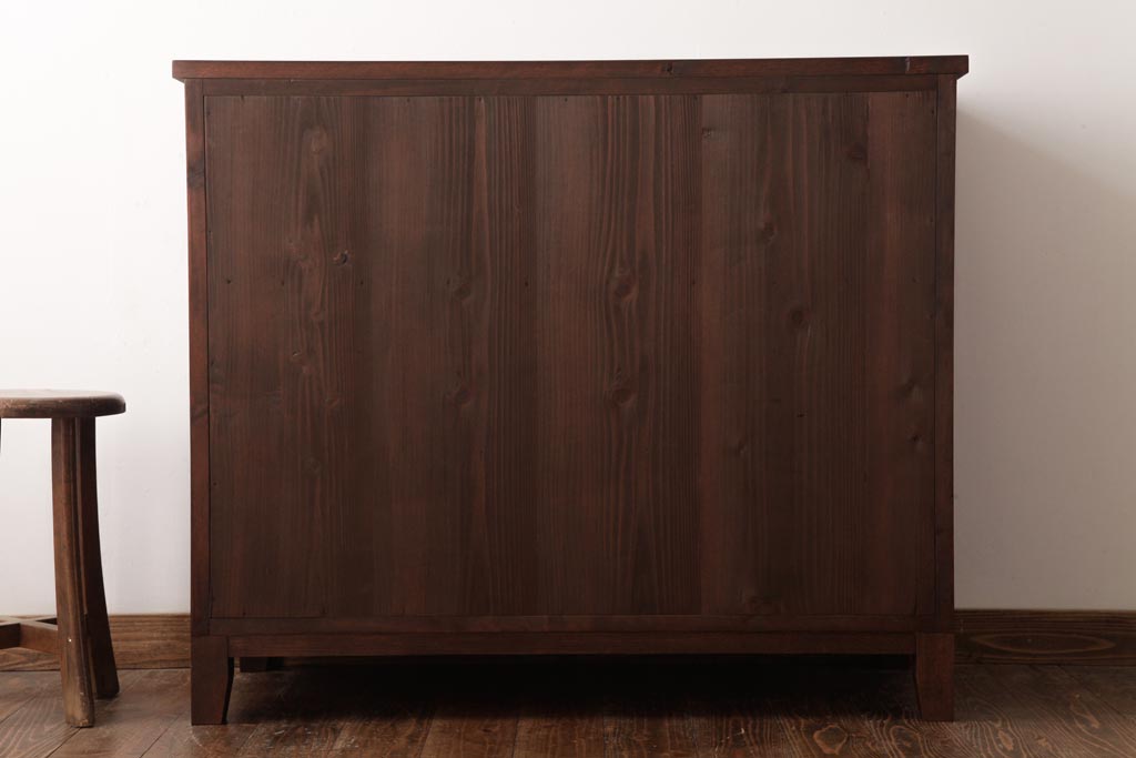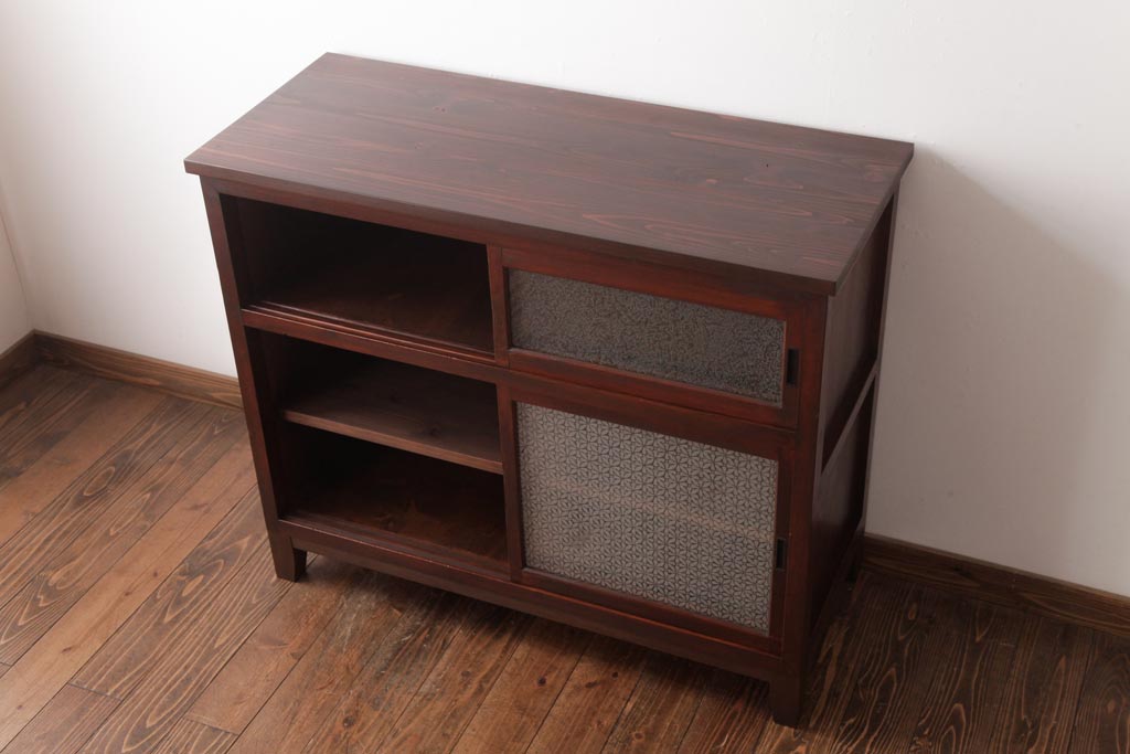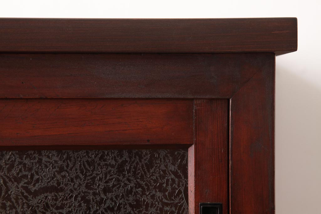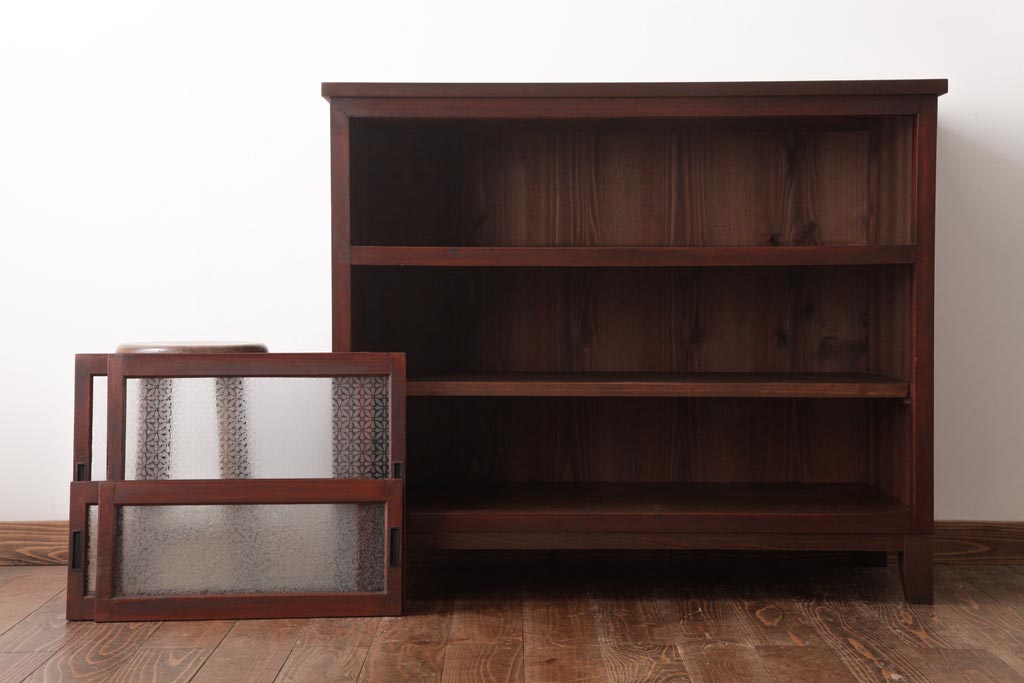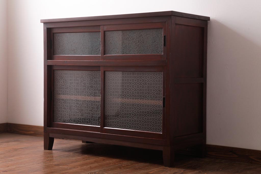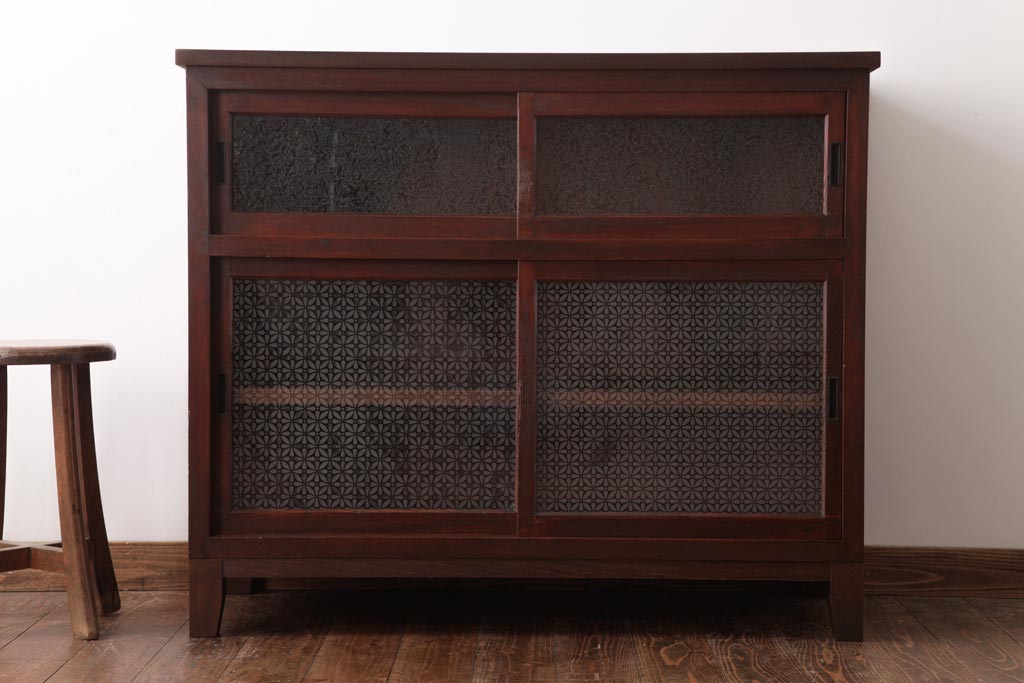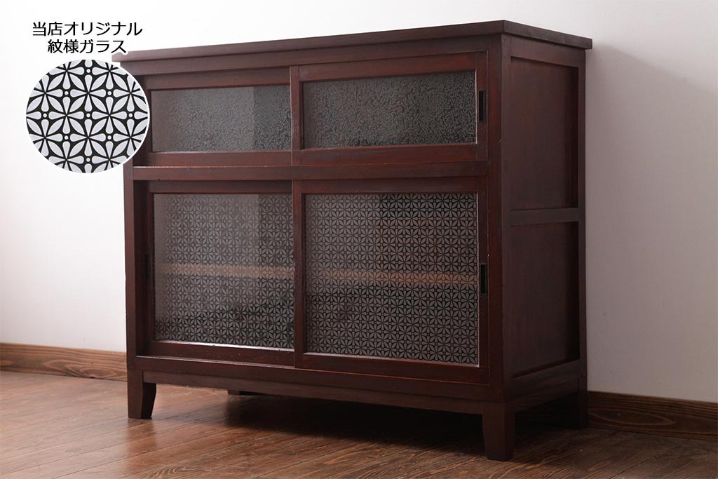 ラフジュ工房> キャビネット・戸棚> サイドキャビネット > アンティーク家具 和製アンティーク 当店オリジナルガラス 前面ヒノキ材 昔懐かしい和の雰囲気漂うリメイクキャビネット(収納棚、ガラス戸棚、サイドボード)(R-037427)