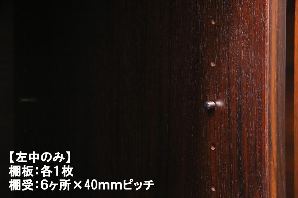 棚板は取り外しできます。棚板は左中 各1枚あります。棚受けは6ヶ所、40mmピッチで調整できます。棚幅サイズのものが1枚の作りです。