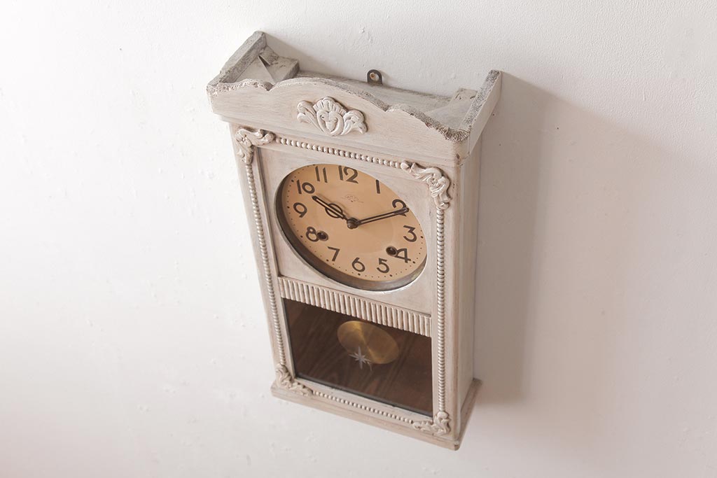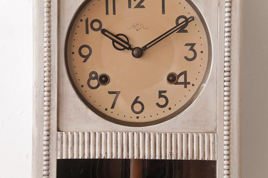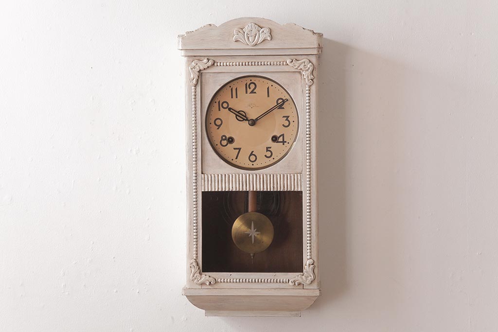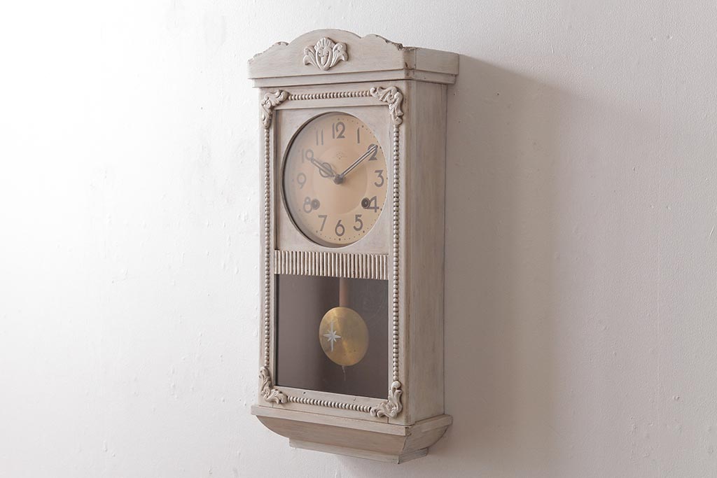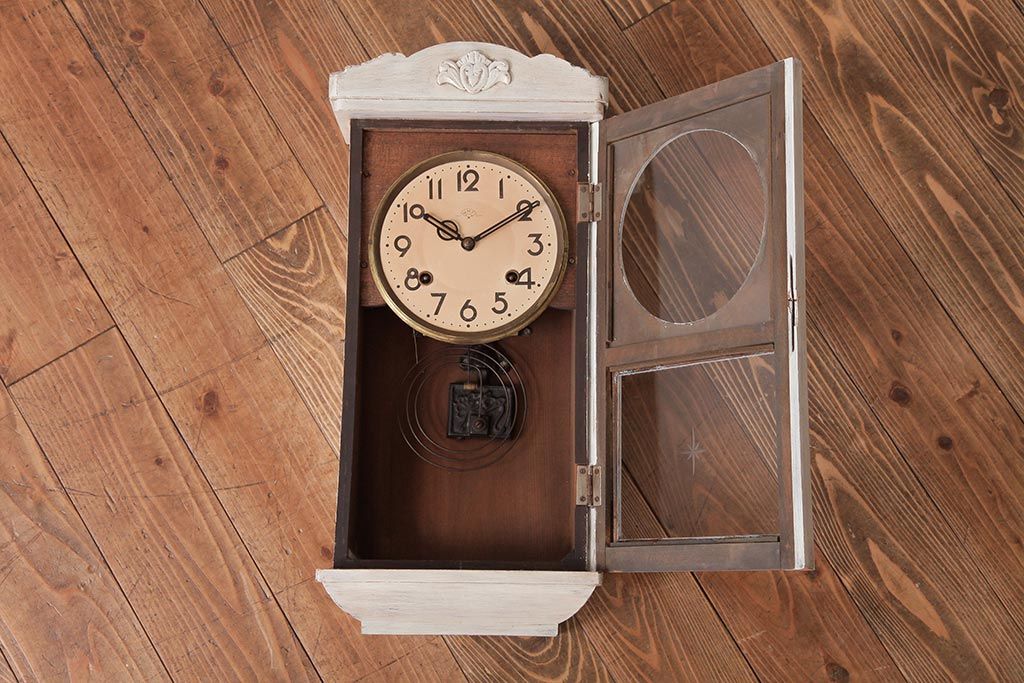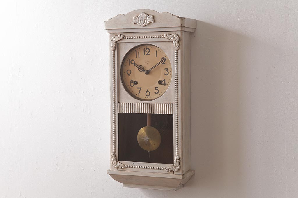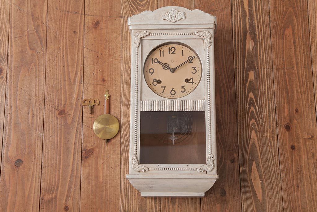 時計> 掛け時計 > ビンテージ雑貨 堀田時計店 N.H.T ゼンマイ式 アンティークペイントがおしゃれな振り子掛時計(柱時計、壁掛け時計)(R-037529)