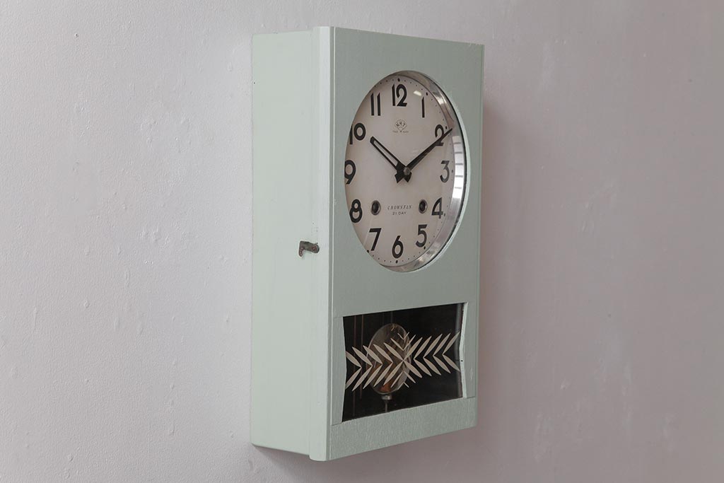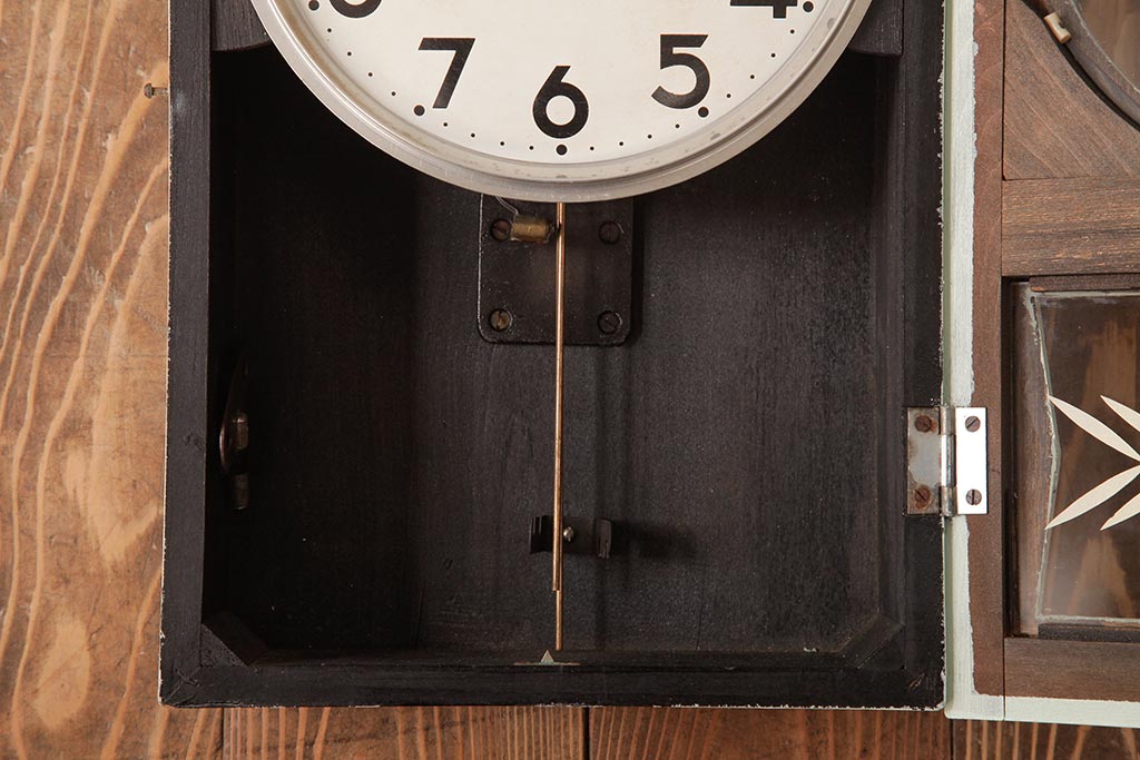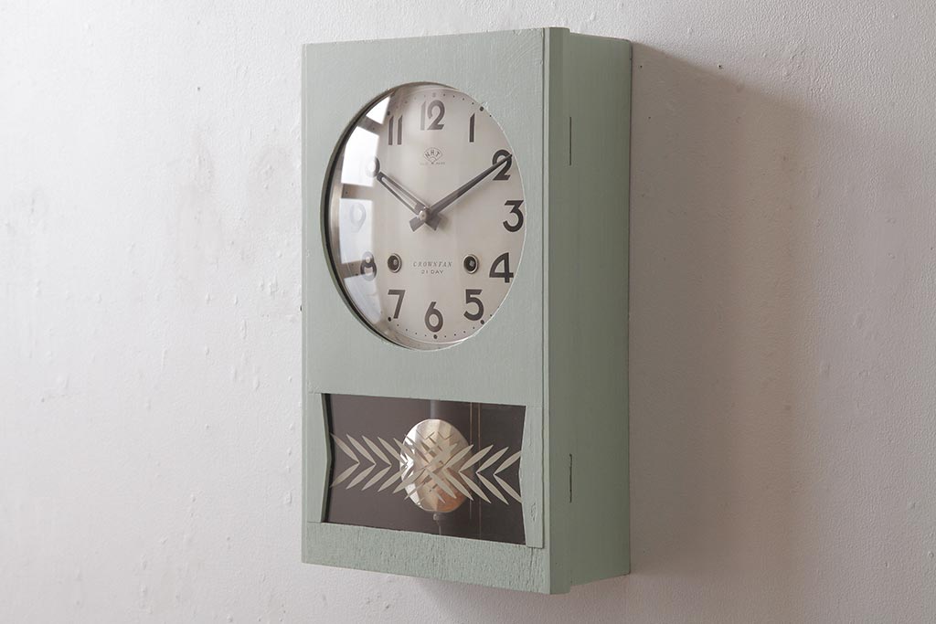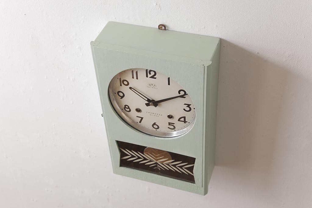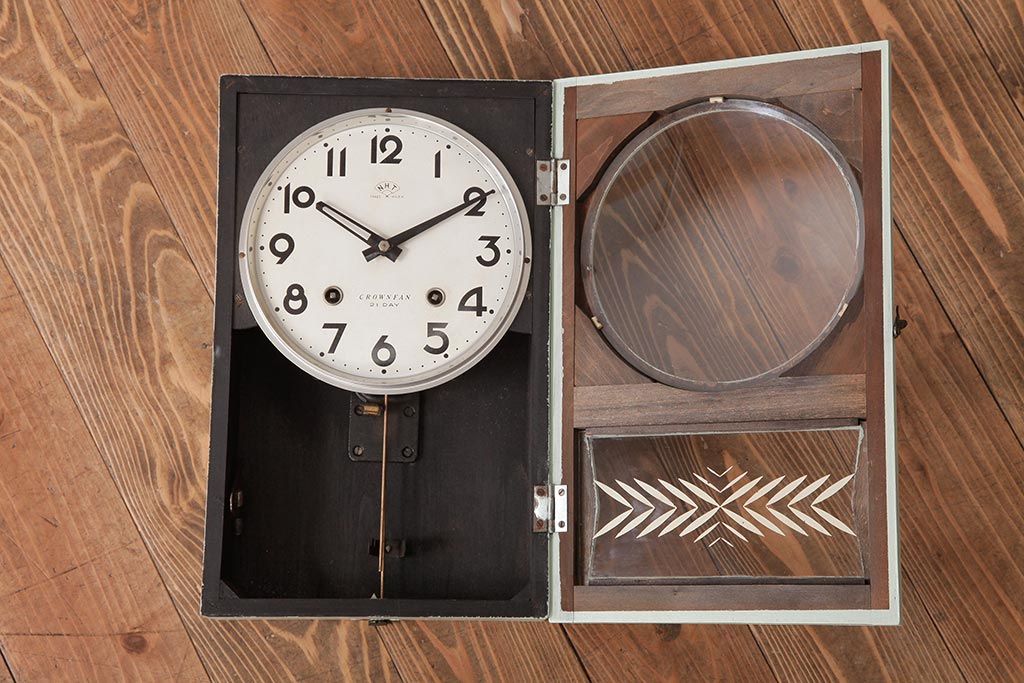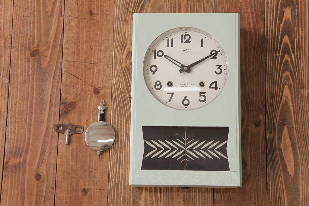 時計> 掛け時計 > ビンテージ雑貨 堀田時計店 N.H.T CROWNFAN 21DAY ゼンマイ式 淡いペイントがおしゃれな振り子掛時計(柱時計、壁掛け時計)(R-037533)