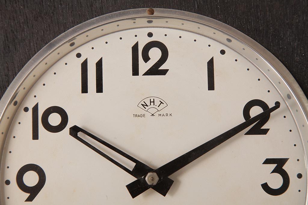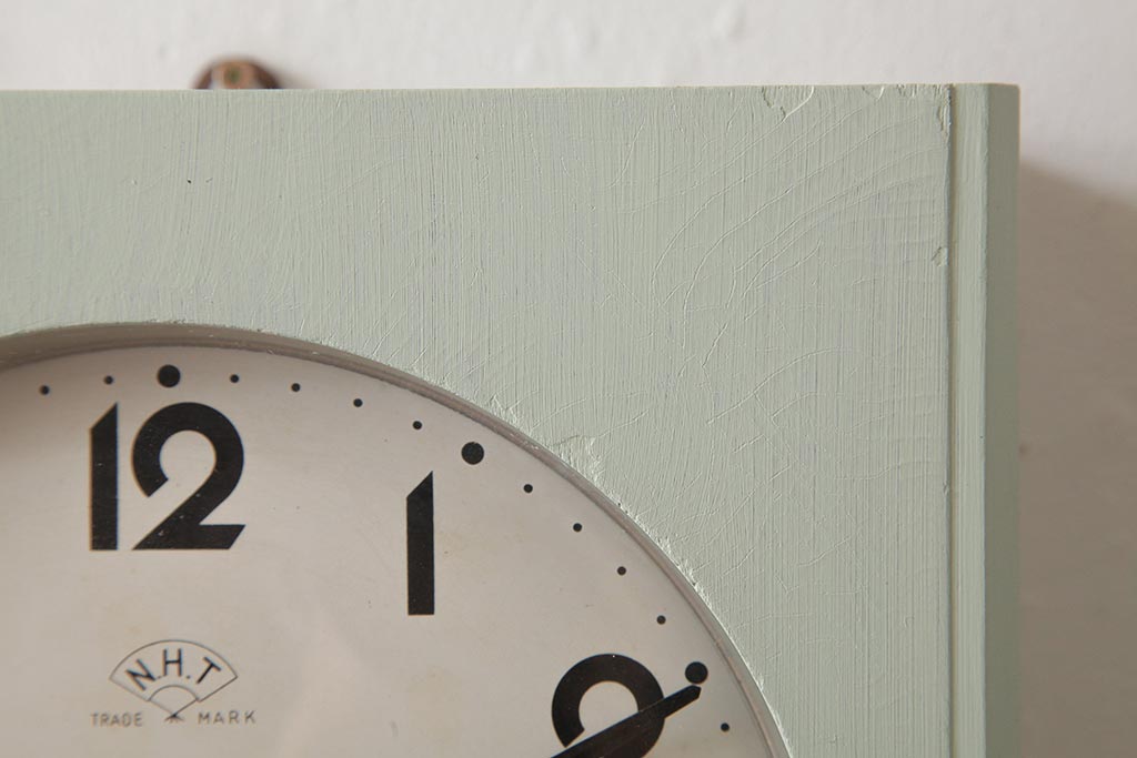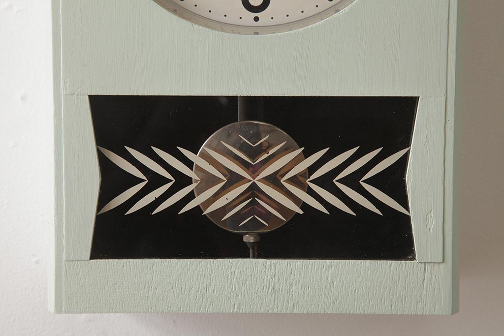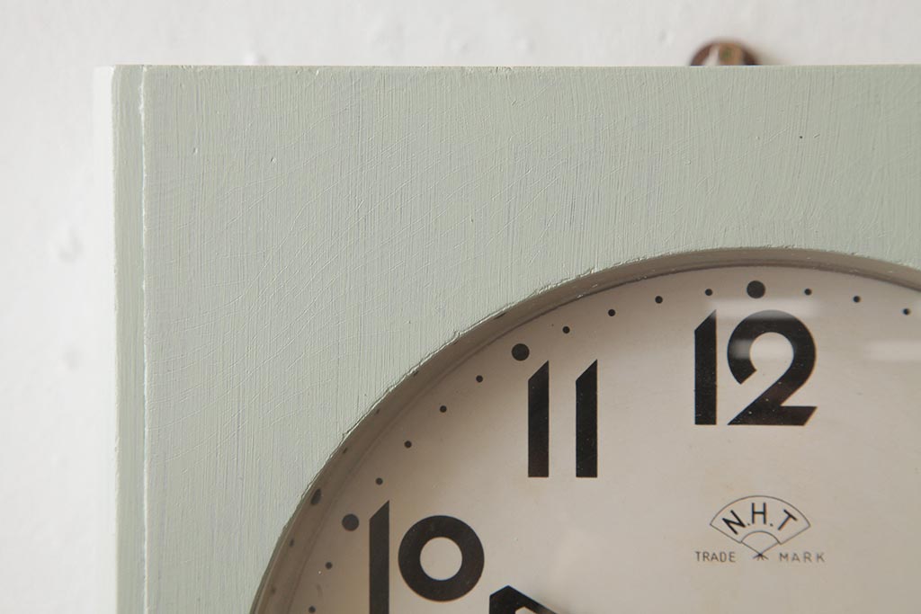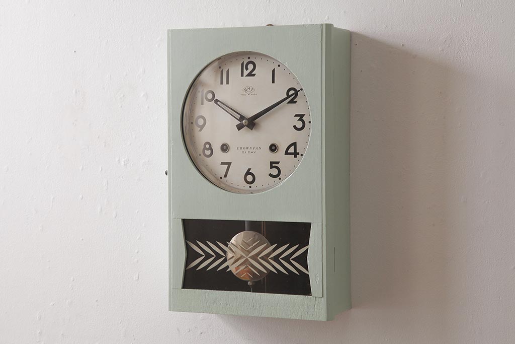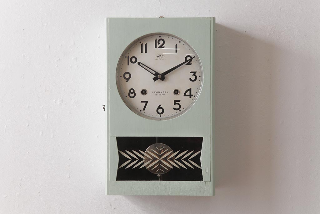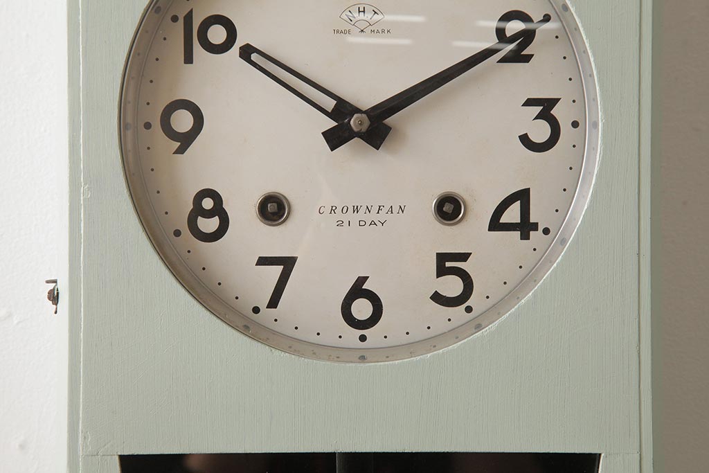 時計> 掛け時計 > ビンテージ雑貨 堀田時計店 N.H.T CROWNFAN 21DAY ゼンマイ式 淡いペイントがおしゃれな振り子掛時計(柱時計、壁掛け時計)(R-037533)