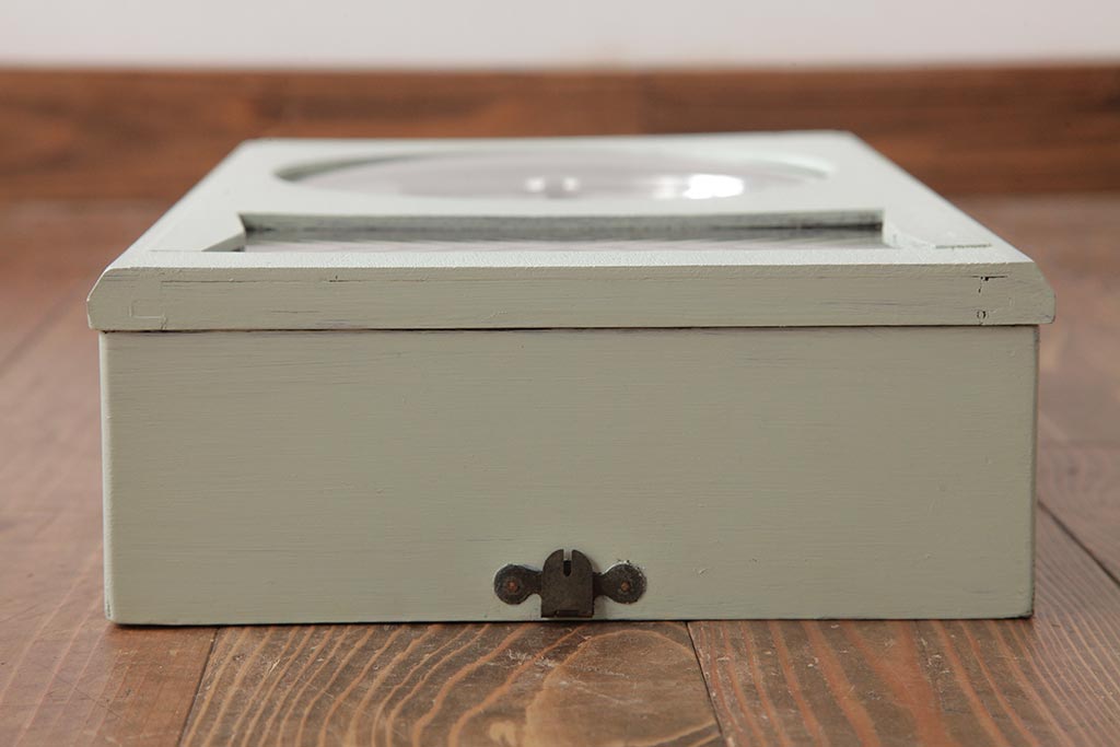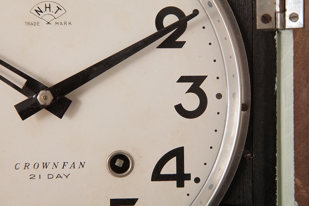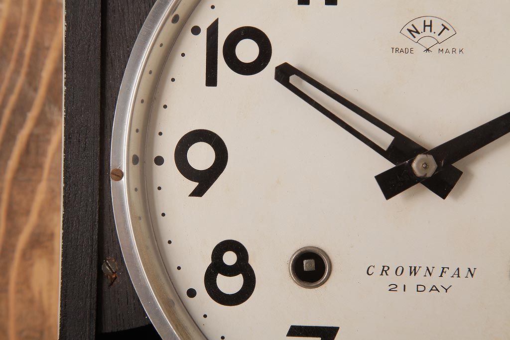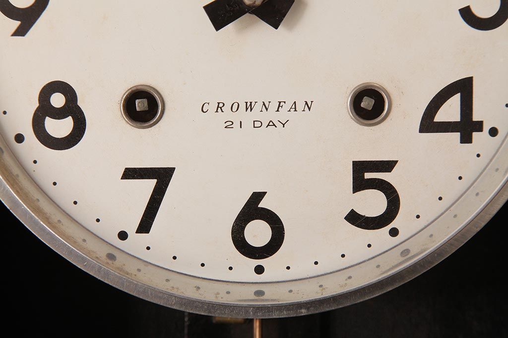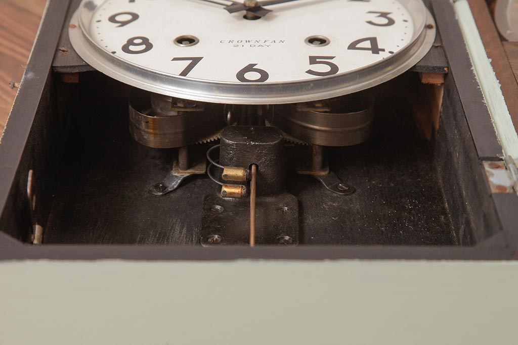 ビンテージ雑貨 堀田時計店 N.H.T CROWNFAN 21DAY ゼンマイ式 淡いペイントがおしゃれな振り子掛時計(柱時計、壁掛け時計)(R-037533)です。