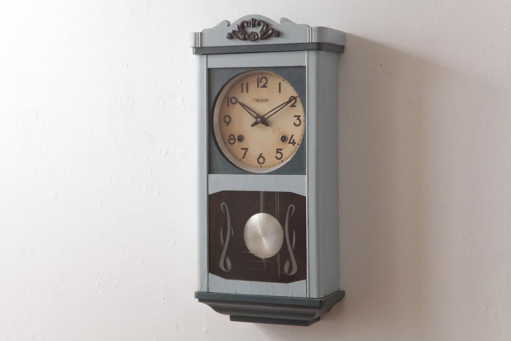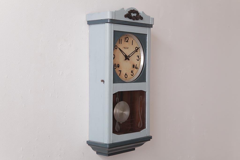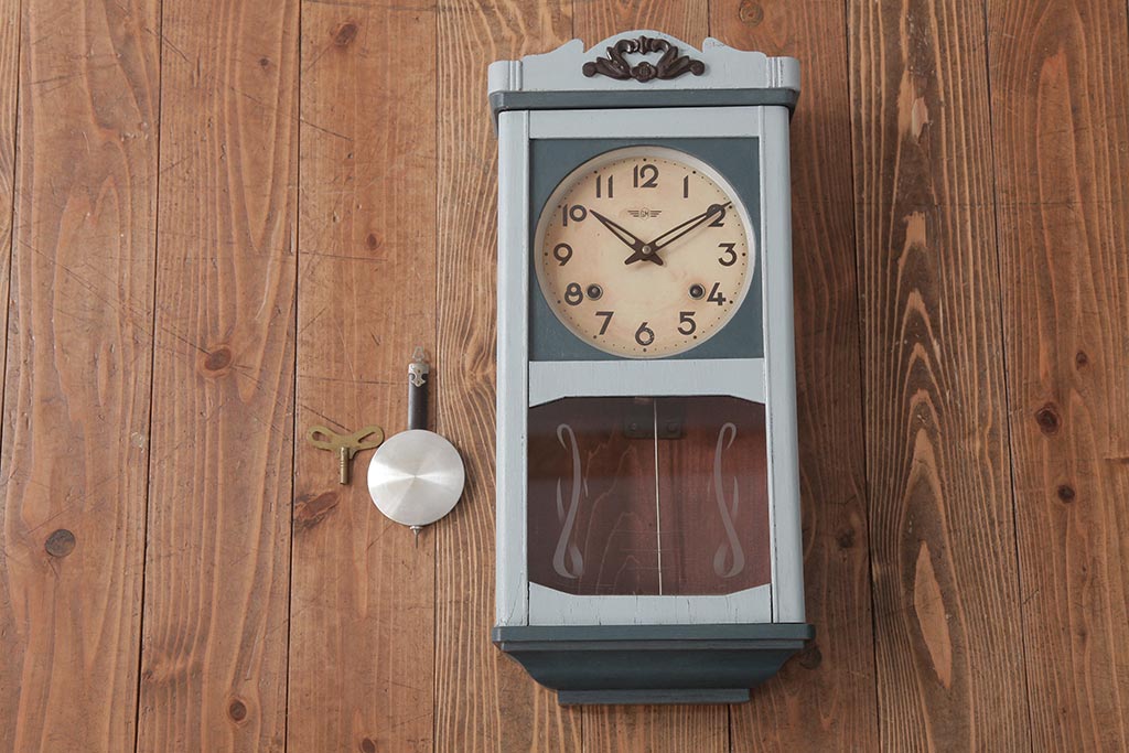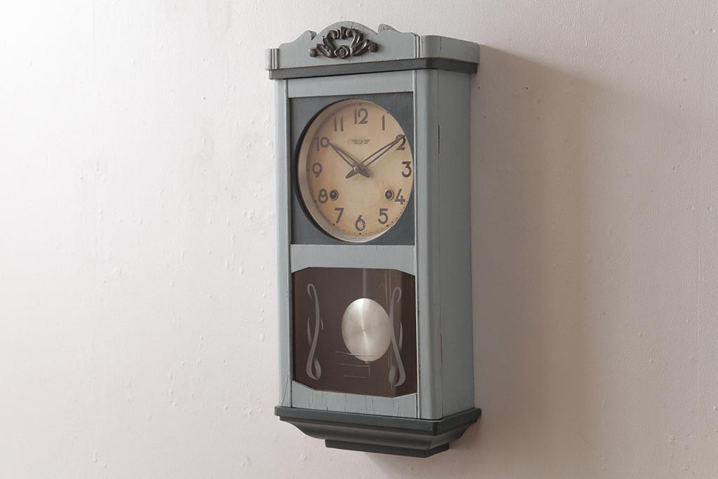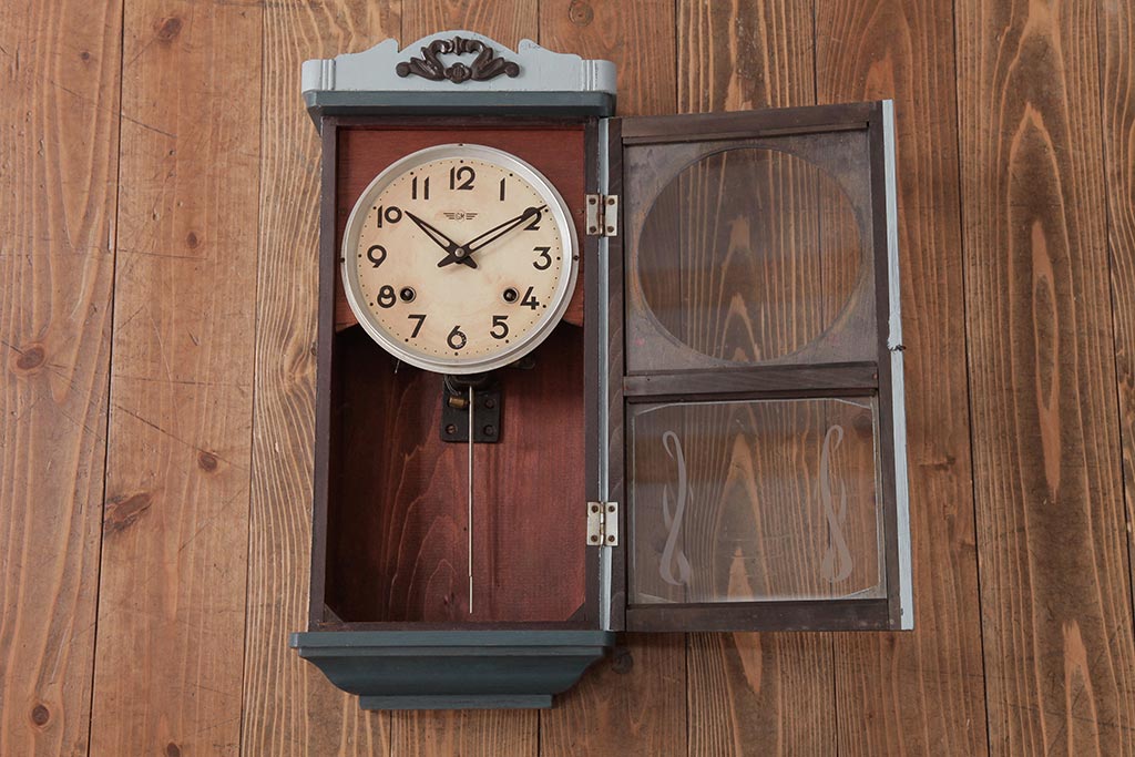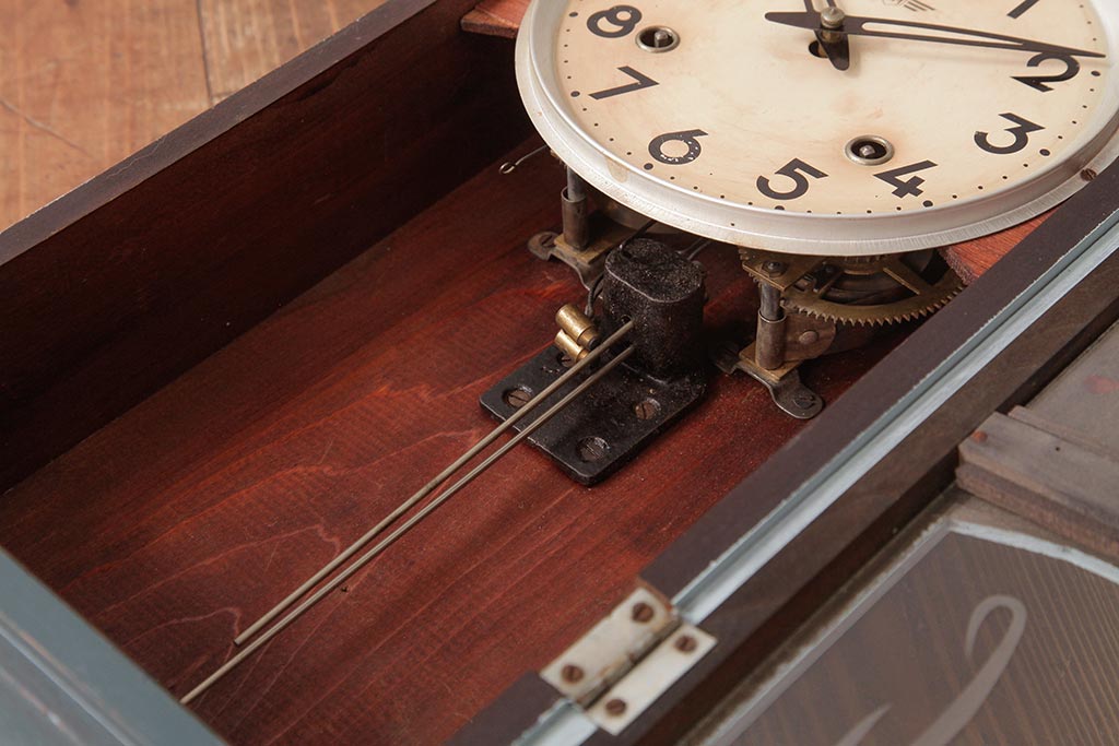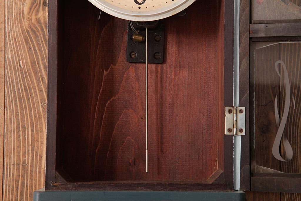 時計> 掛け時計 > アンティーク雑貨 GMマーク ゼンマイ式 レトロなペイントがお洒落な掛け時計(振り子時計、柱時計)(R-037530)