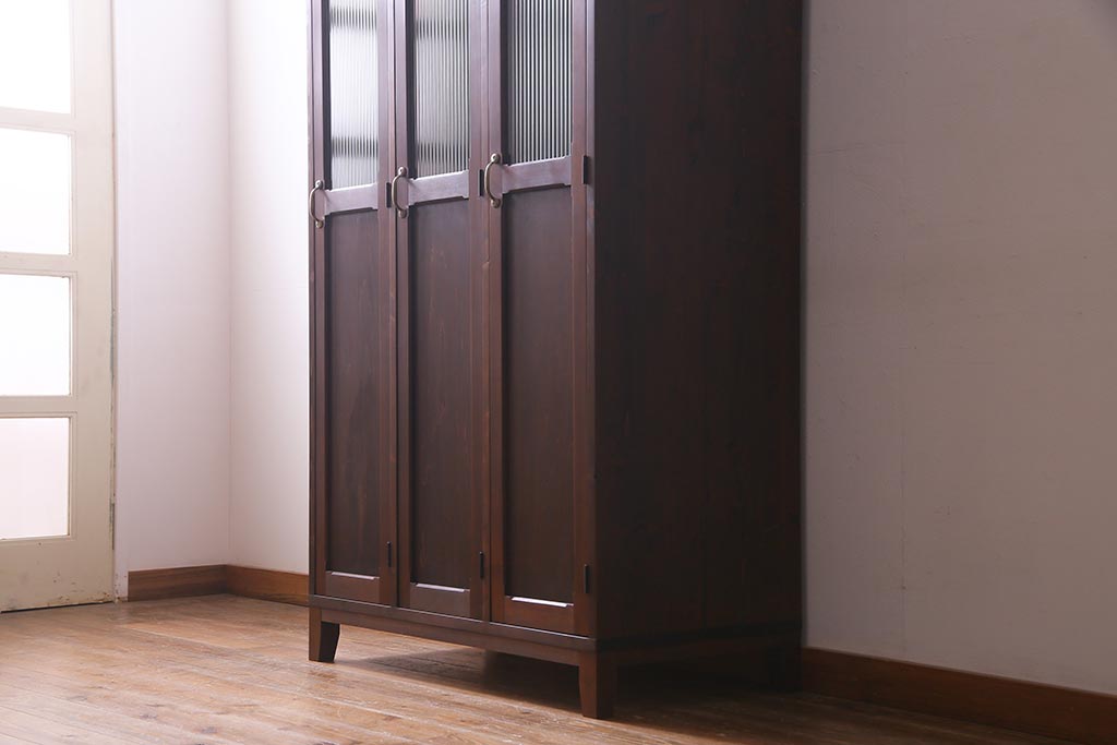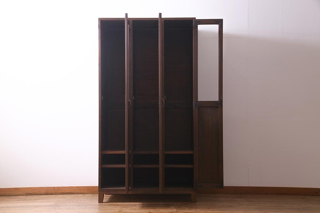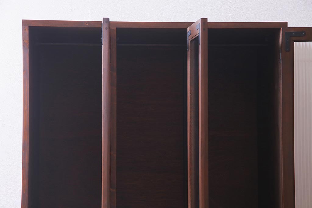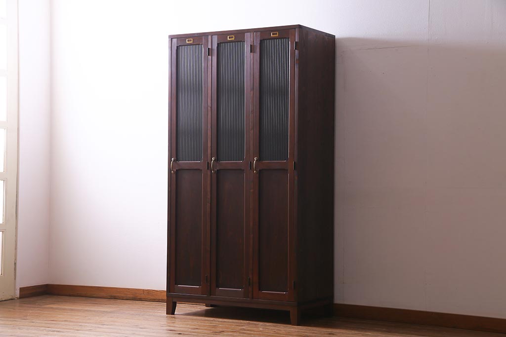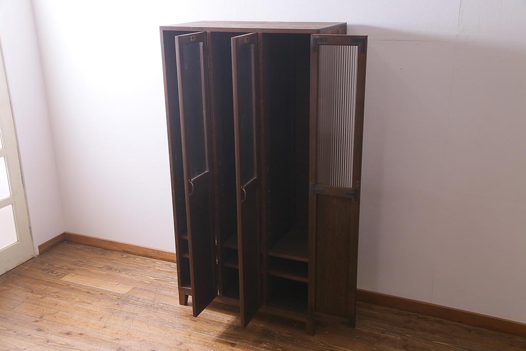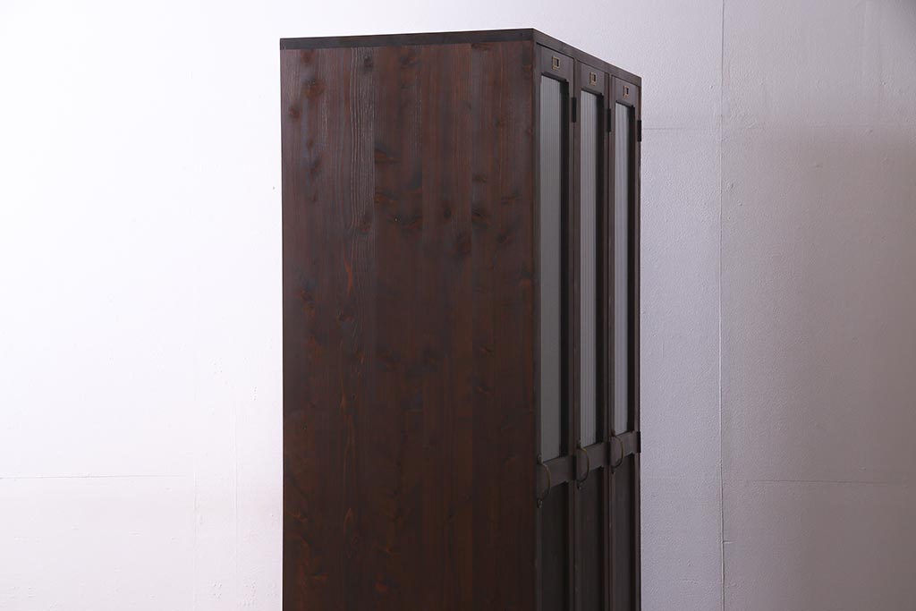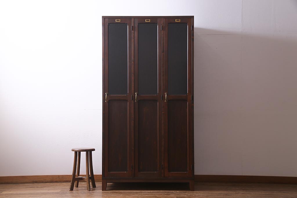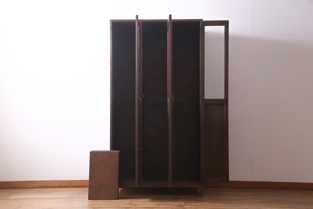 ラフジュ工房オリジナル ヒノキ無垢材・ヒバ材 モールガラス入り レトロな趣漂う3人用ロッカー(ワードローブ)(R-037541)