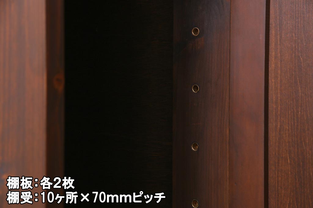 棚受けは各10ヶ所、70mmピッチで調整できます。棚幅サイズのものが1枚の作りです。
