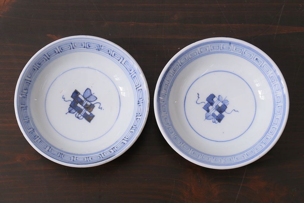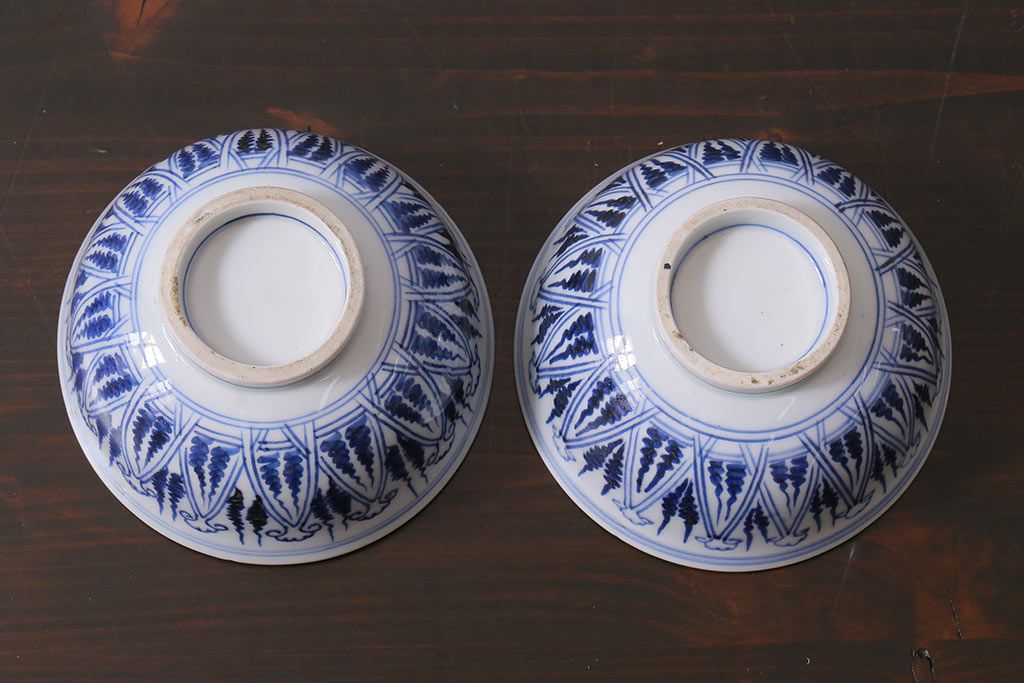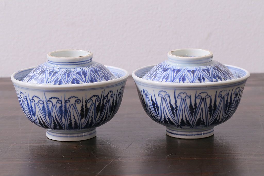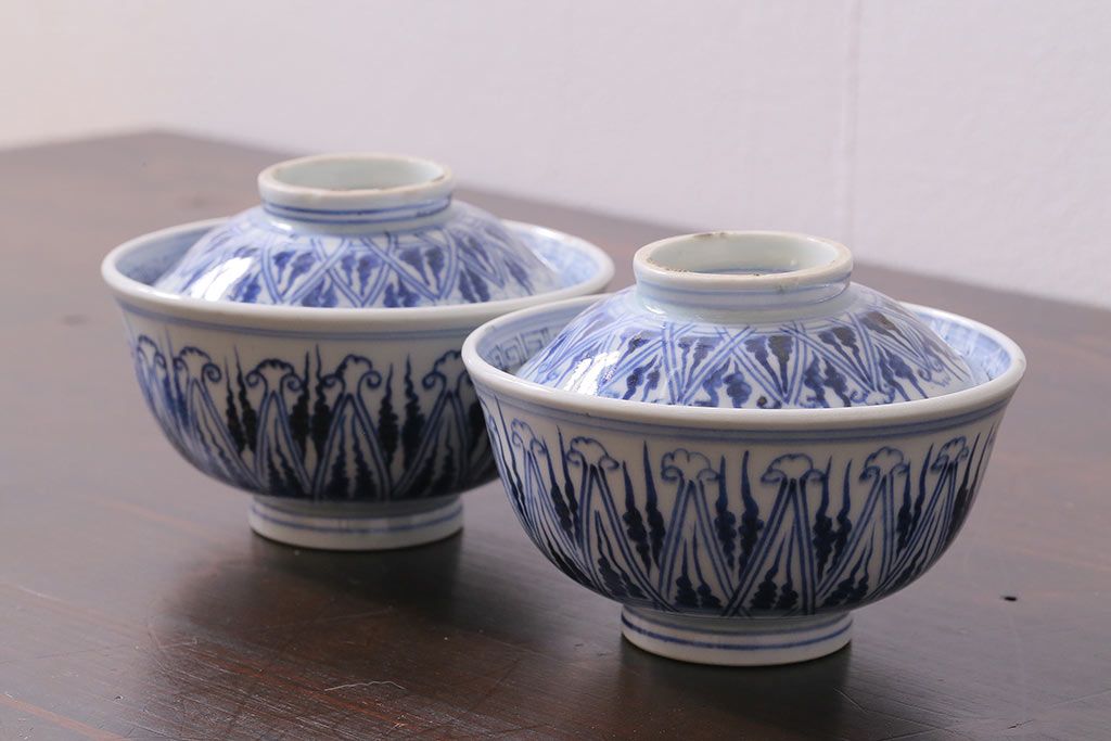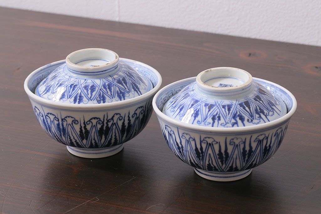 アンティーク雑貨 古民具・骨董 味のある絵柄の蓋茶碗2客セット(和食器)(R-037292)