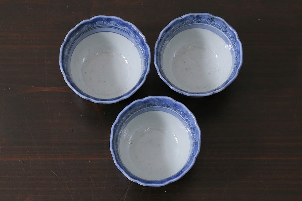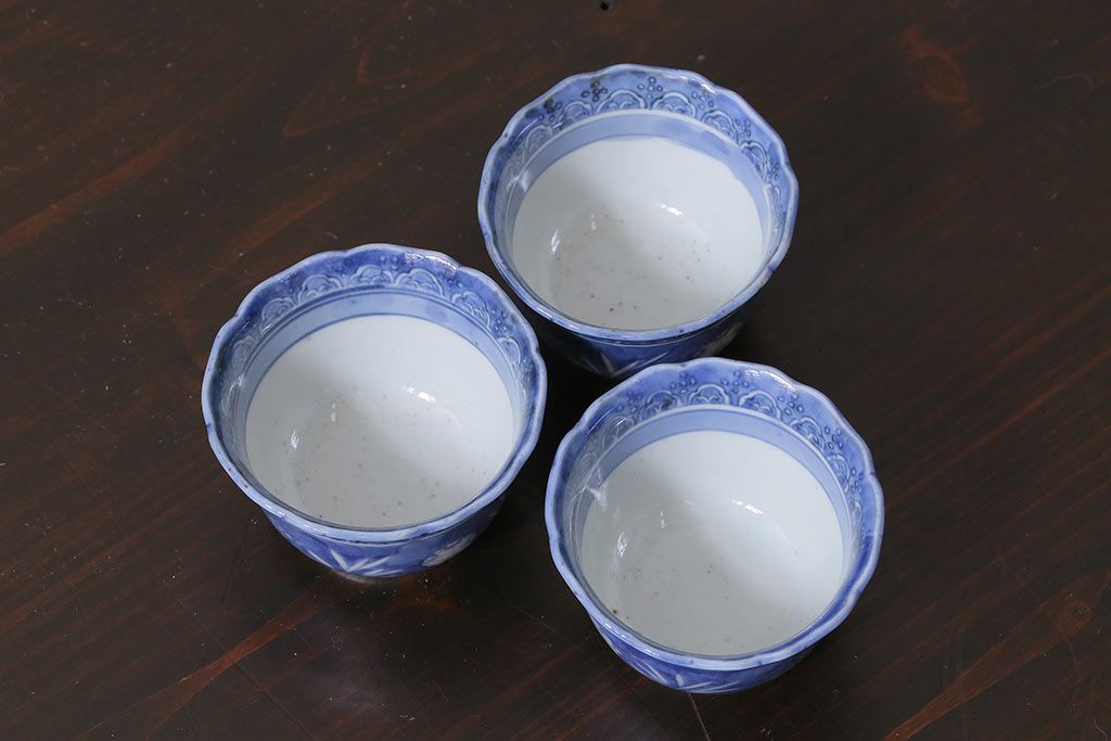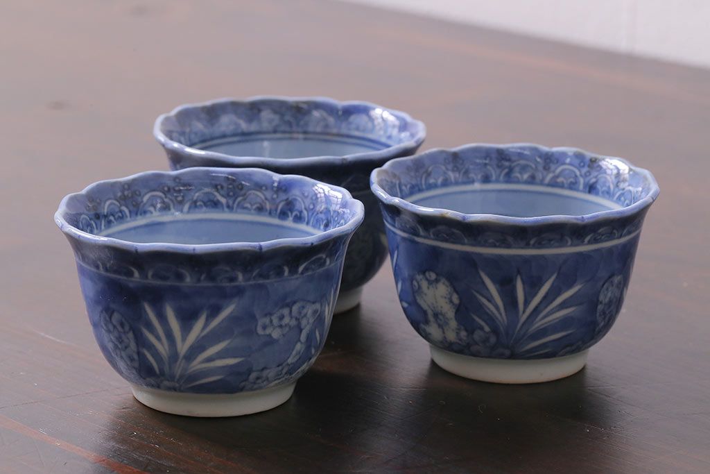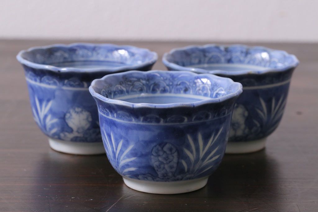 アンティーク雑貨 江戸期 古伊万里 染付 湯呑3客セット(向付、蕎麦猪口)(R-037233)