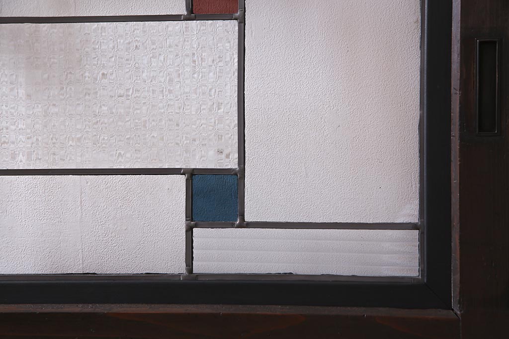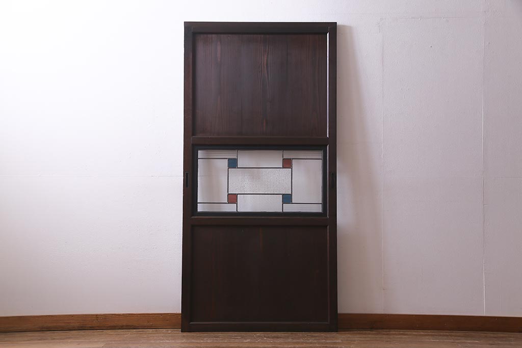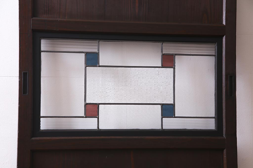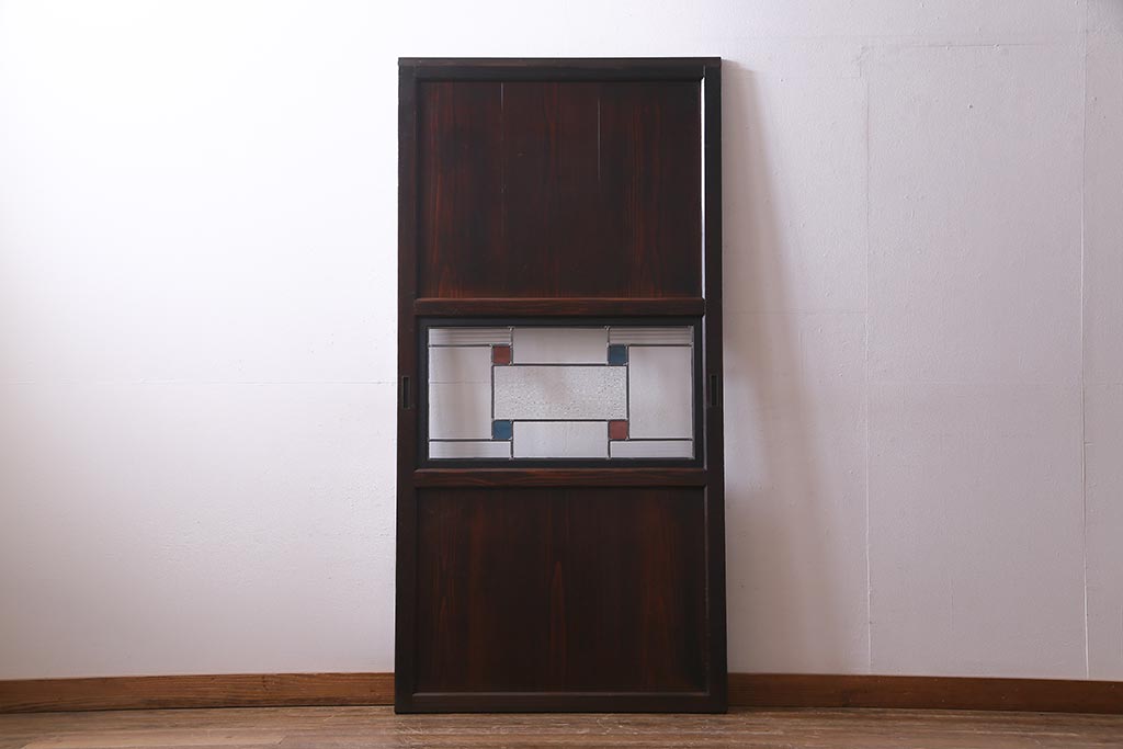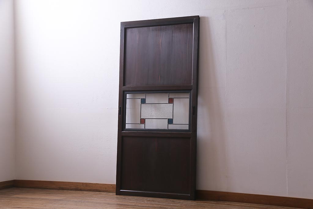 アンティーク建具 明治大正期 チェッカーガラス・モールガラス・色ガラス ステンドグラスがお洒落な板戸1枚(建具、ガラス帯戸、引き戸)(R-037577)
