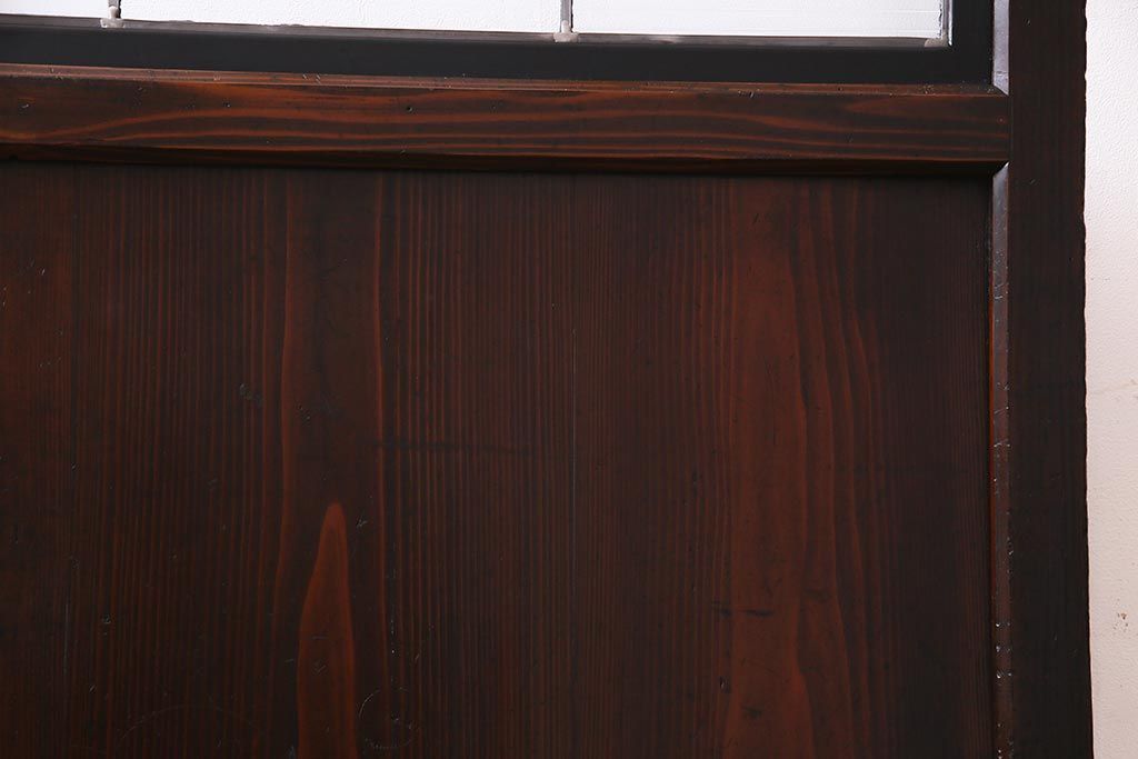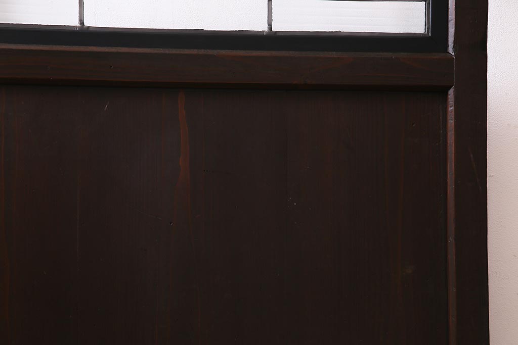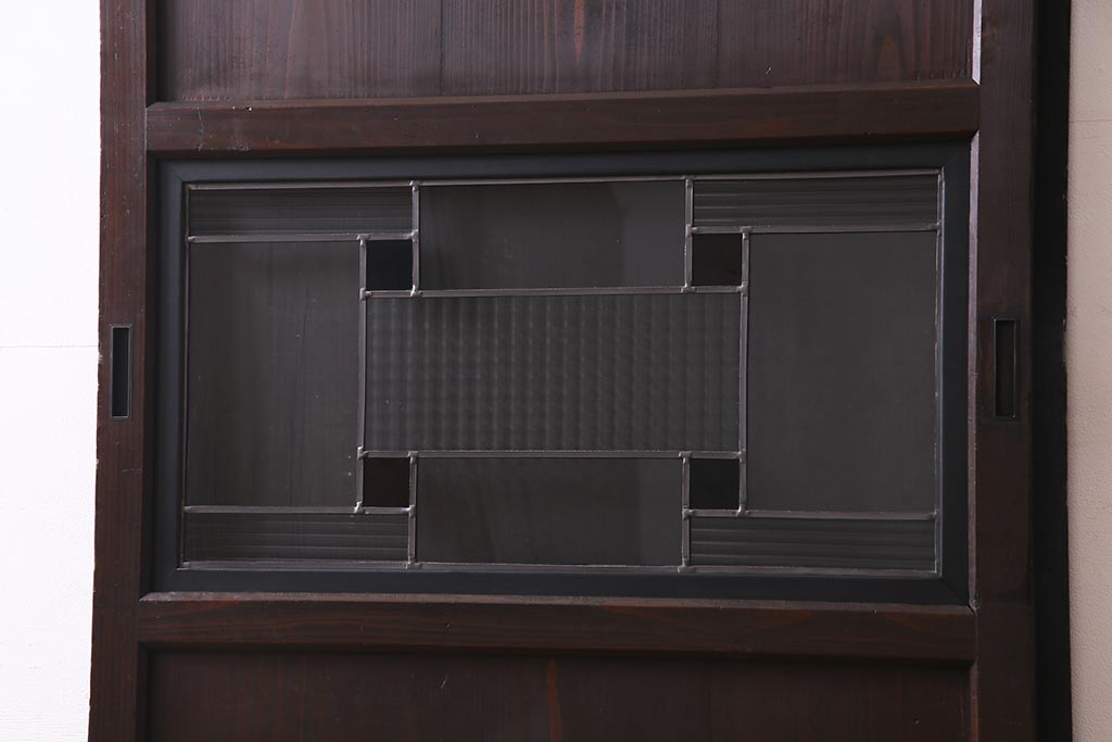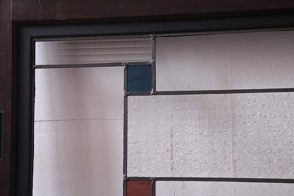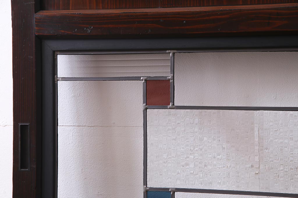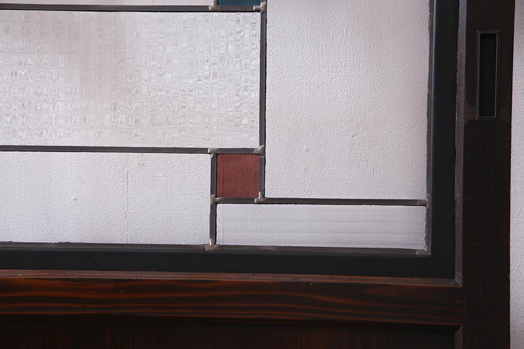 アンティーク建具 明治大正期 チェッカーガラス・モールガラス・色ガラス ステンドグラスがお洒落な板戸1枚(建具、ガラス帯戸、引き戸)(R-037577)