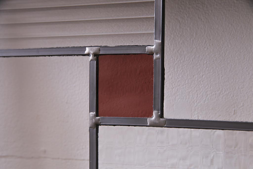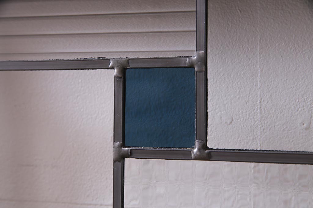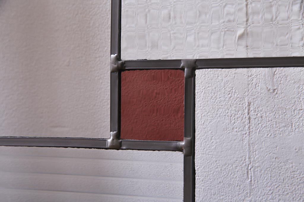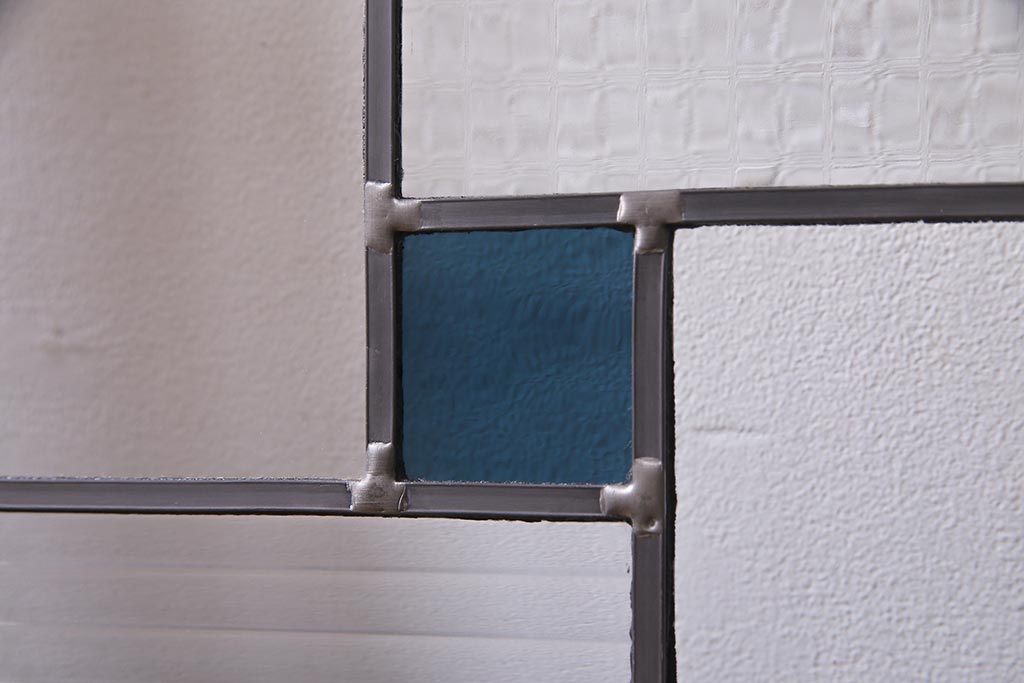 ドア・建具> 色ガラス・ステンド入り建具 > アンティーク建具 明治大正期 チェッカーガラス・モールガラス・色ガラス ステンドグラスがお洒落な板戸1枚(建具、ガラス帯戸、引き戸)(R-037577)