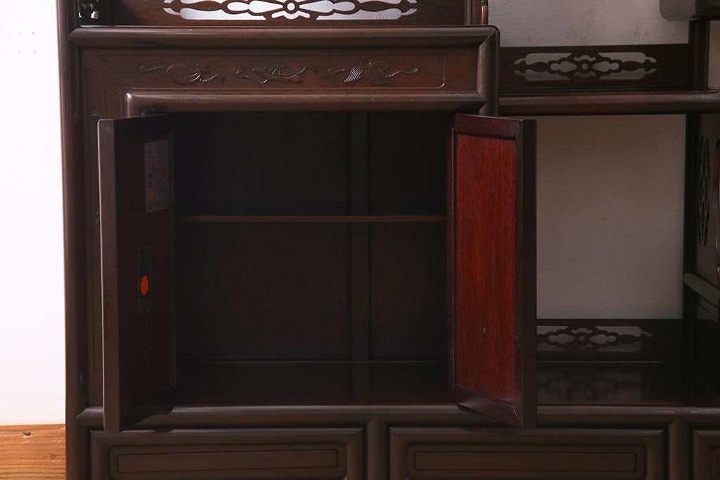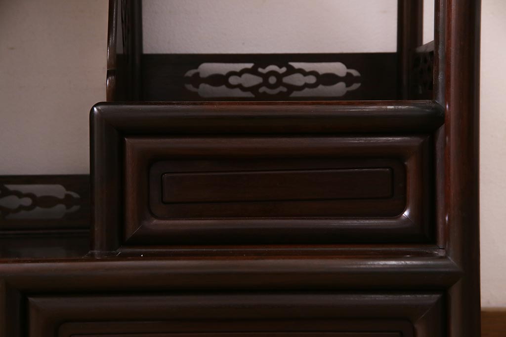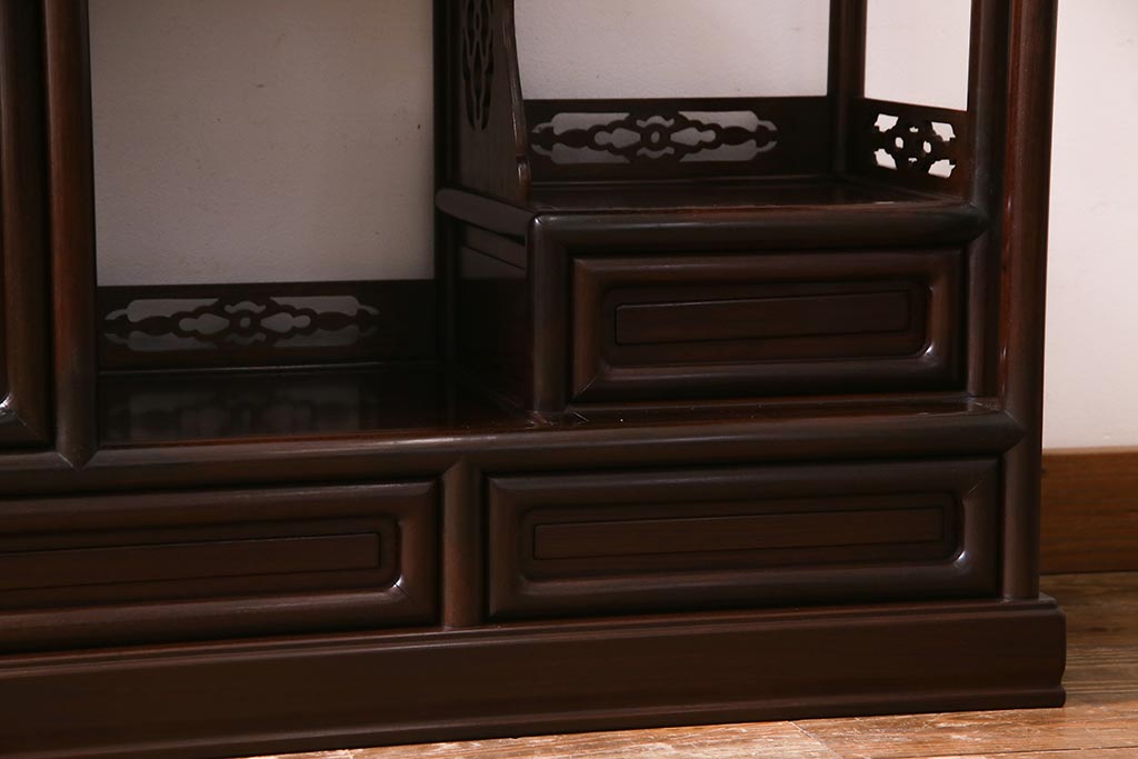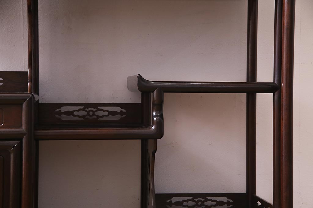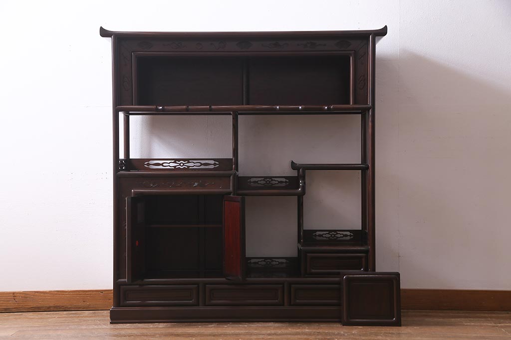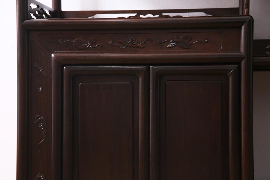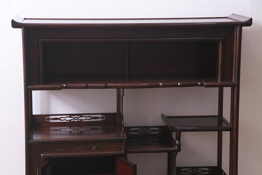 中古 伝統工芸品 大阪唐木指物 在銘 紫檀(シタン)材 漆塗り 縁起物の彫りが目を引く飾り棚(違い棚、茶棚)(R-037558)