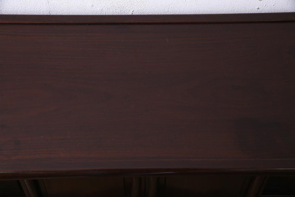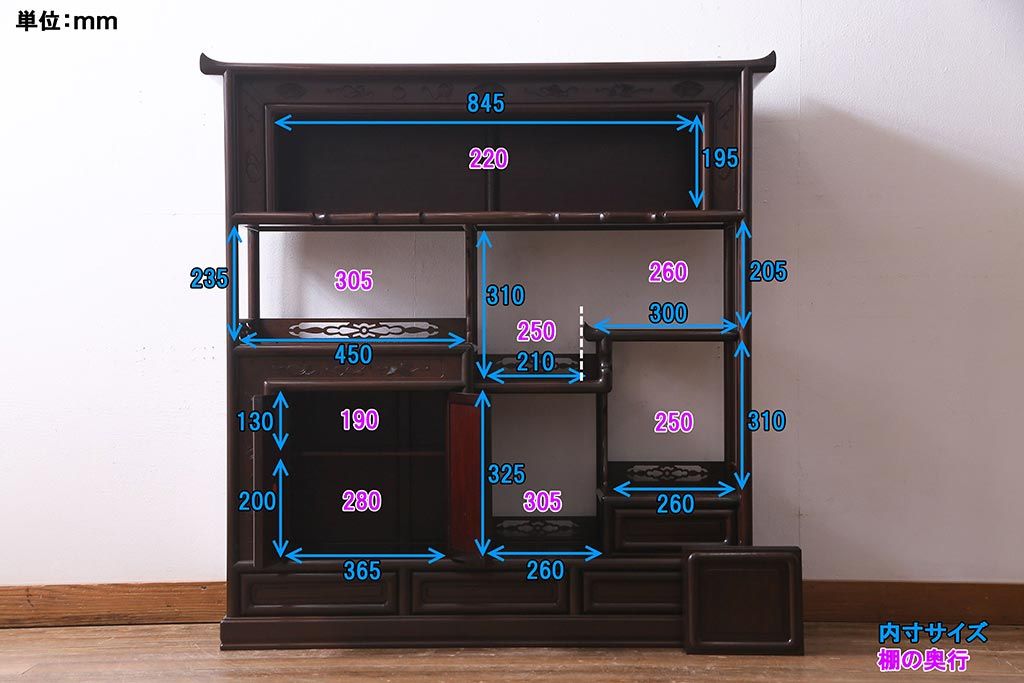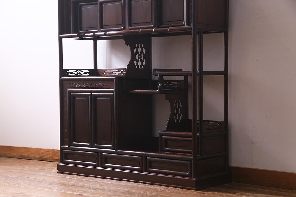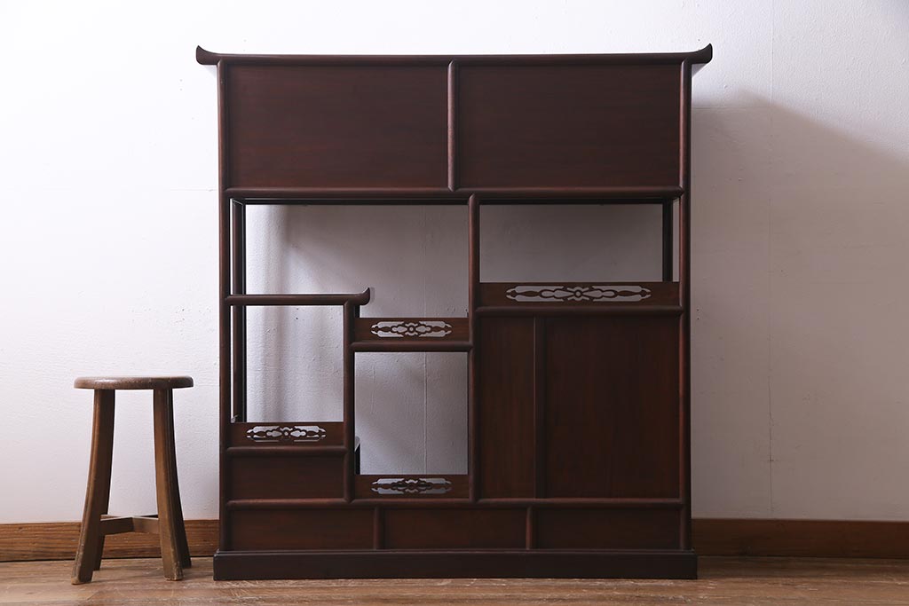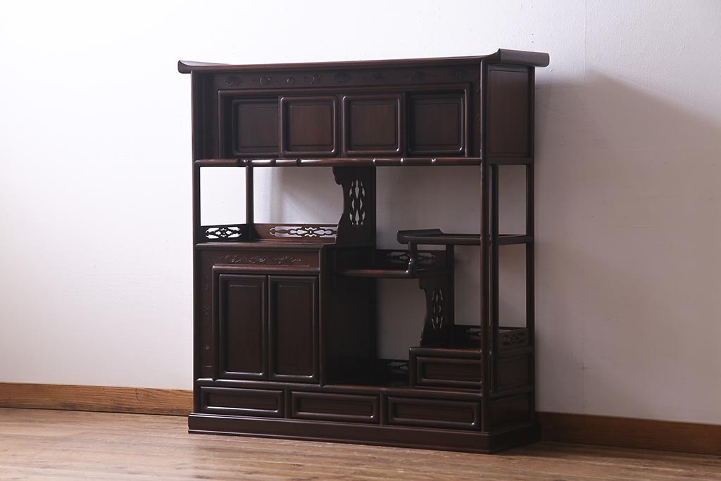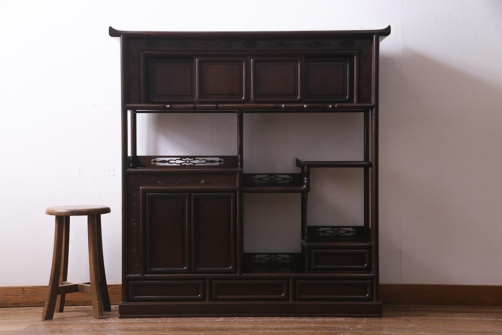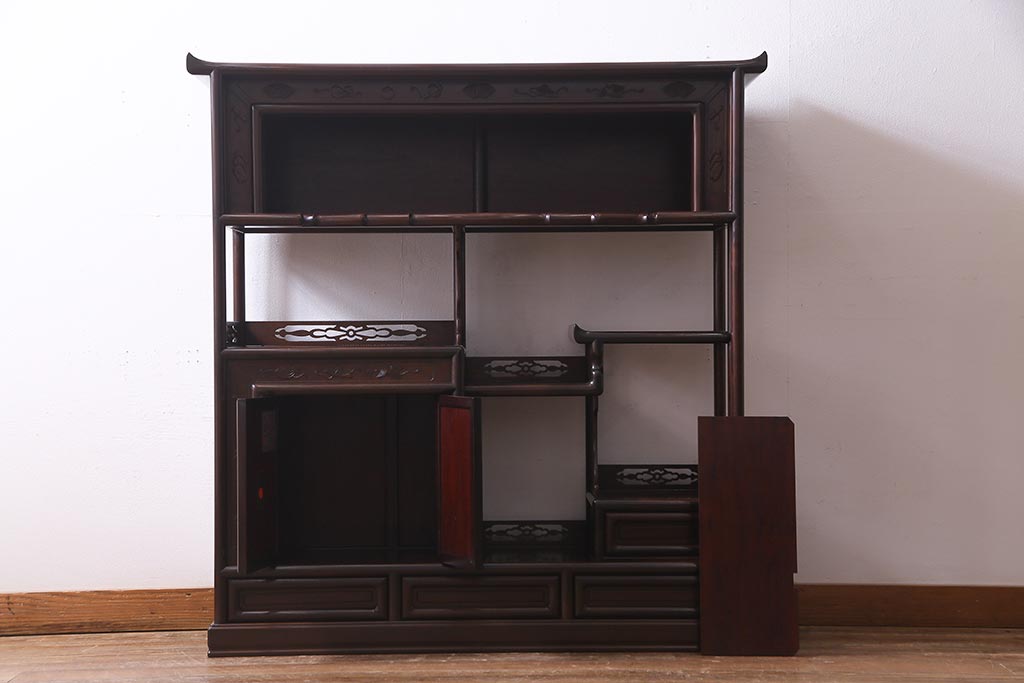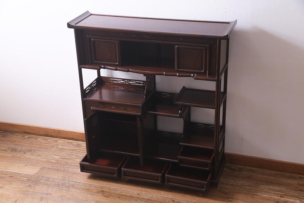 中古 伝統工芸品 大阪唐木指物 在銘 紫檀(シタン)材 漆塗り 縁起物の彫りが目を引く飾り棚(違い棚、茶棚)(R-037558)