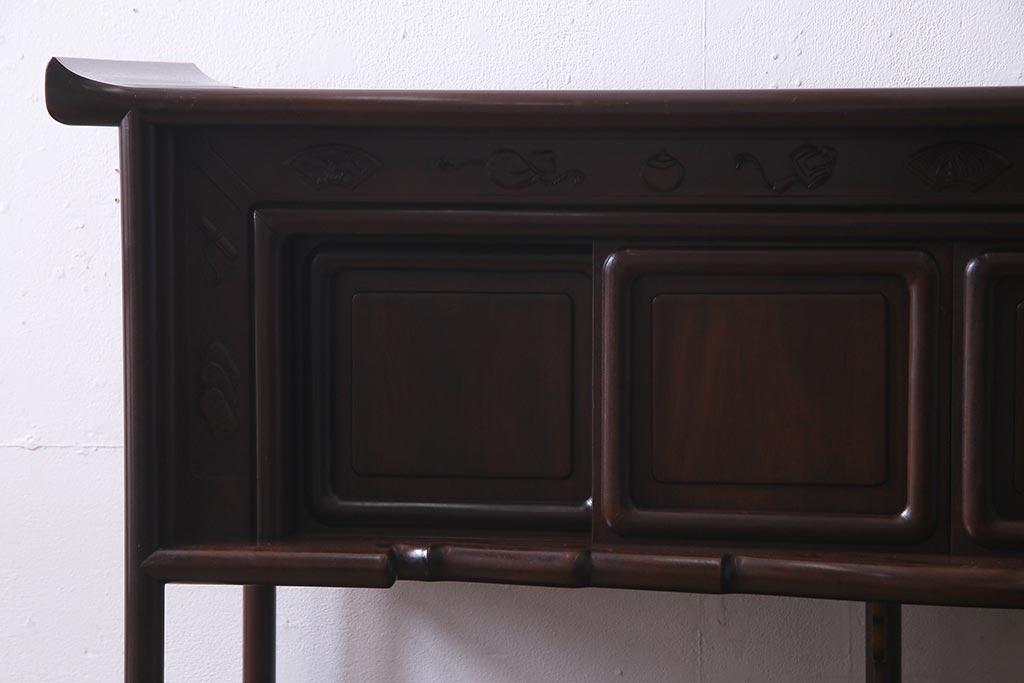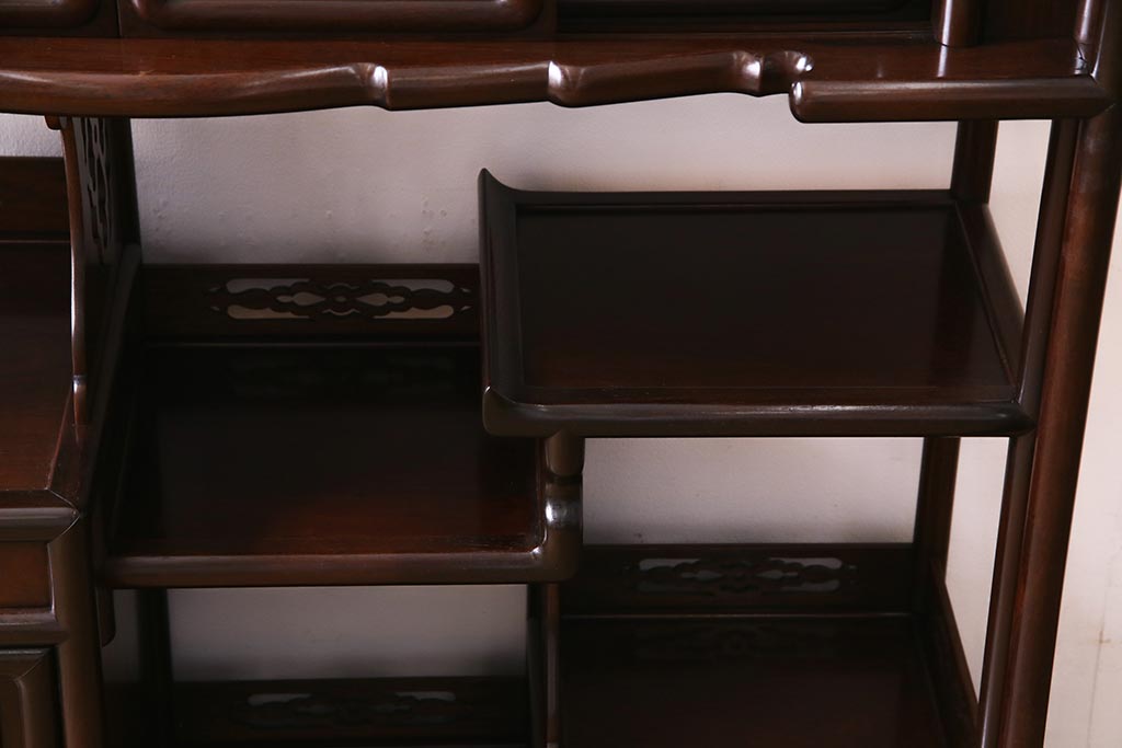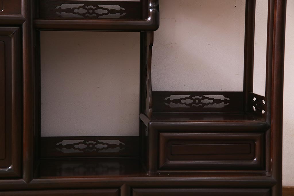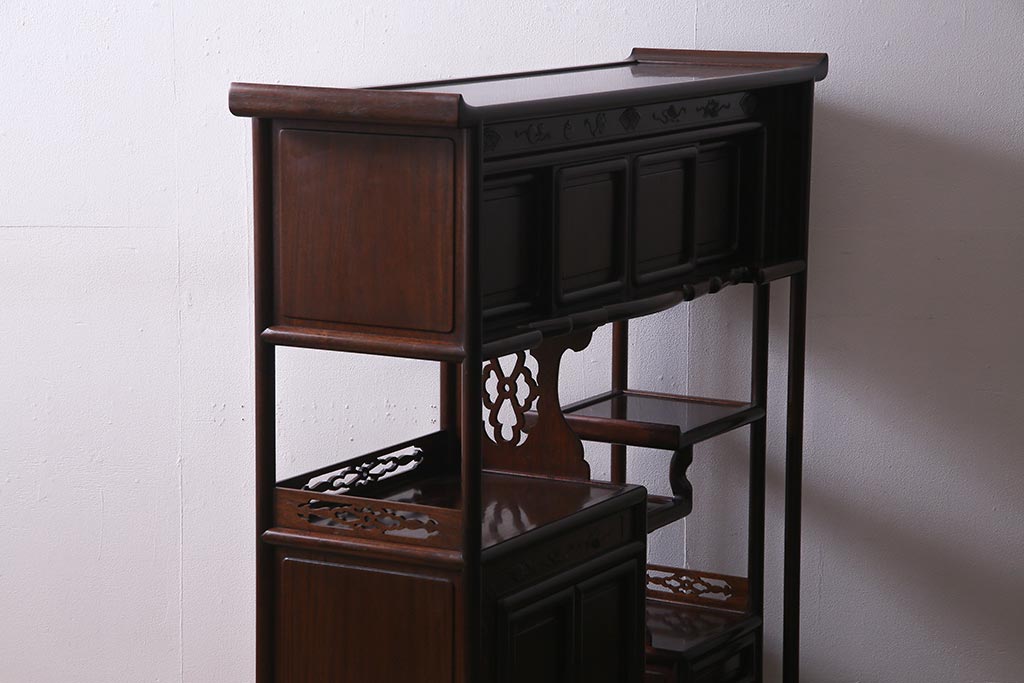 和箪笥> 茶箪笥・茶棚 > 中古 伝統工芸品 大阪唐木指物 在銘 紫檀(シタン)材 漆塗り 縁起物の彫りが目を引く飾り棚(違い棚、茶棚)(R-037558)