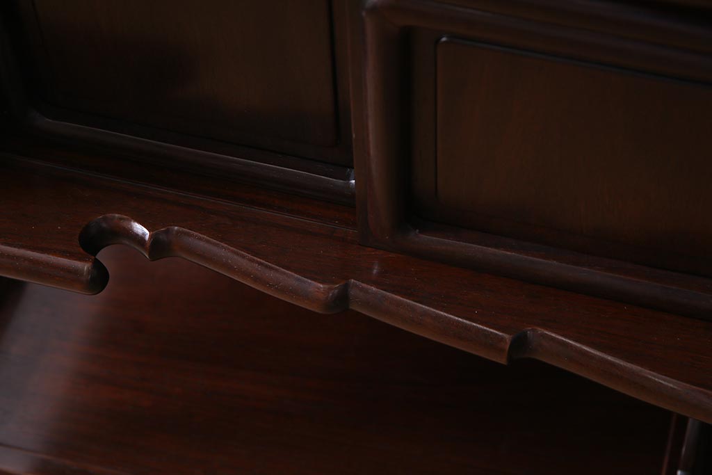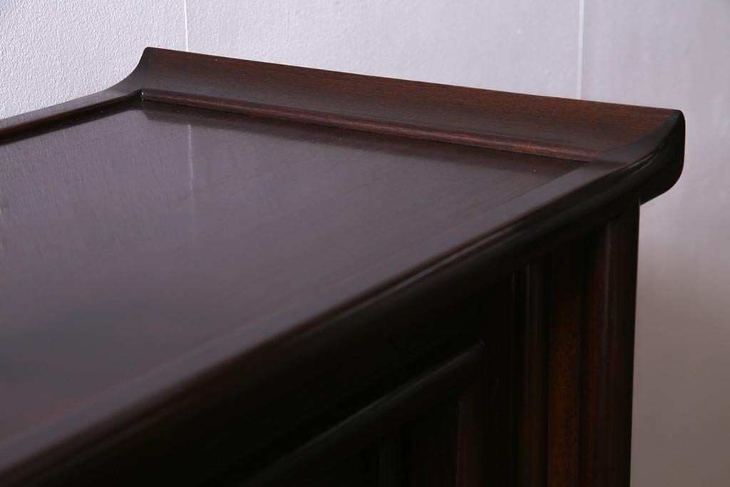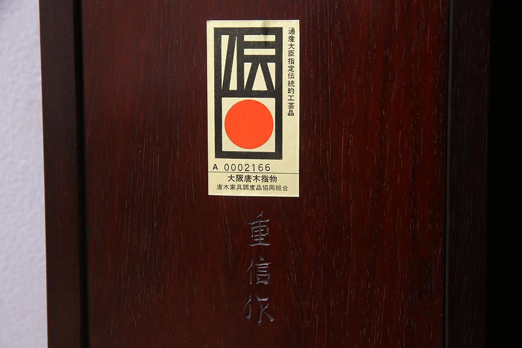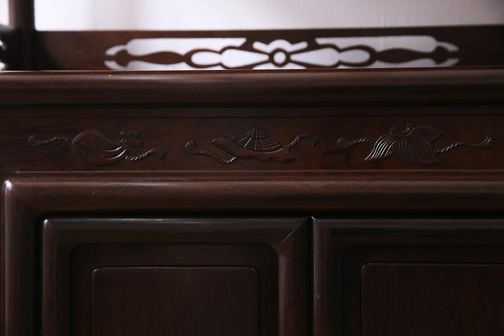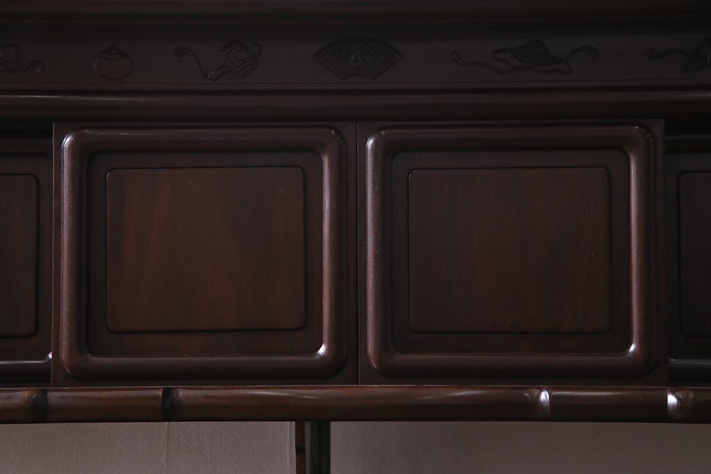 和箪笥> 茶箪笥・茶棚 > 中古 伝統工芸品 大阪唐木指物 在銘 紫檀(シタン)材 漆塗り 縁起物の彫りが目を引く飾り棚(違い棚、茶棚)(R-037558)