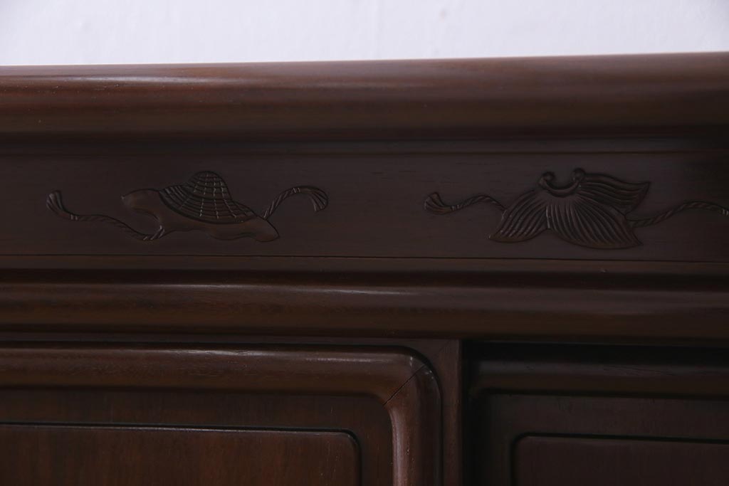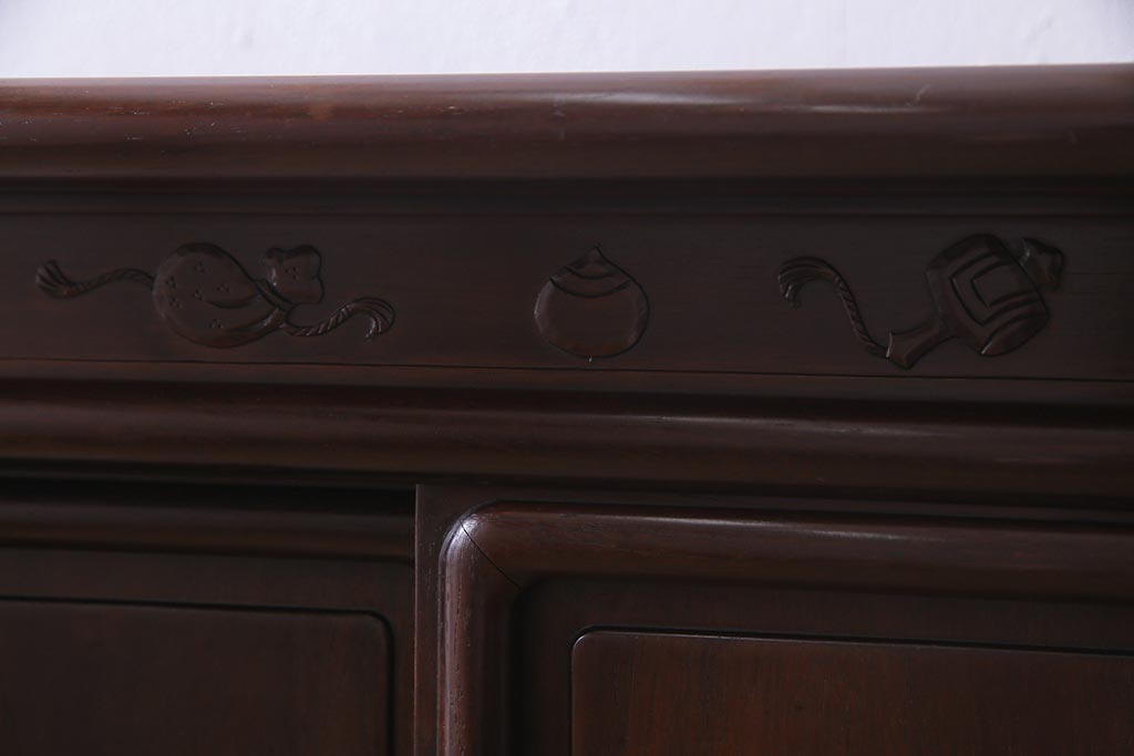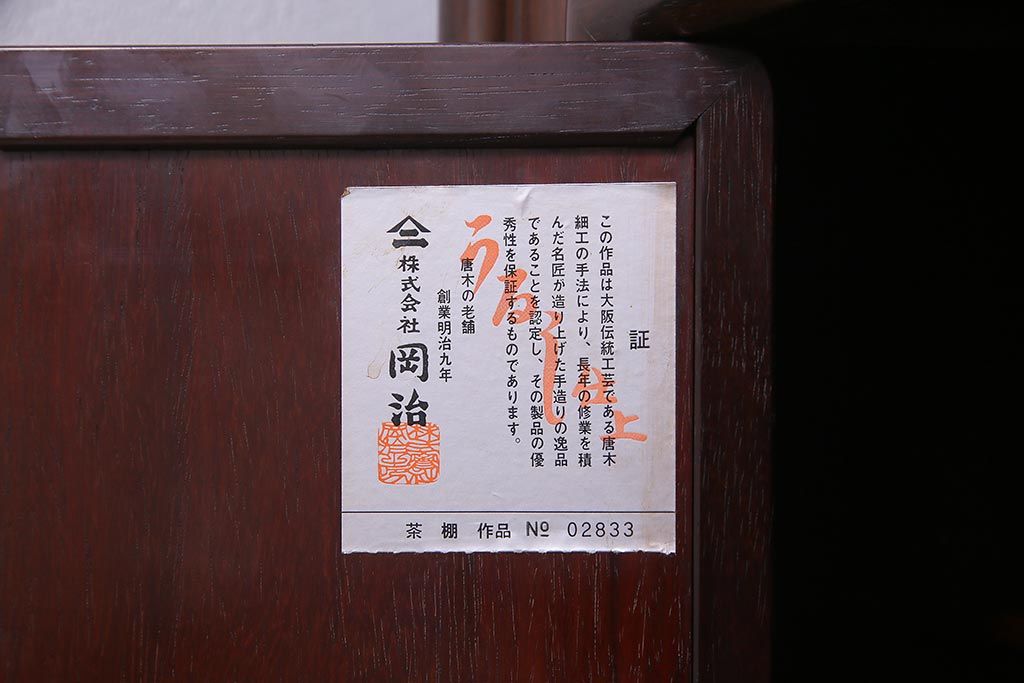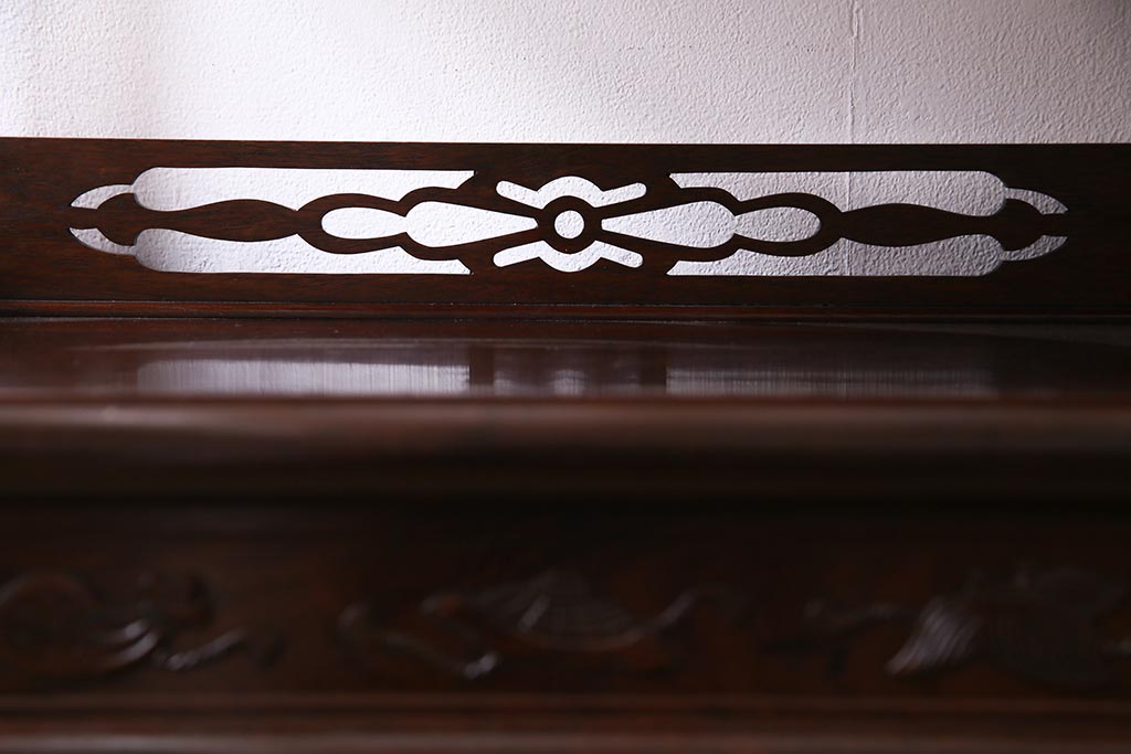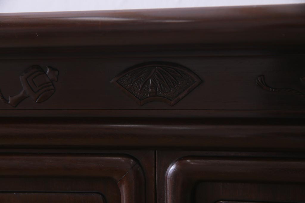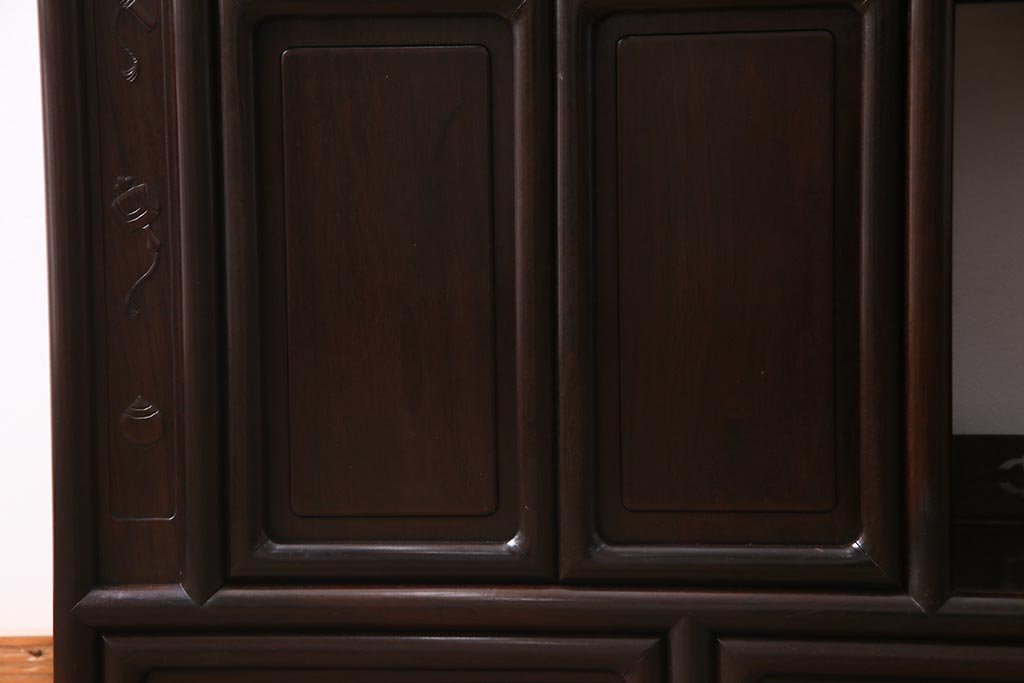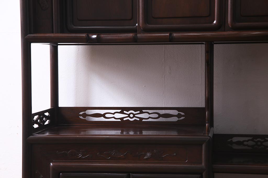 和箪笥 > 中古 伝統工芸品 大阪唐木指物 在銘 紫檀(シタン)材 漆塗り 縁起物の彫りが目を引く飾り棚(違い棚、茶棚)(R-037558)