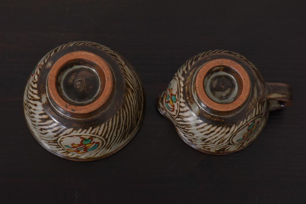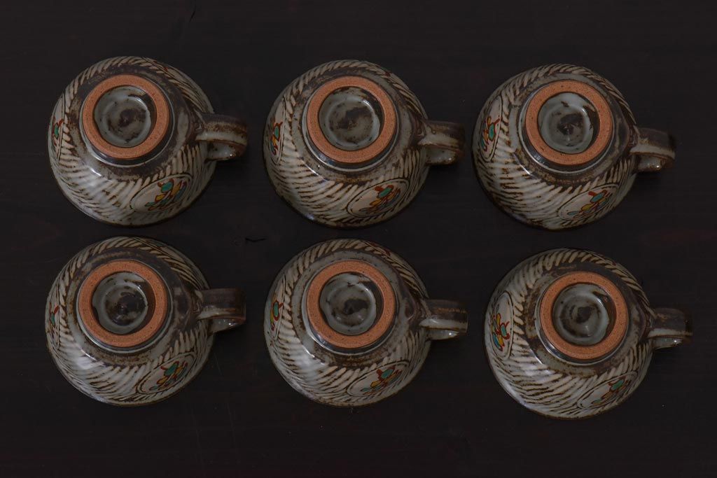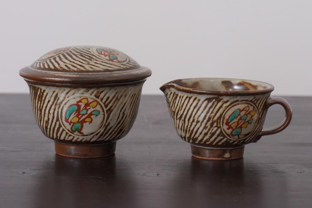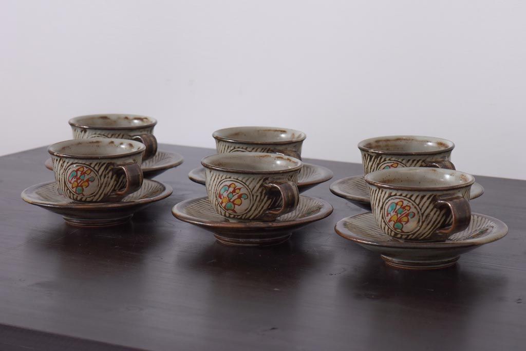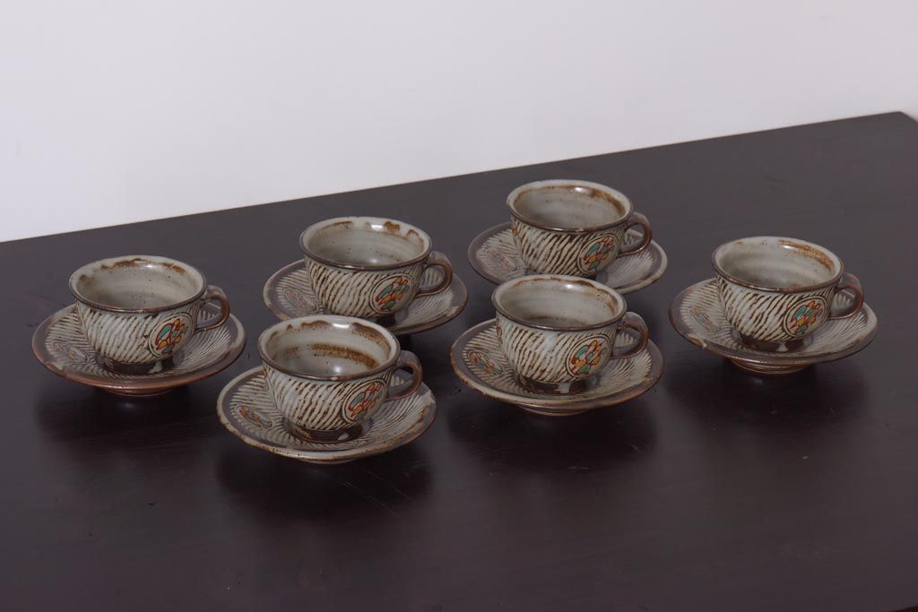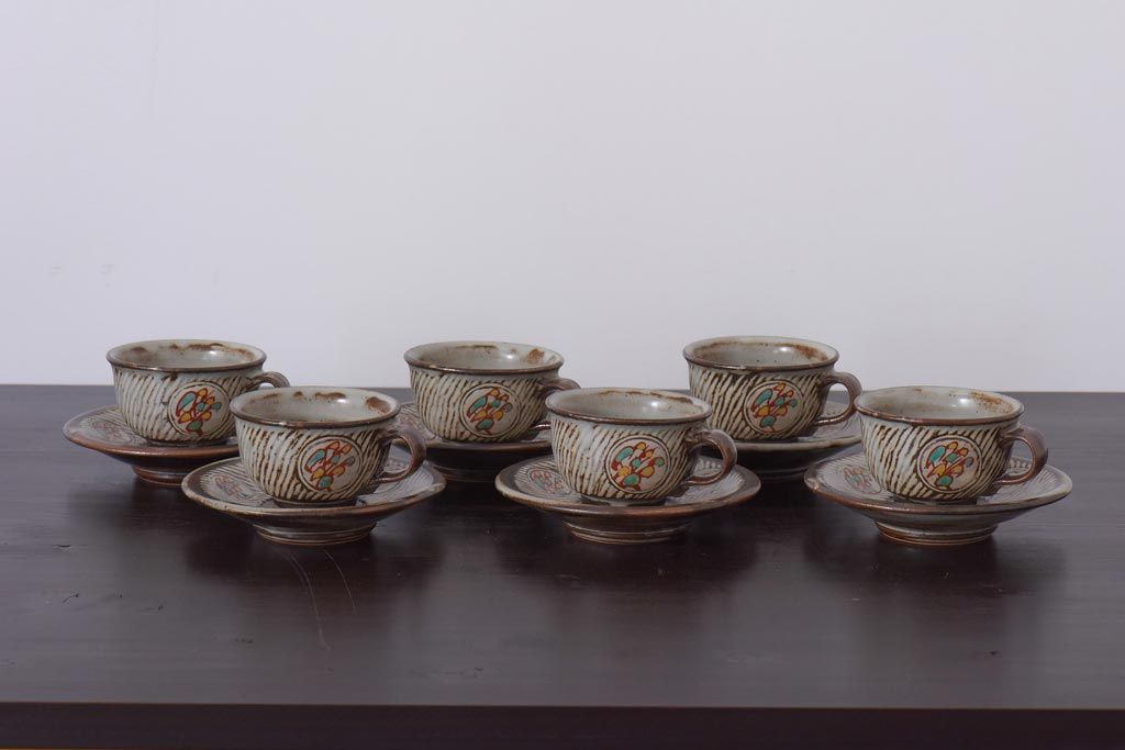 人間国宝 島岡達三 象嵌赤絵 草花文コーヒーセット(カップ&ソーサー、クリーマー、シュガーポット)