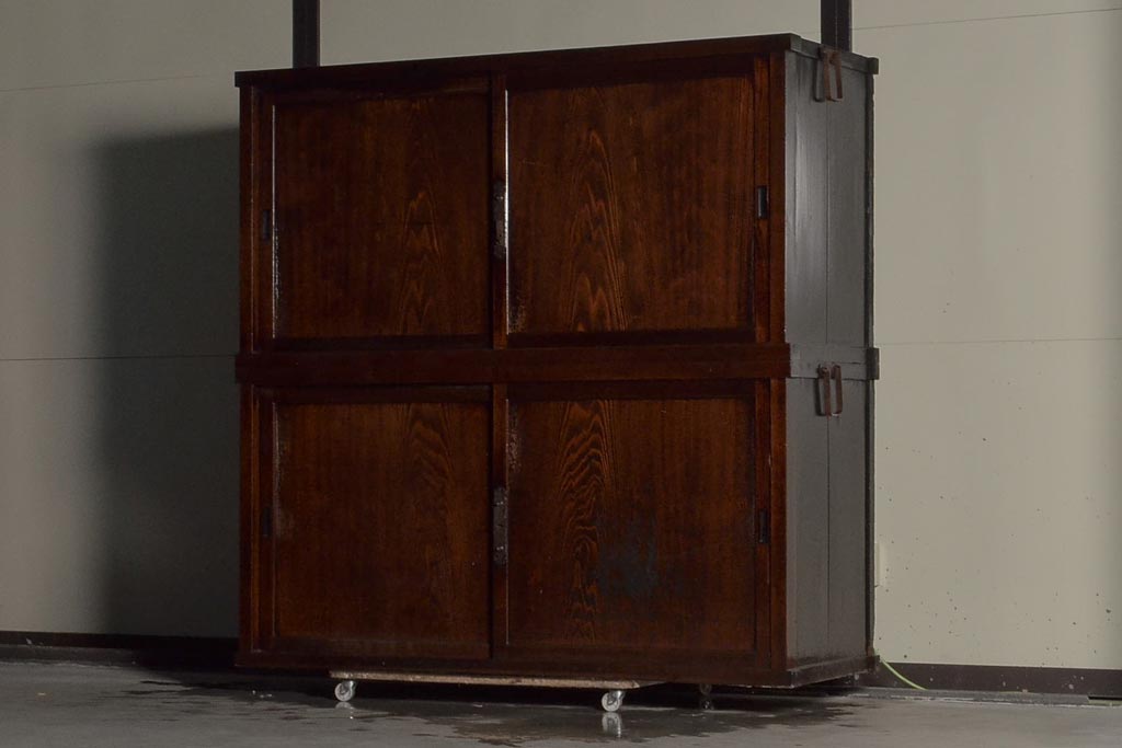キャビネット・戸棚> 食器棚・カップボード > 和製アンティーク 木製引き戸のシンプルな収納箪笥キャビネット(収納棚、夜具箪笥、布団箪笥、収納箪笥、戸棚)(R-036603)