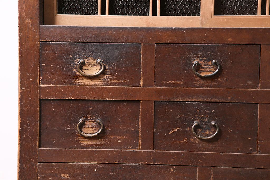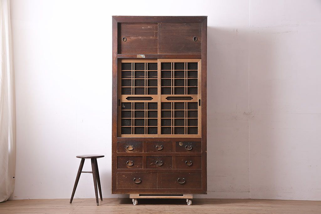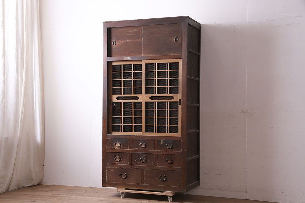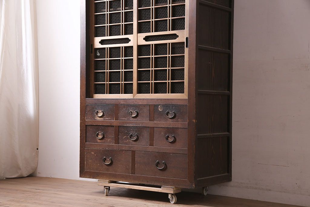 ラフジュ工房> 和箪笥> 水屋箪笥 > アンティーク家具 大正昭和初期 レアデザイン!マス目格子の水屋キャビネット(戸棚、茶箪笥)(R-036617)