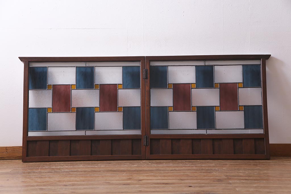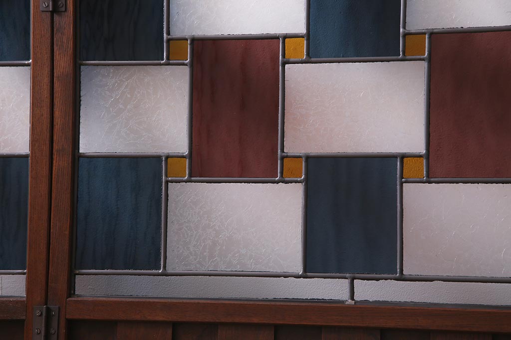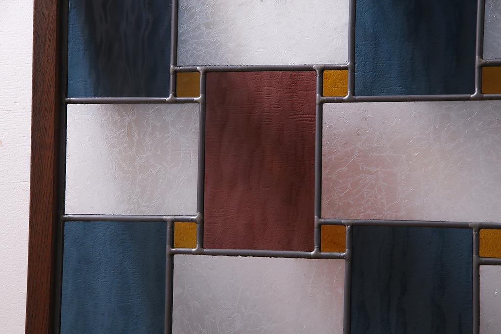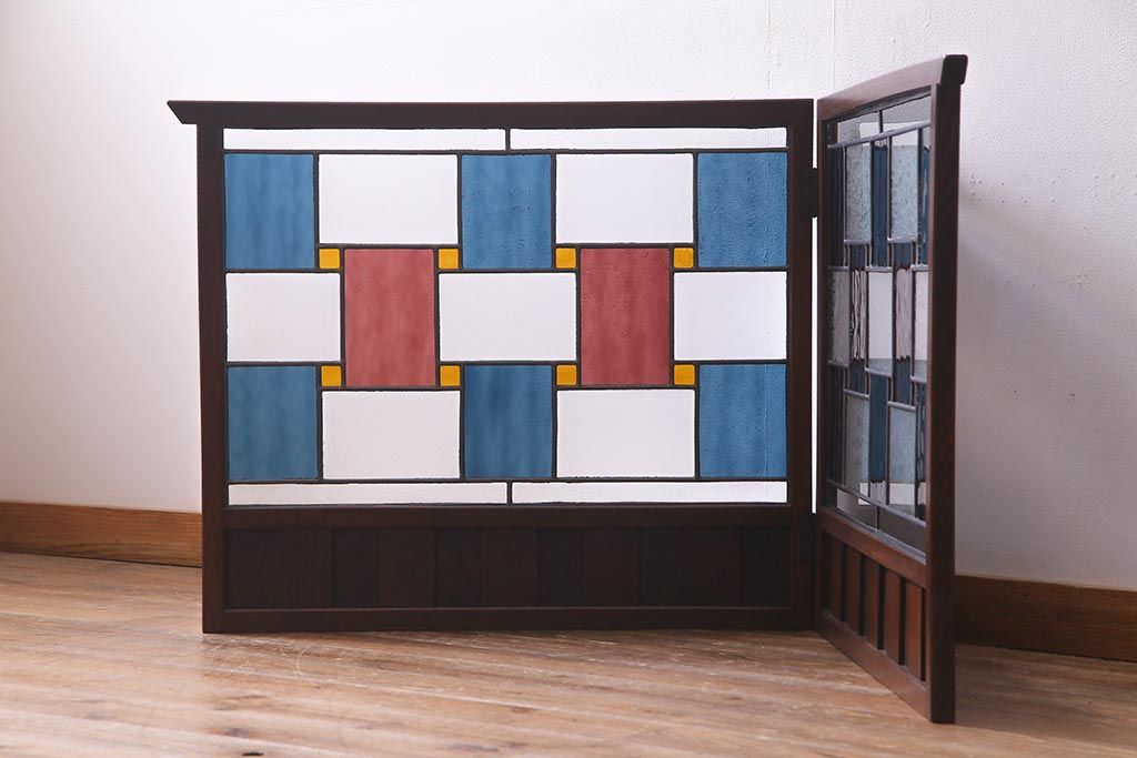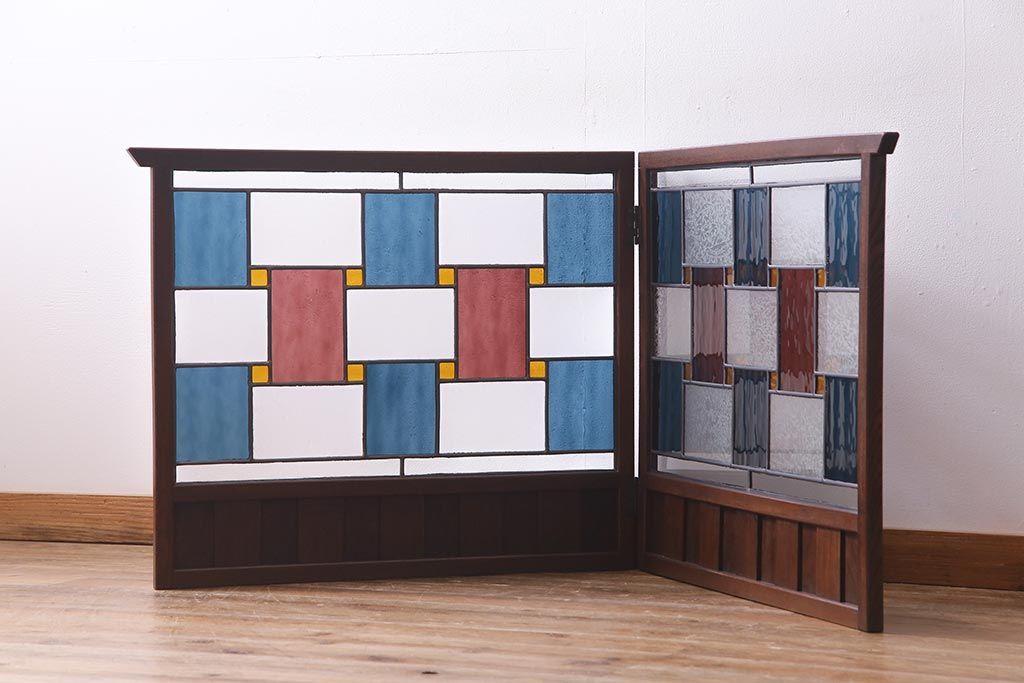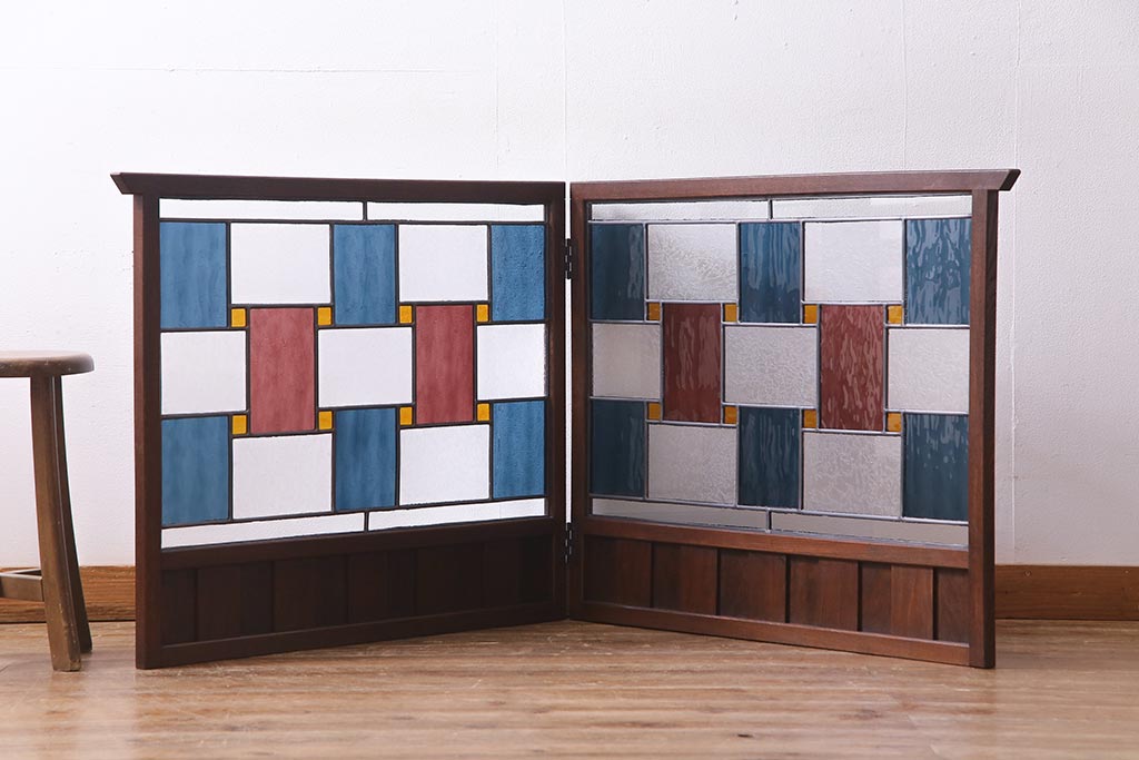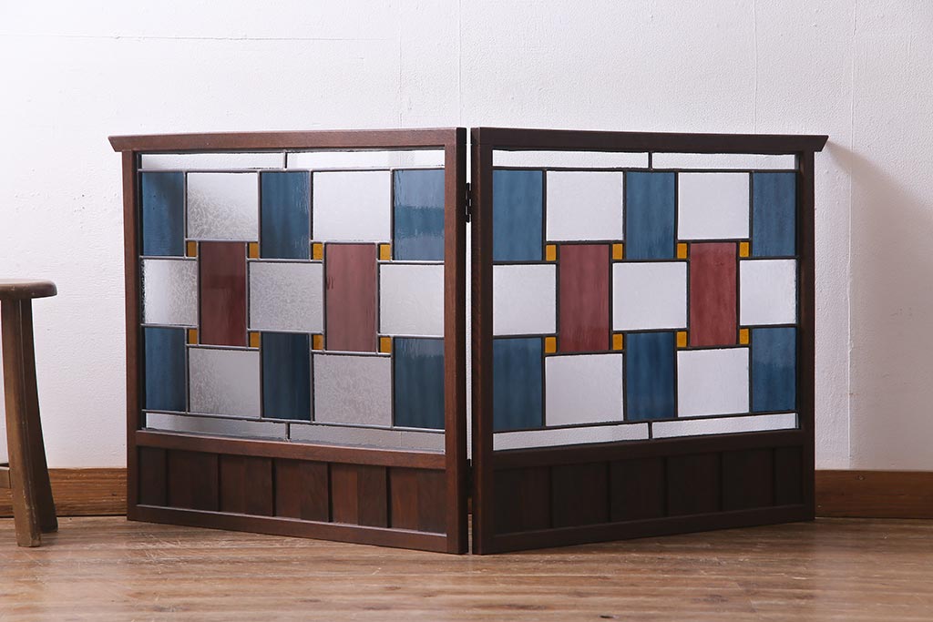 衝立・パーテーション > アンティーク建具 ラフジュ工房オリジナルステンドグラス 明治大正期 総ケヤキ材 色ガラス・結霜ガラス入り レトロモダンなステンドグラスのリメイクパーテーション(衝立)(R-037593)