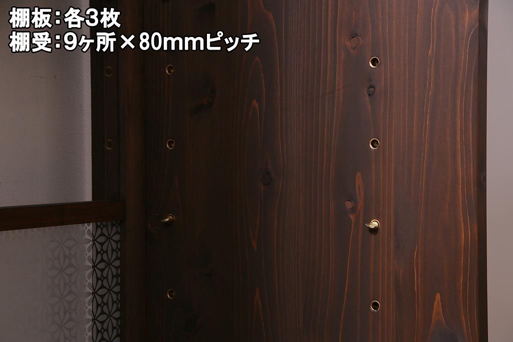 棚板は取り外しできます。棚板は各3枚あります。棚受けは9ヶ所、80mmピッチで調整できます。棚幅サイズのものが1枚の作りです。