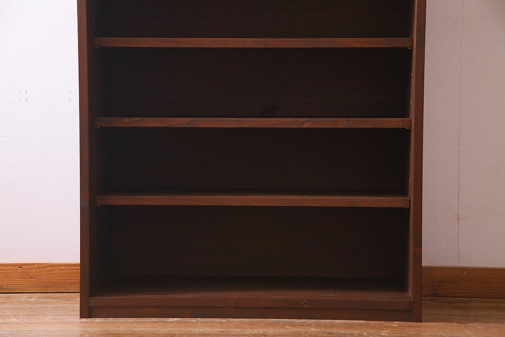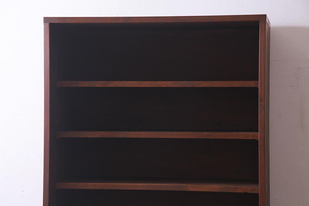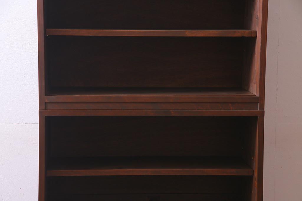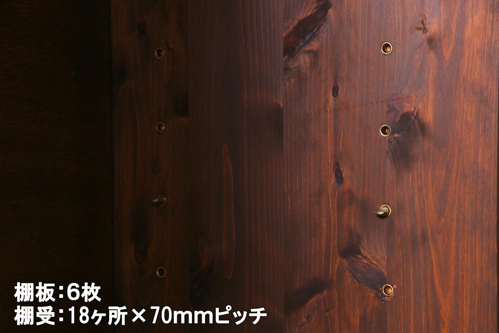 棚板は取り外しできます。棚板は3枚あります。棚受けは9ヶ所、70mmピッチで調整できます。棚幅サイズのものが1枚の作りです。