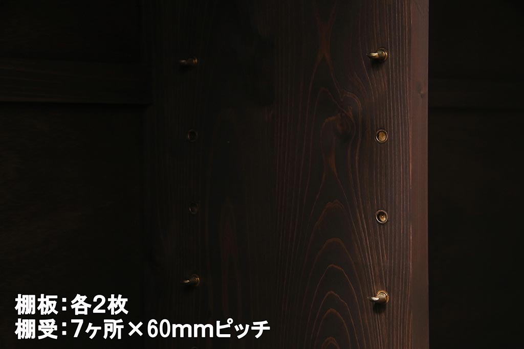 棚板は取り外しできます。棚板は左右各2枚あります。棚受けは7ヶ所、60mmピッチで調整できます。棚幅サイズのものが1枚の作りです。