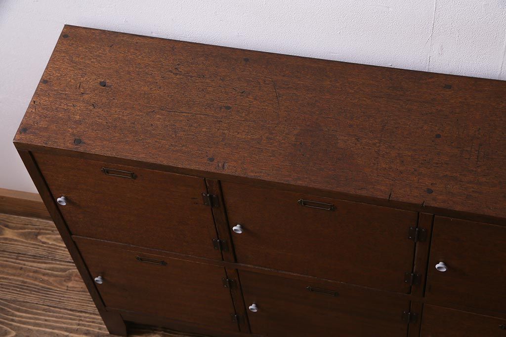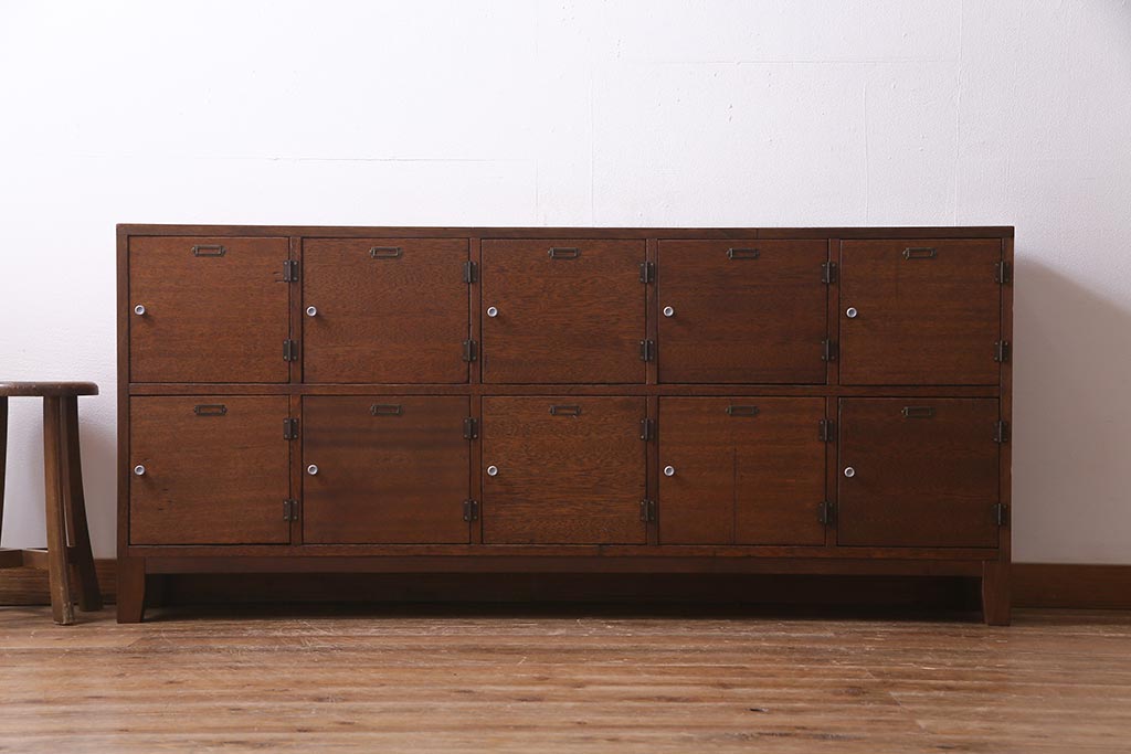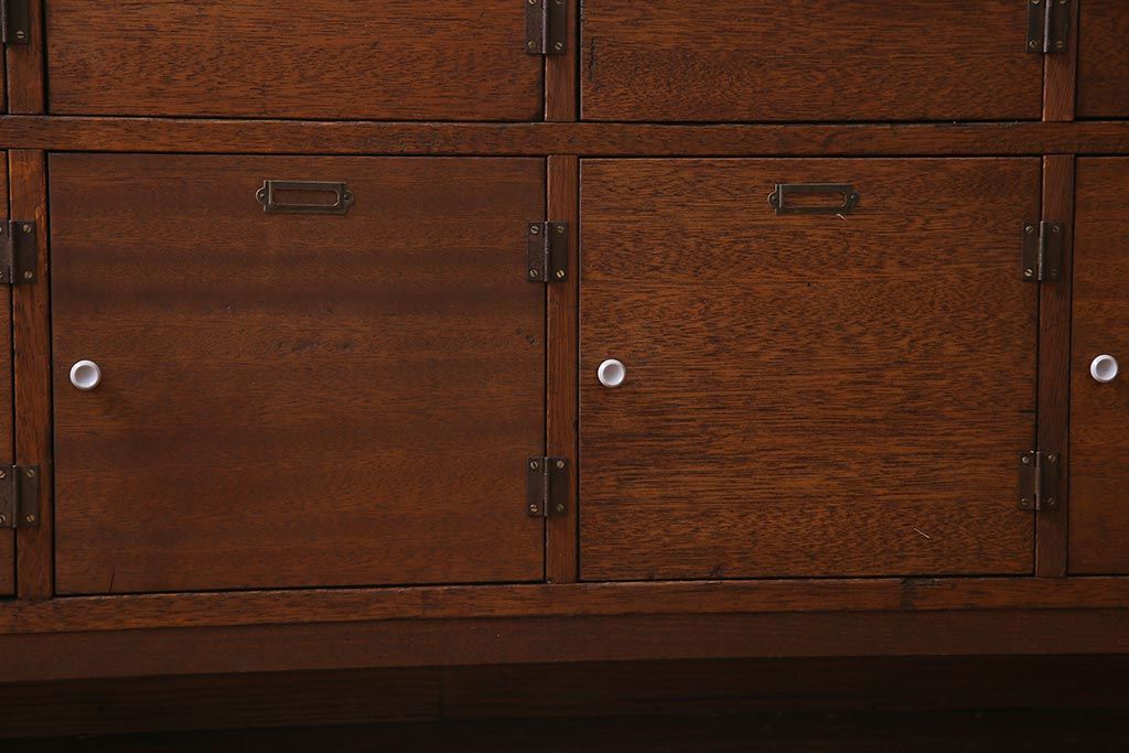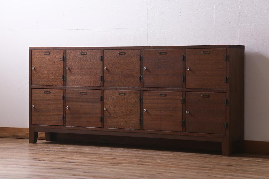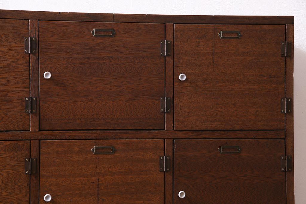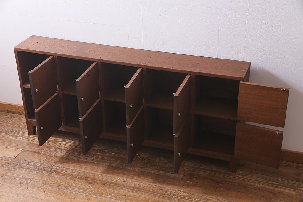レトロ家具 木製脚付き レトロやナチュラルインテリアにぴったりなネームプレート付きの横型ロッカー(マス目戸棚)(R-037594)