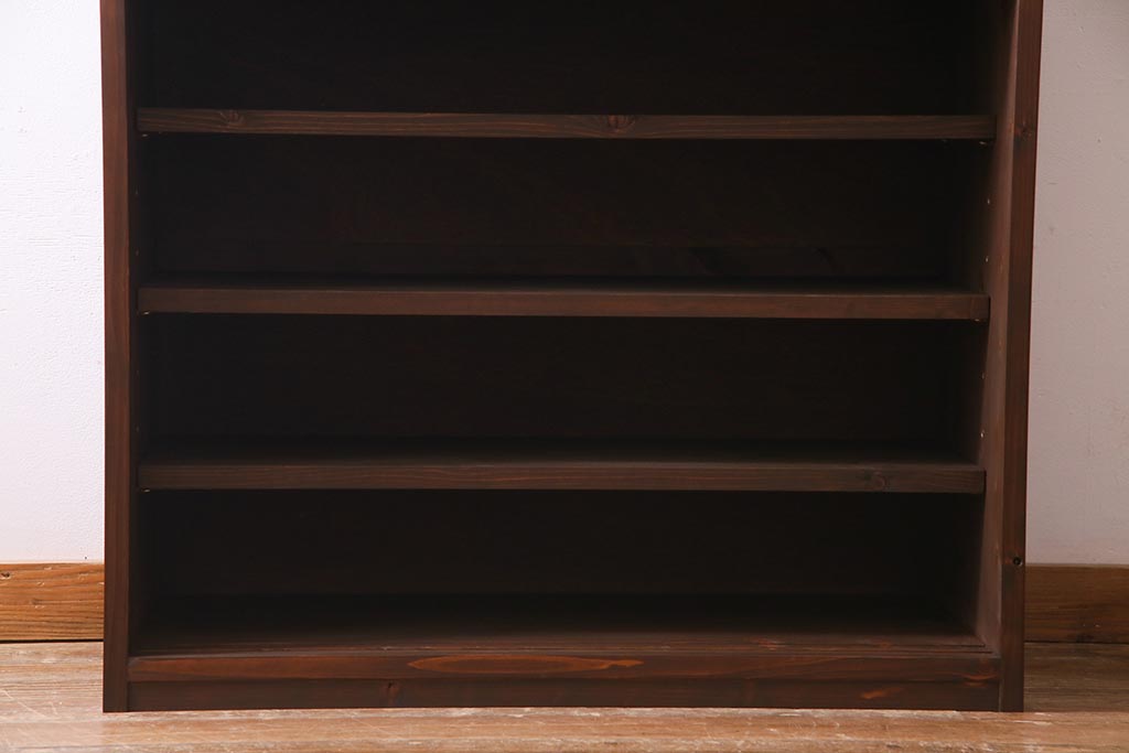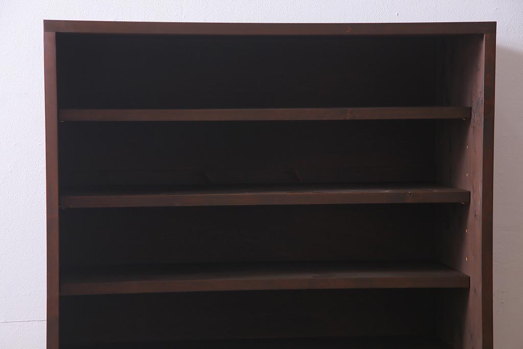 棚板は取り外しできます。棚板は各3枚あります。棚受けは各7ヶ所、60mmピッチで調整できます。棚幅サイズのものが1枚の作りです。