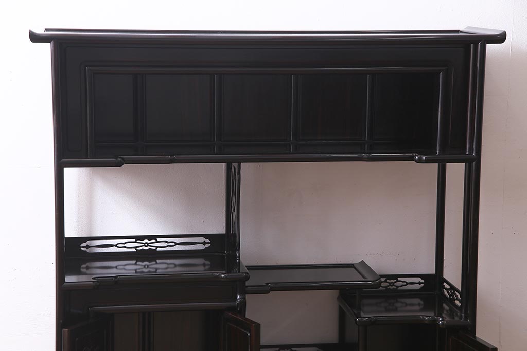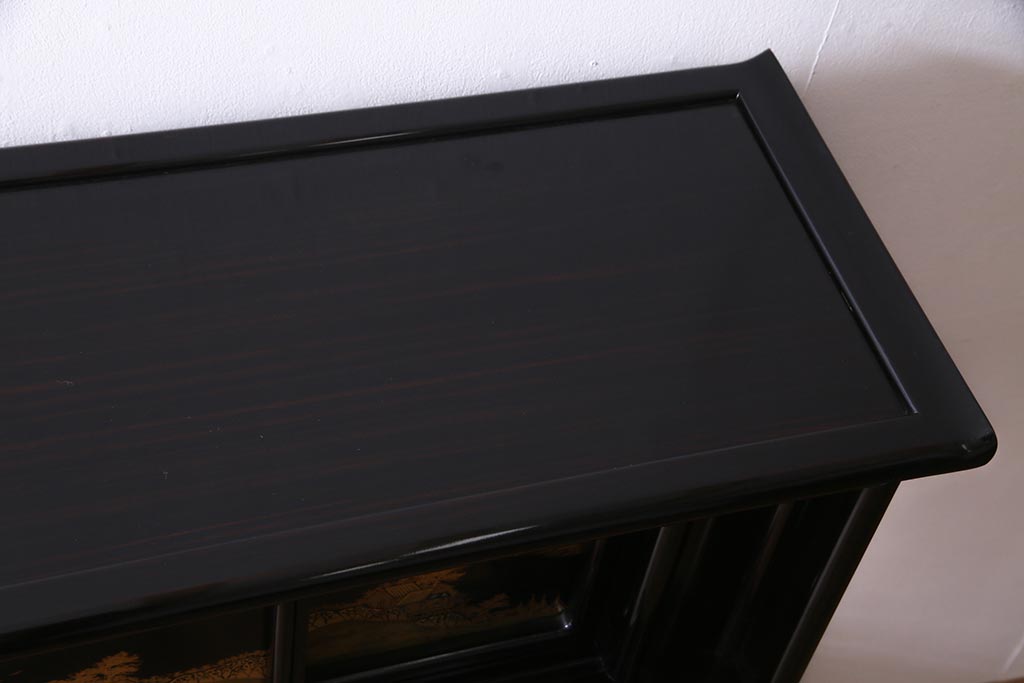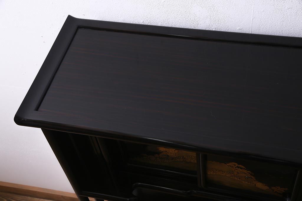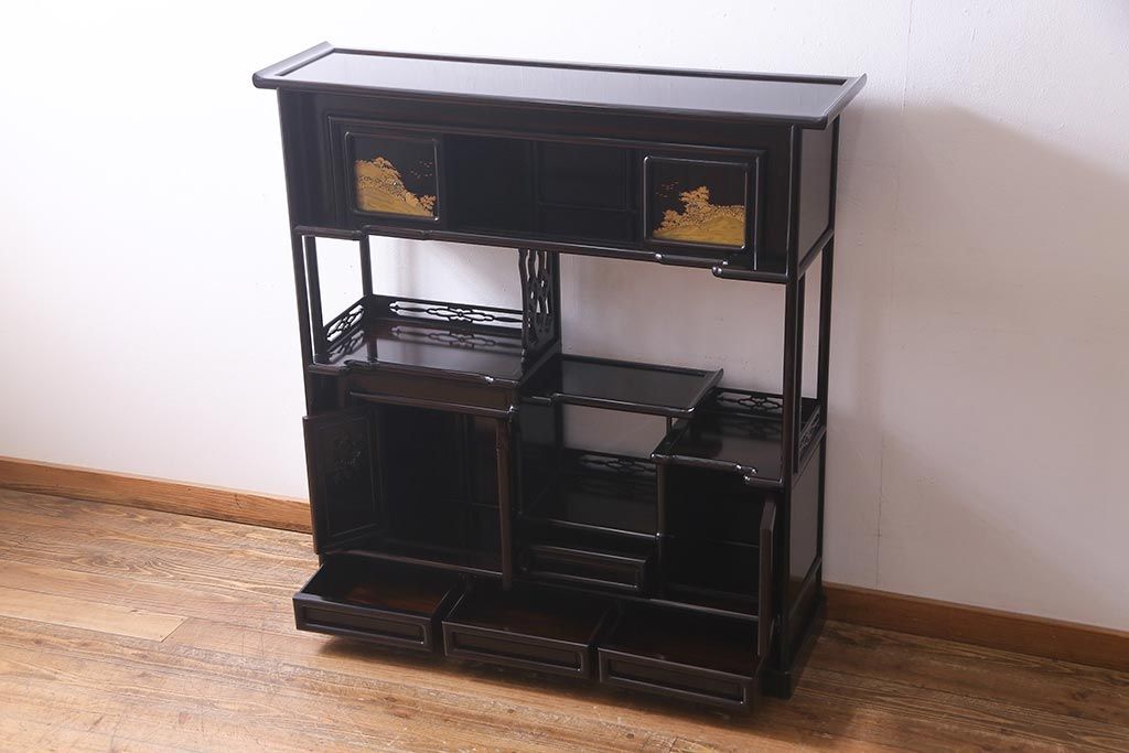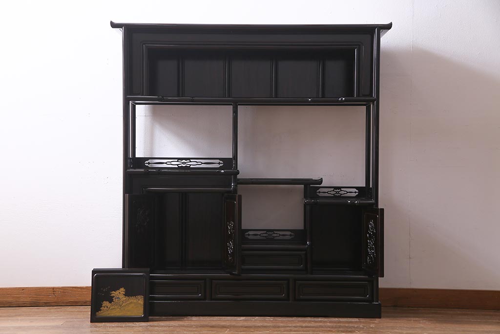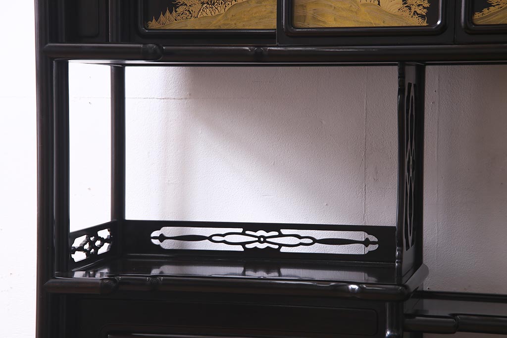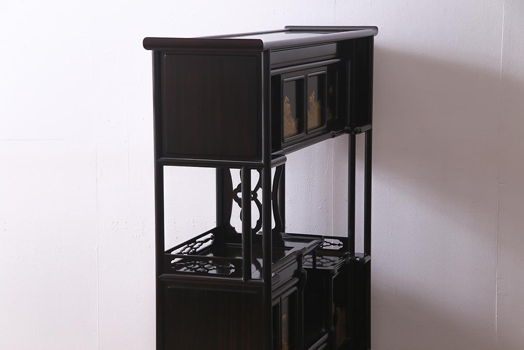 和箪笥> 茶箪笥・茶棚 > 中古 民芸家具 和製 唐木 縞黒檀材 蒔絵と螺鈿の細工が高級感を放つ茶棚(違い棚、収納棚、飾り棚)(R-037648)