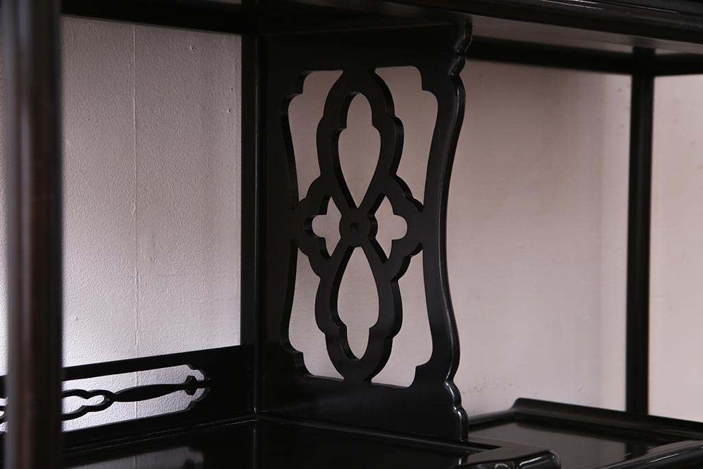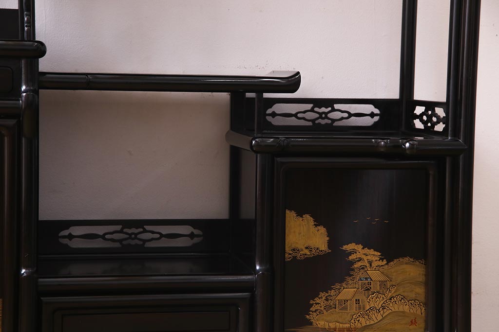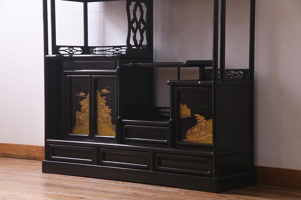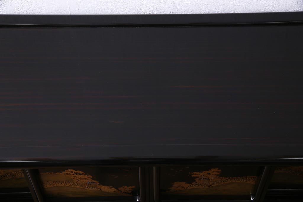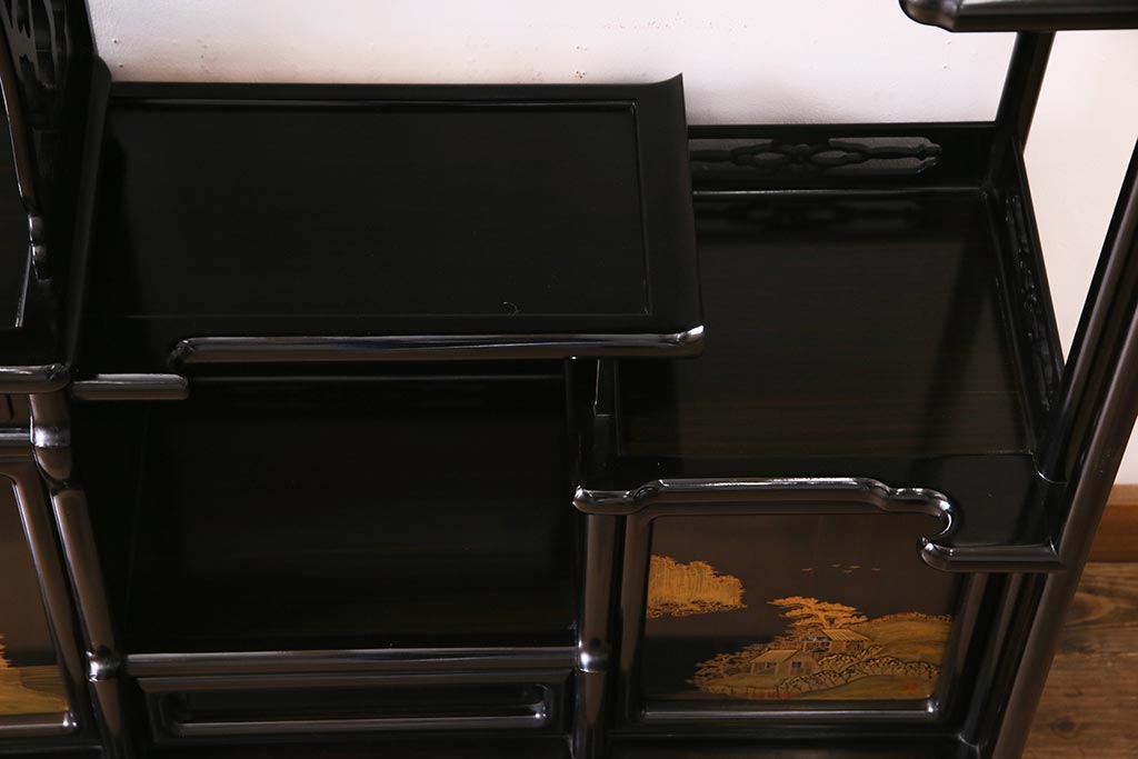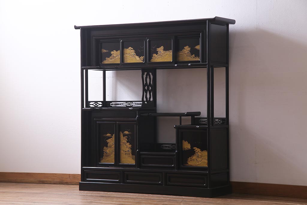 和箪笥> 茶箪笥・茶棚 > 中古 民芸家具 和製 唐木 縞黒檀材 蒔絵と螺鈿の細工が高級感を放つ茶棚(違い棚、収納棚、飾り棚)(R-037648)