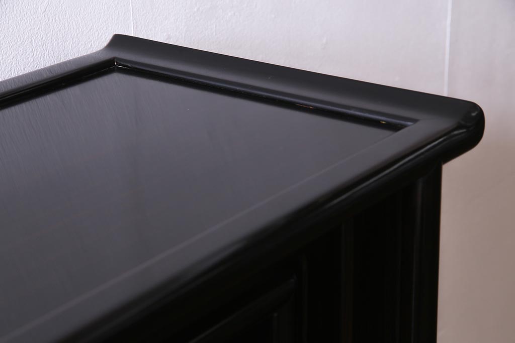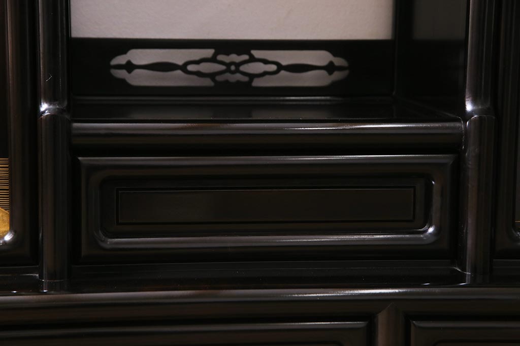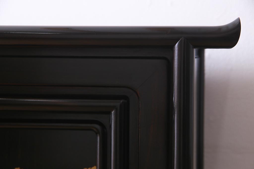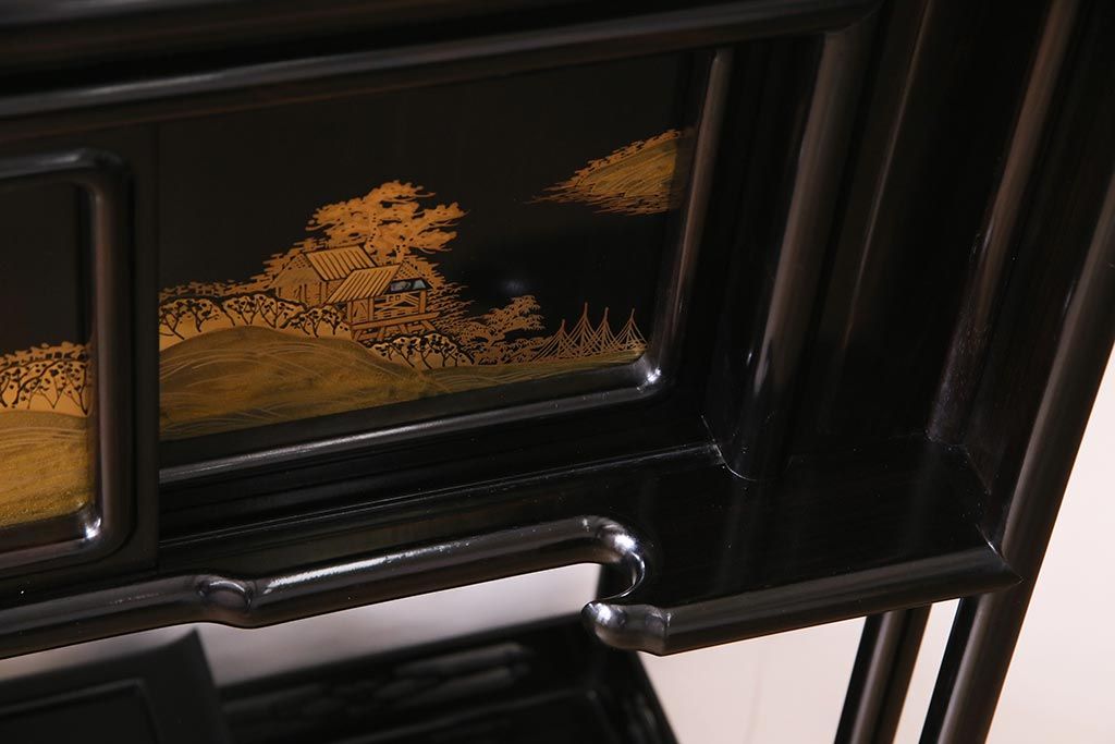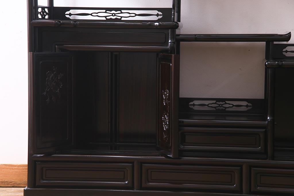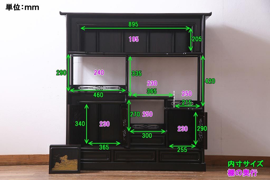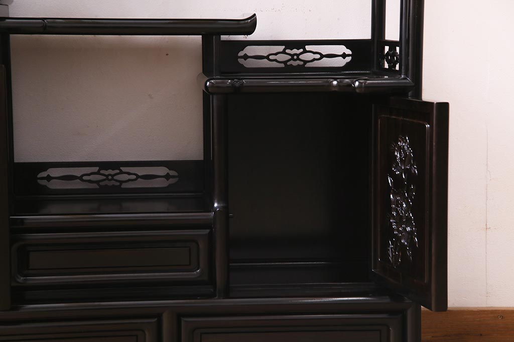 和箪笥> 茶箪笥・茶棚 > 中古 民芸家具 和製 唐木 縞黒檀材 蒔絵と螺鈿の細工が高級感を放つ茶棚(違い棚、収納棚、飾り棚)(R-037648)