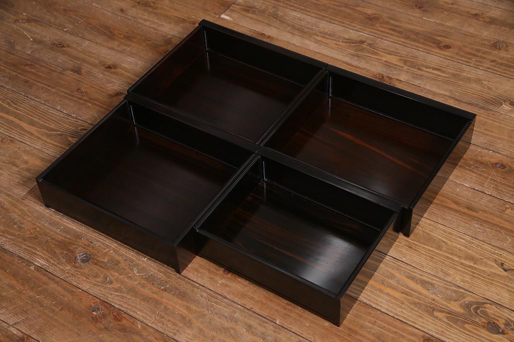 中古 民芸家具 和製 唐木 縞黒檀材 蒔絵と螺鈿の細工が高級感を放つ茶棚(違い棚、収納棚、飾り棚)(R-037648)です。