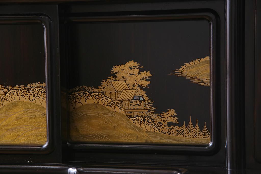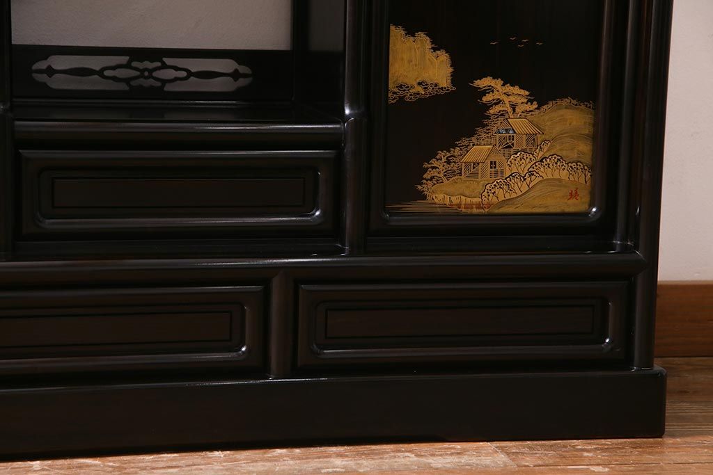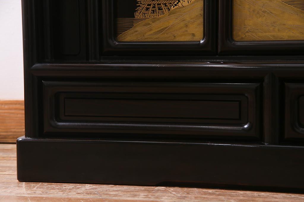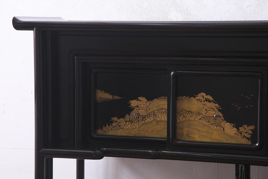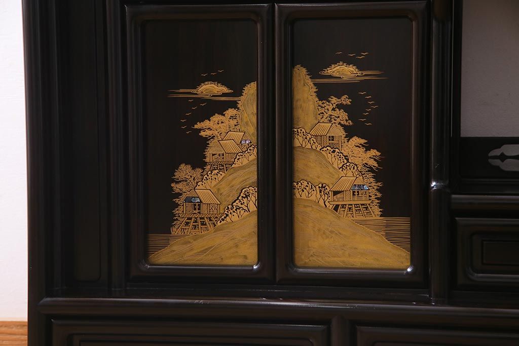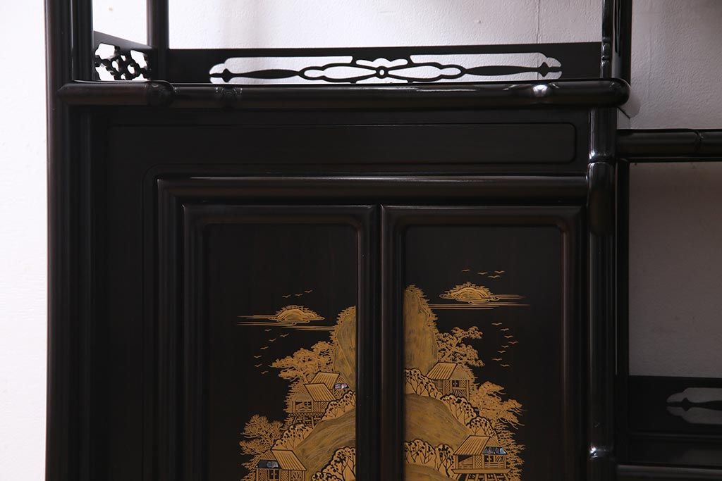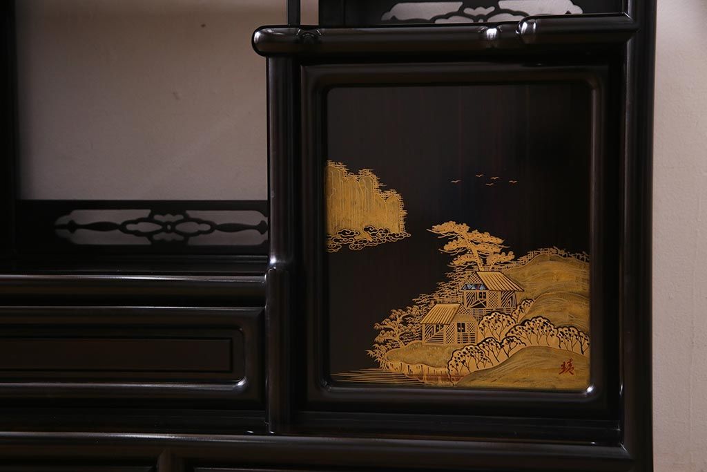 民芸家具 > 中古 民芸家具 和製 唐木 縞黒檀材 蒔絵と螺鈿の細工が高級感を放つ茶棚(違い棚、収納棚、飾り棚)(R-037648)