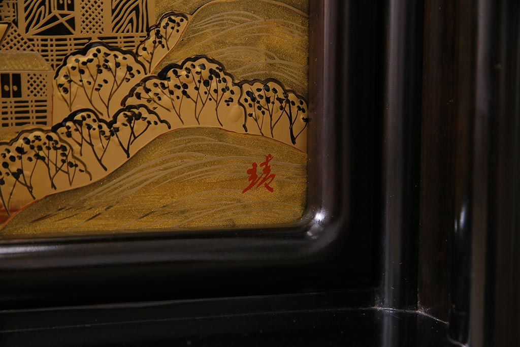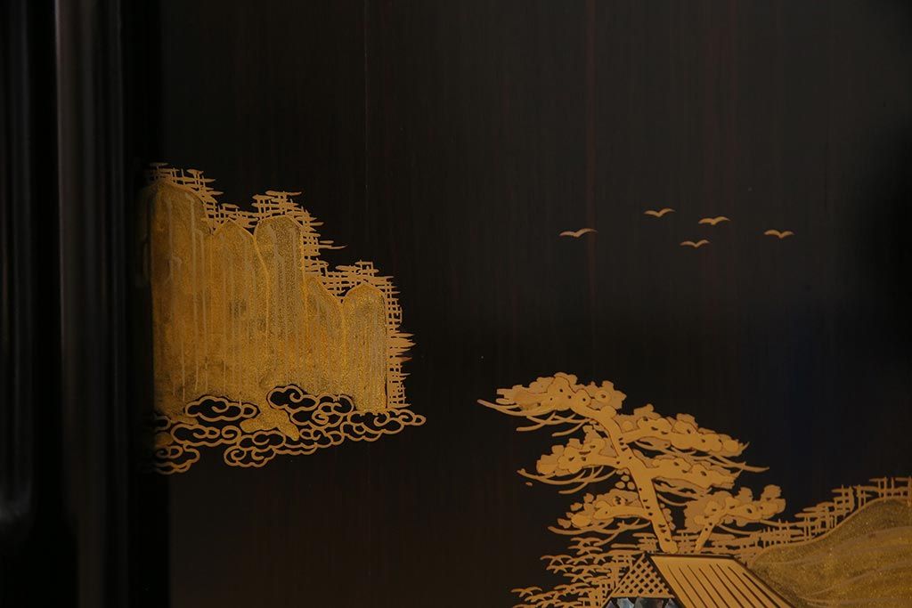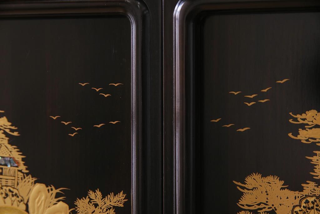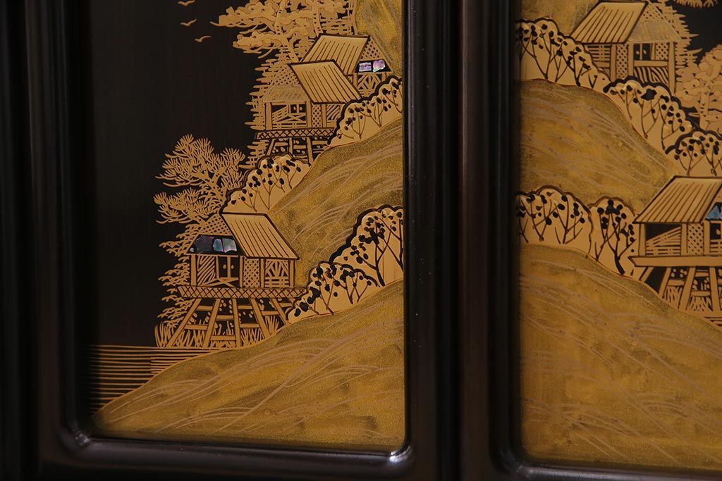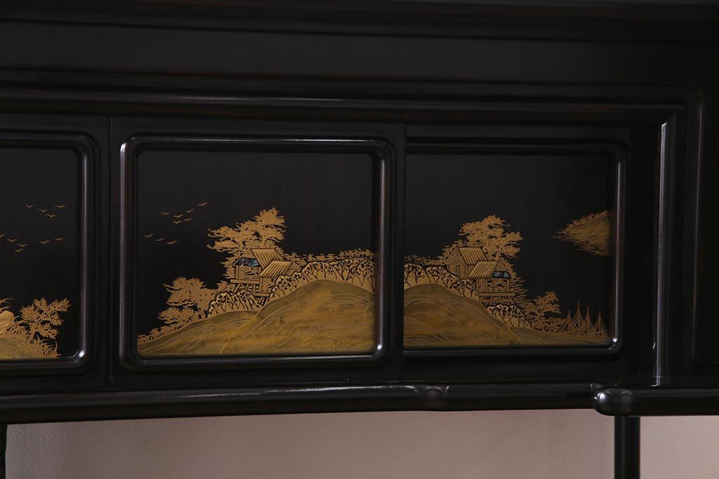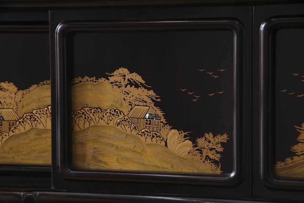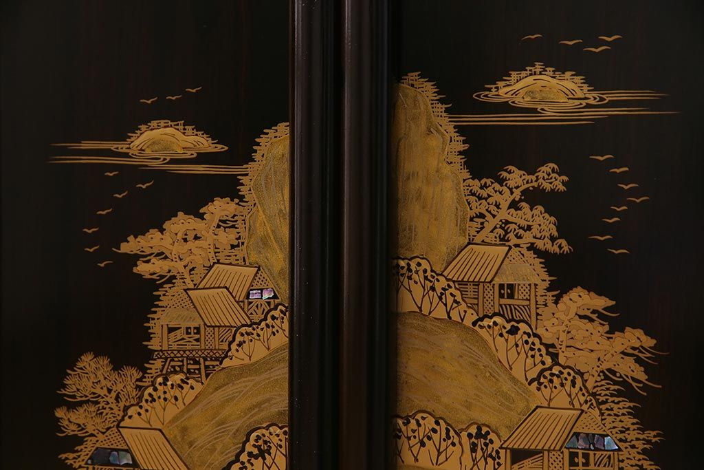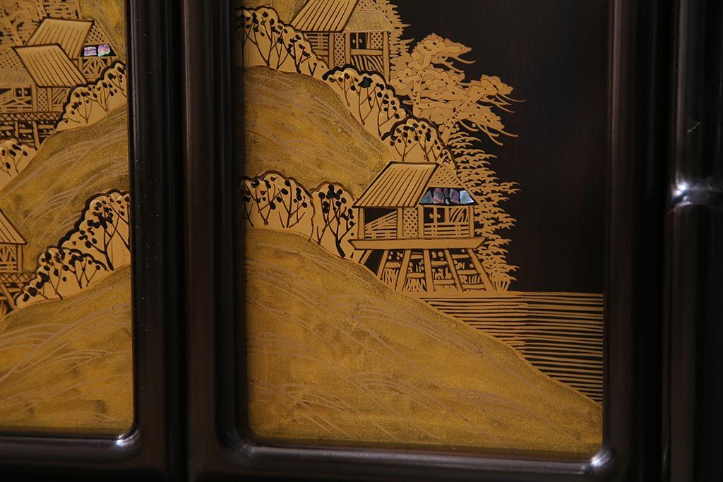 民芸家具 > 中古 民芸家具 和製 唐木 縞黒檀材 蒔絵と螺鈿の細工が高級感を放つ茶棚(違い棚、収納棚、飾り棚)(R-037648)