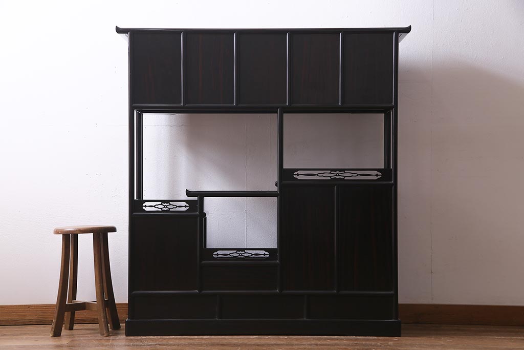 中古 民芸家具 和製 唐木 縞黒檀材 蒔絵と螺鈿の細工が高級感を放つ茶棚(違い棚、収納棚、飾り棚)(R-037648)