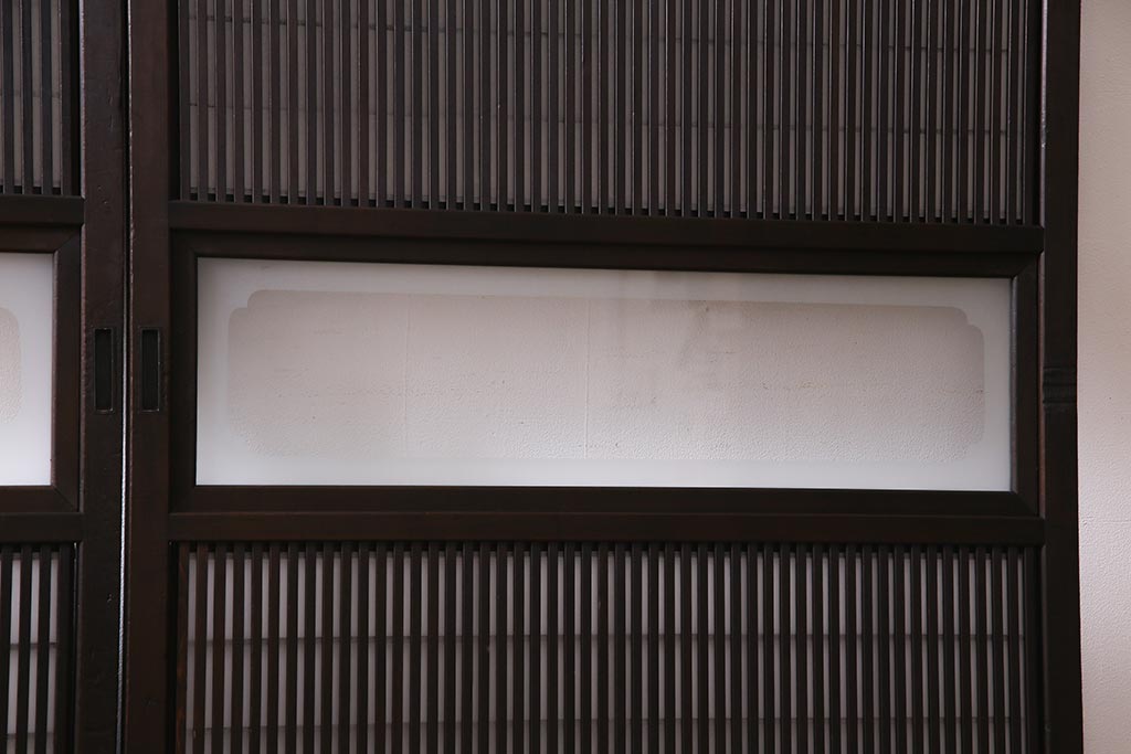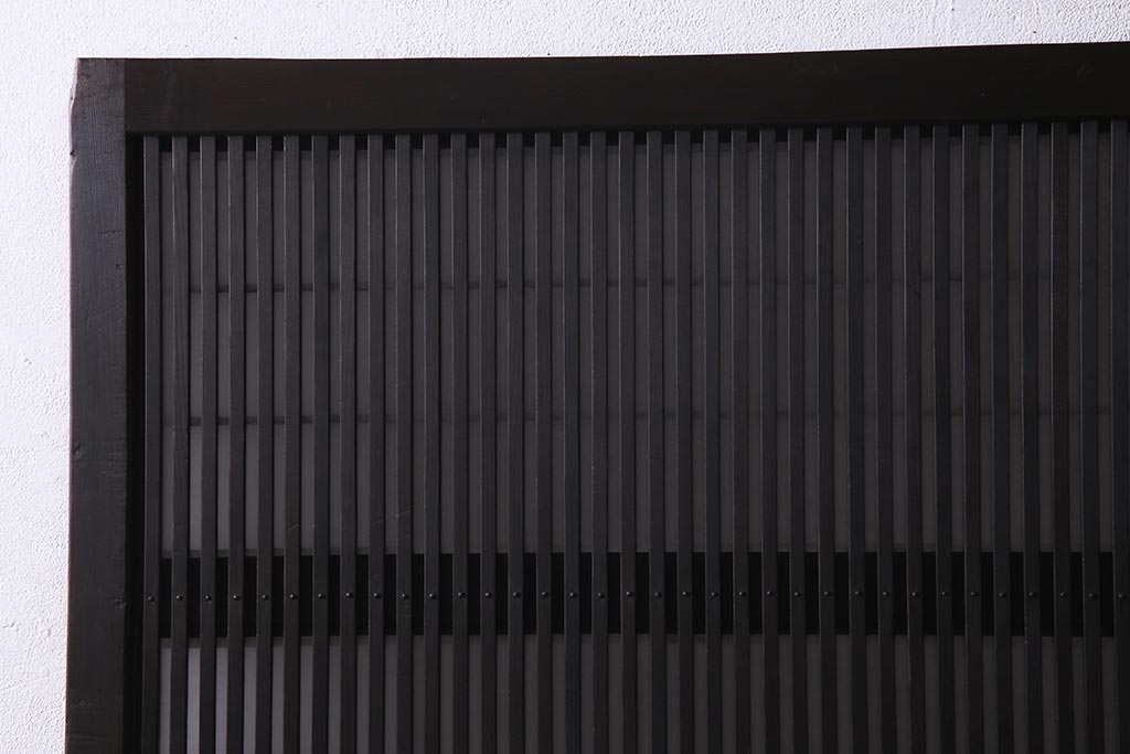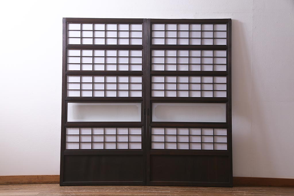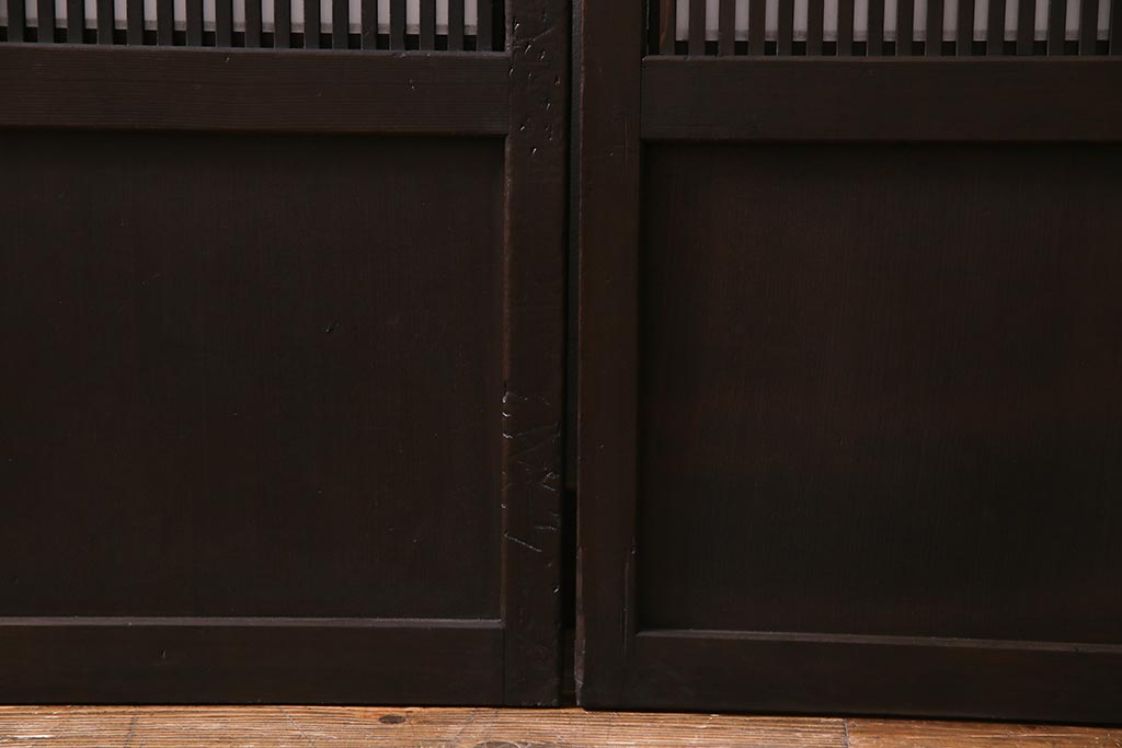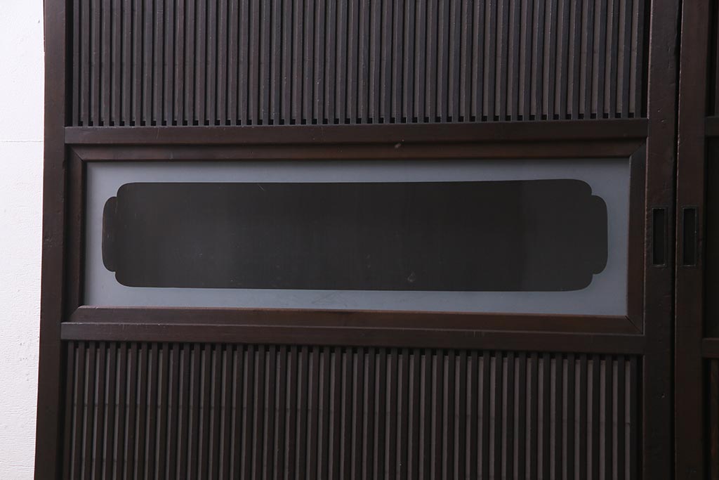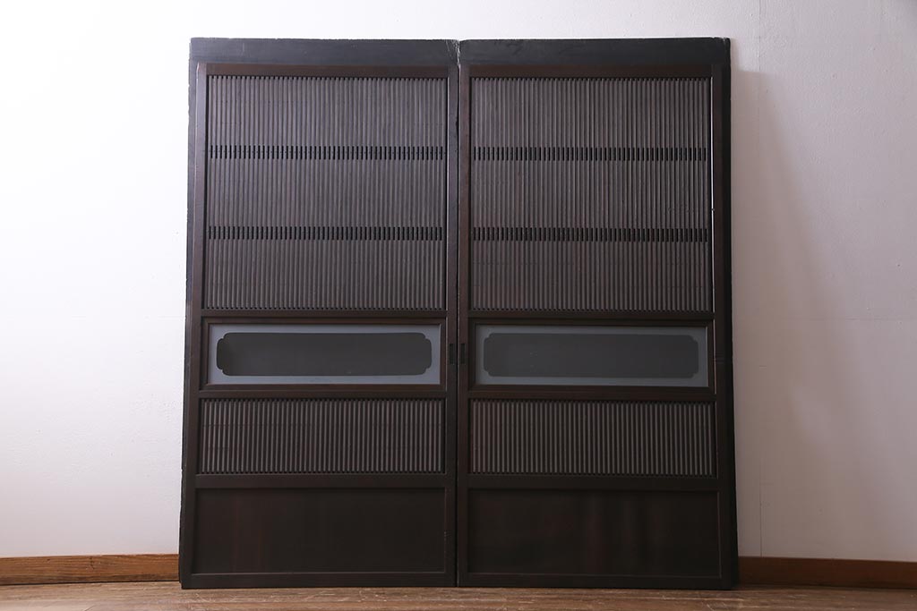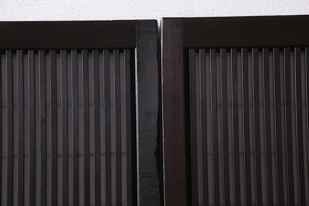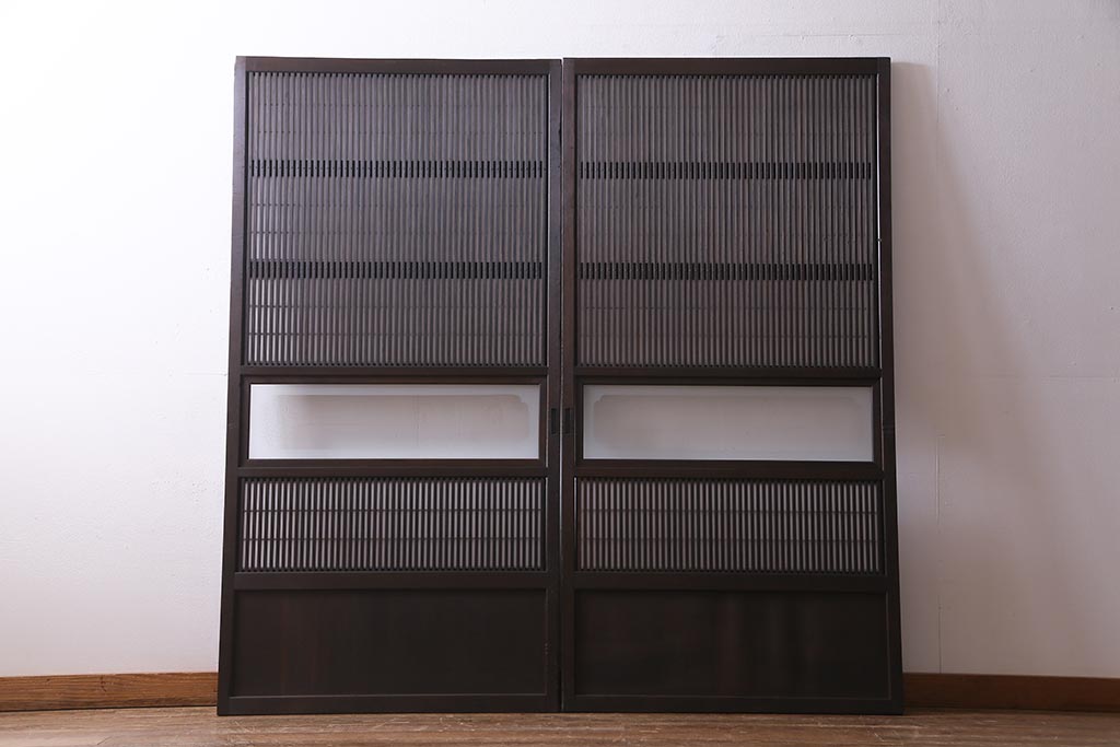 ドア・建具> 障子戸 > アンティーク建具 和製アンティーク 大正昭和初期 裏障子付き ガラス入り 縦格子が美しいシックでモダンな雰囲気の格子戸2枚セット(引き戸、障子戸、建具)(R-037745)